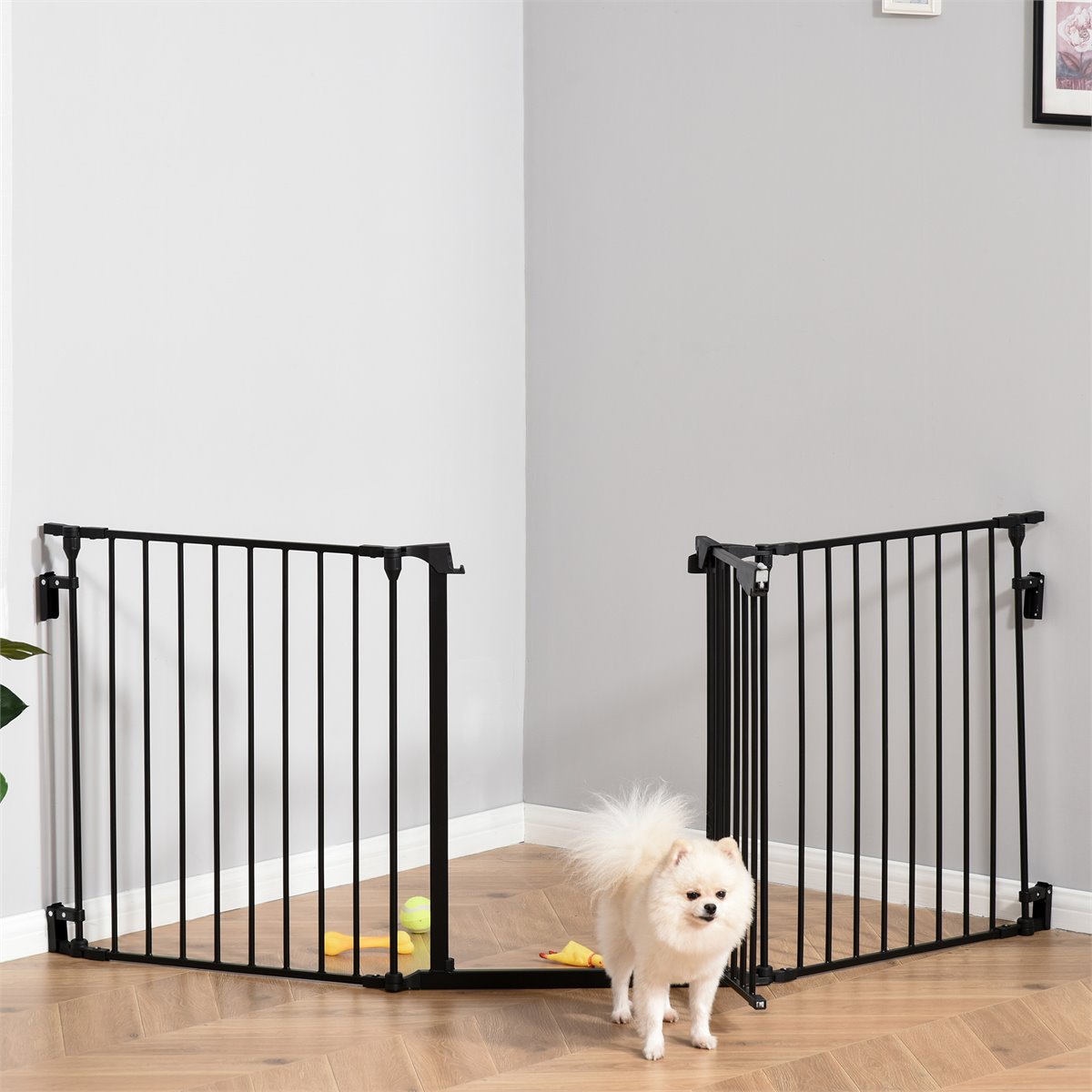 Si tienes mascotas en casa y quieres limitar su espacio o protegerlas de las escaleras, esta barrera para mascotas de PawHut es ideal. Cuenta con una puerta bloqueable y con sistema de cierre automático. Es una puerta de seguridad muy fácil de montar a la pared, y te ahorrará tiempo y esfuerzo. Hecha de metal con recubrimiento en polvo, sin plomo y no tóxico, es resistente y duradera. Al ser plegable, podrás guardarla y transportar fácilmente cuando no vayas a usarla.