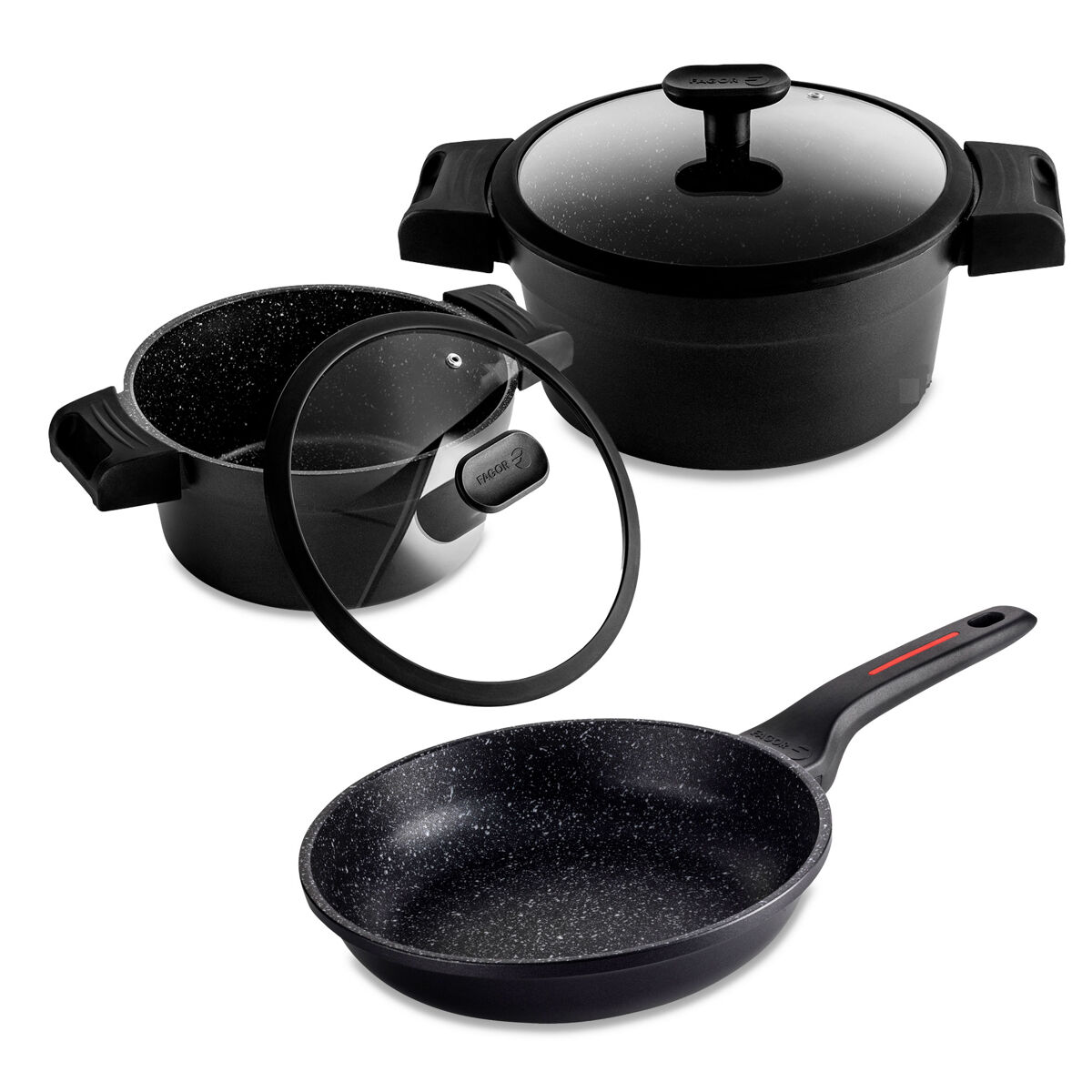 La batería de cocina Fagor Alutherm no solo te ayuda a cocinar tus alimentos, también reduce el tiempo de cocinado conservando la calidad de los alimentos y ahorrando energía.