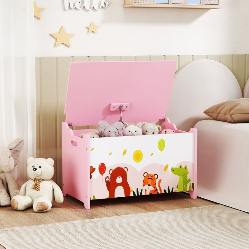 Este baúl juguetes infantil de AIYAPLAY es ideal para organizar juguetes, libros y ropa, manteniendo la habitación ordenada y sin desorden. Fabricado en MDF resistente y decorado con encantadores estampados de animales, soporta hasta 20 kg. La bisagra de seguridad evita que la tapa se cierre bruscamente, protegiendo los dedos de los niños, convirtiéndolo en una solución práctica, segura y decorativa para habitaciones, salas de juegos, guarderías o salones de estar.