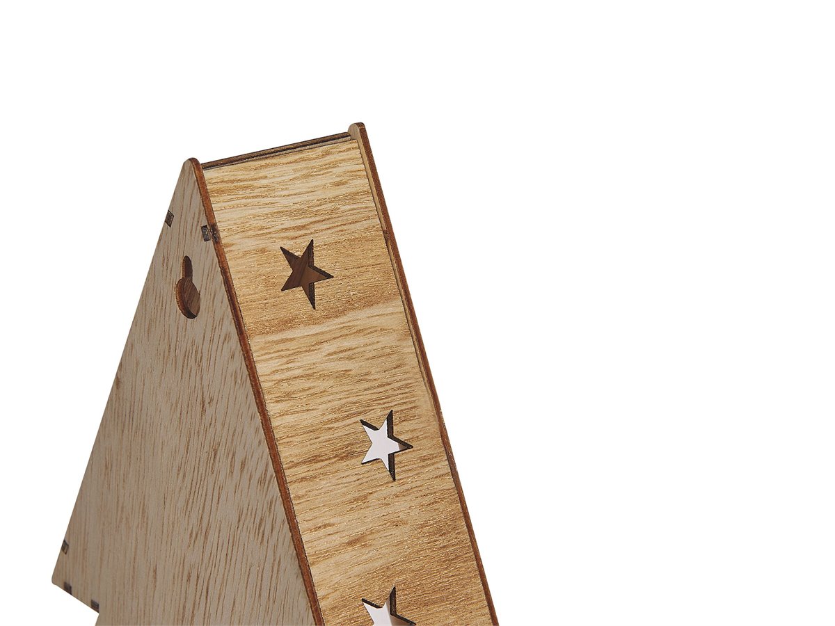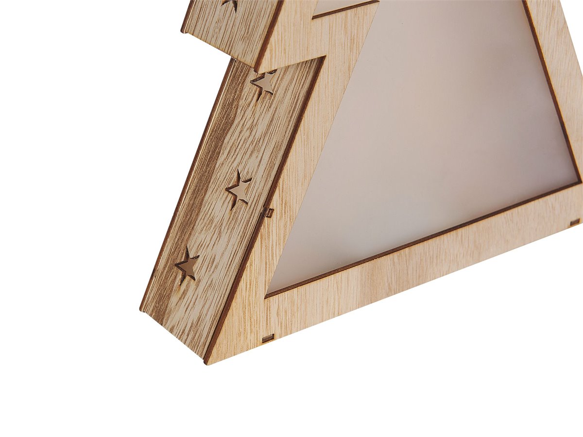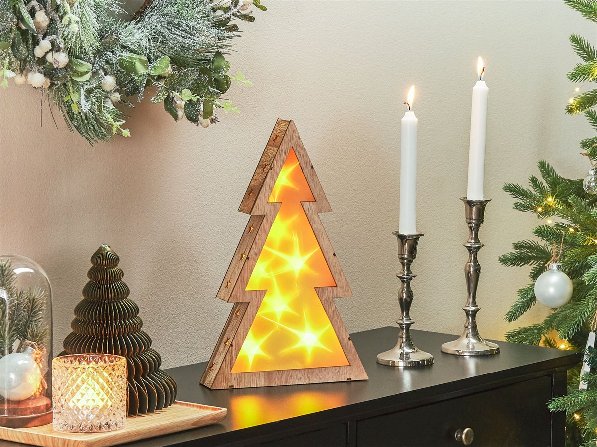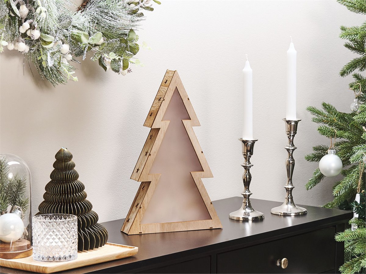Decoración navideña de madera. Esta decoración LED combina bien en cualquier sala de estar de diseño moderno. Está fabricada a partir de madera de álamo duradera y de alta calidad. La forma de árbol de Navidad y la iluminación LED llaman la atención de niños y adultos. La abertura incluida en la parte posterior permite colgarla en la pared. Combina bien situada sobre una estantería, cómoda o consola.