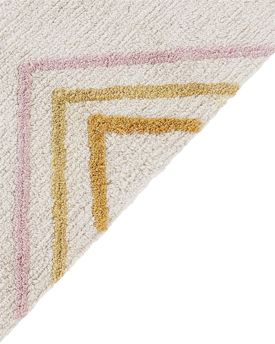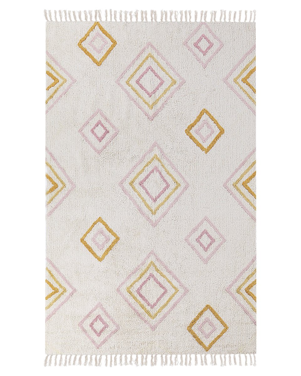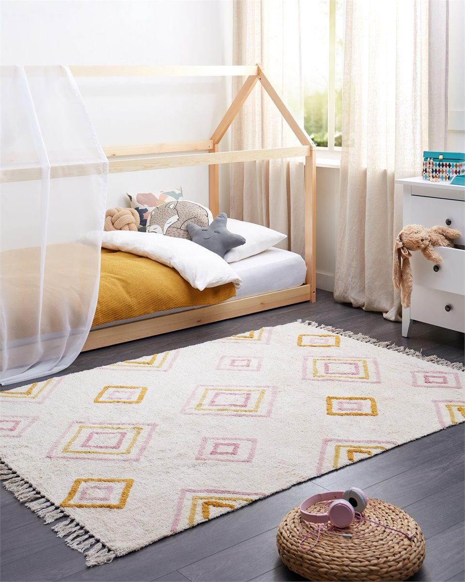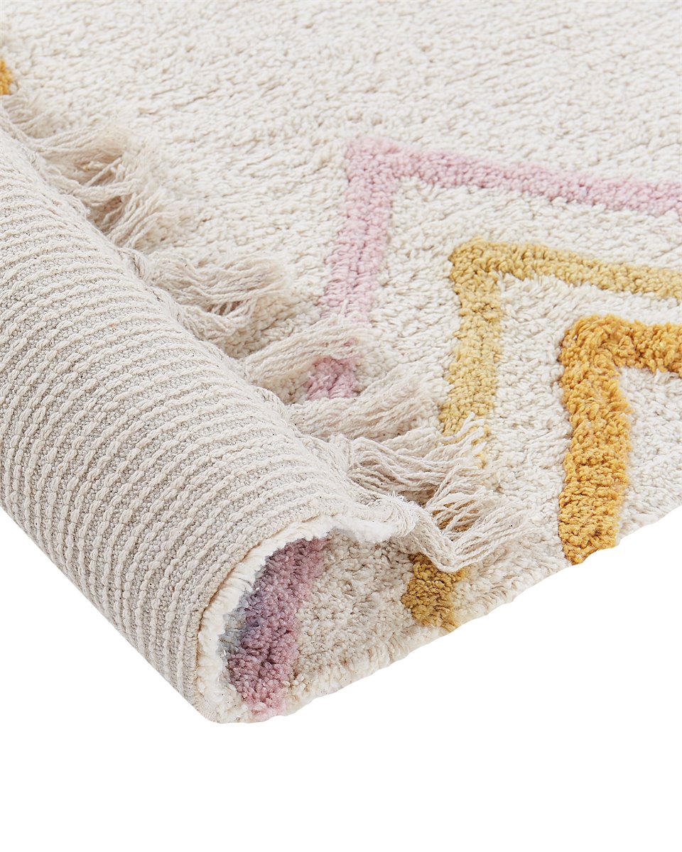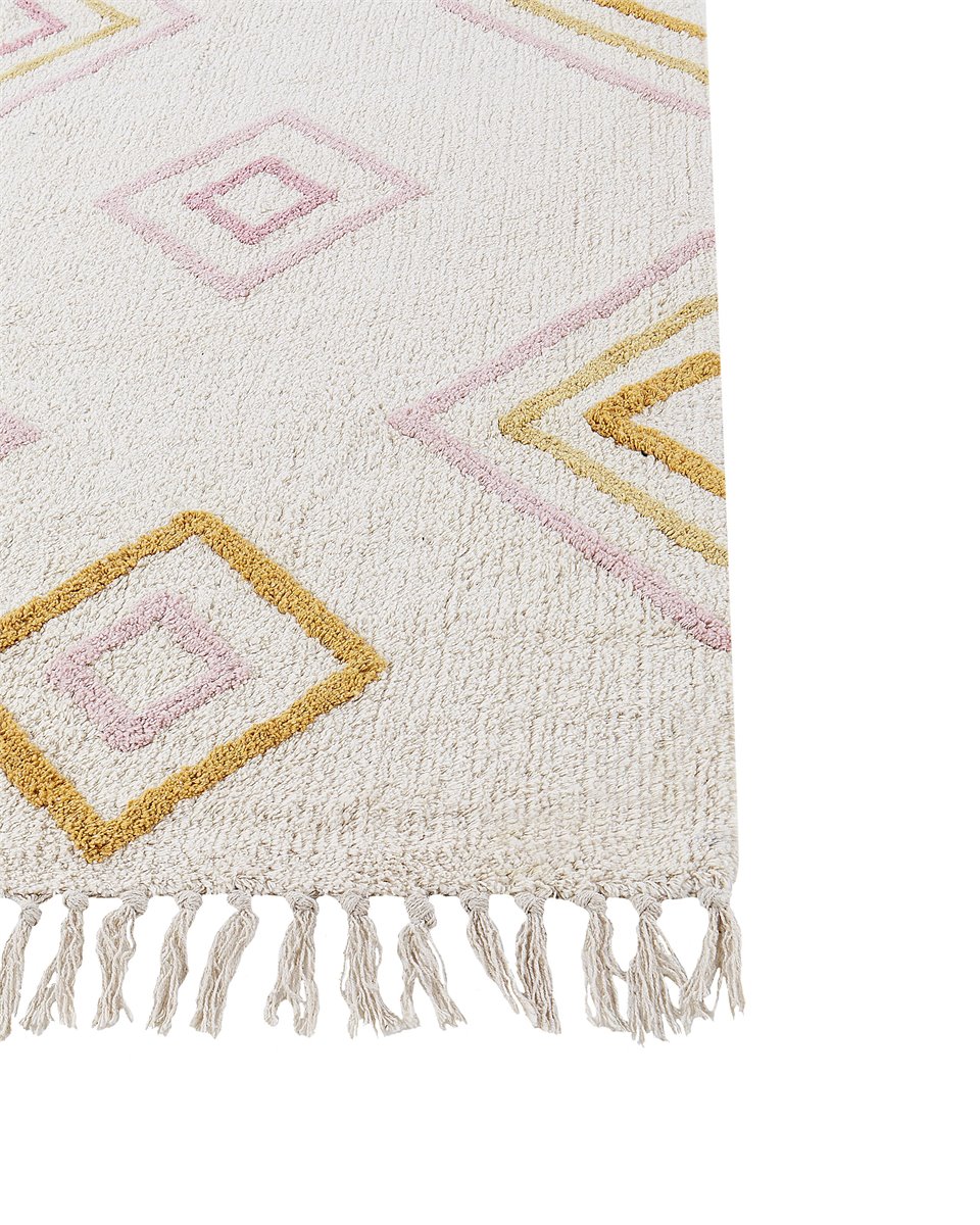 Alfombra con motivo geométrico. Esta alfombra de pelo insertado hecha a mano será una gran elección para mejorar tu decoración. Su color blanco crema neutro combinado con un estampado geométrico encajará en muchos estilos de interior, al mismo tiempo que le dará un toque de color. Las borlas a los lados de la alfombra le dan un toque más hogareño que quedará perfecto en tu salón. Está hecha de algodón suave al tacto.