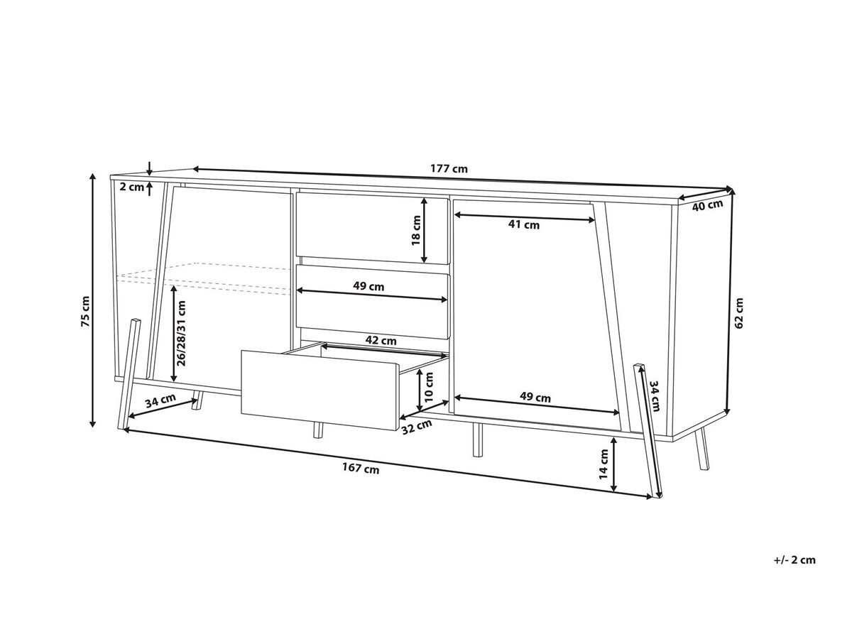 Estiloso aparador en madera clara. Esta cómoda de inspiración industrial es ideal para cualquier sala de estar de estilo contemporáneo o minimalista. Está fabricada a partir de tablero de partículas resistente y de alta calidad. Puedes utilizar los cajones y los armarios para guardar tus pertenencias. Su forma clásica y su acabado efecto hormigón combinan bien con la encimera y las patas de metal.