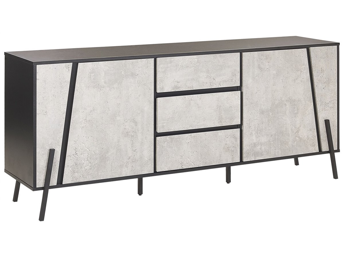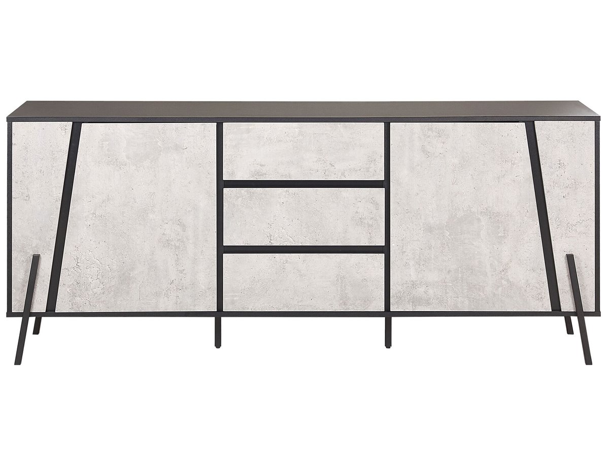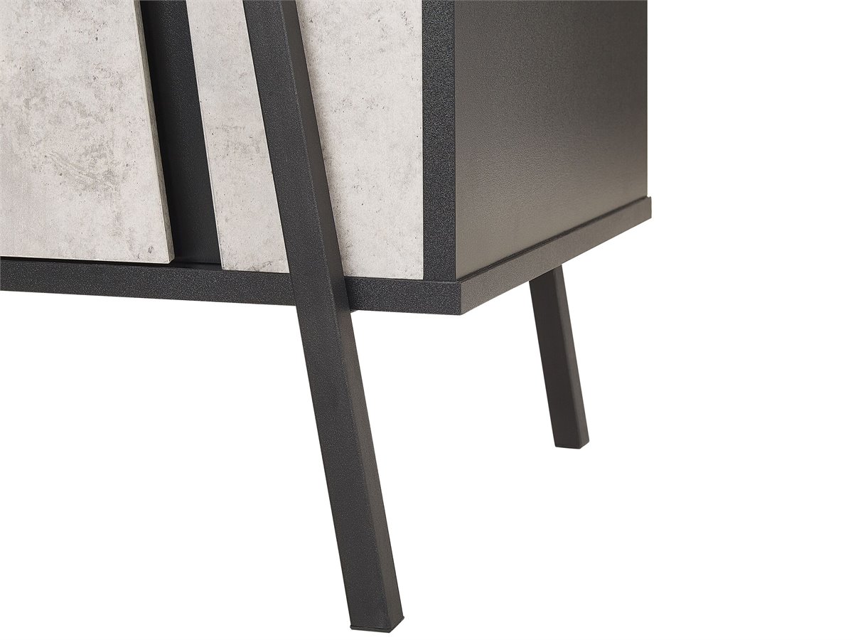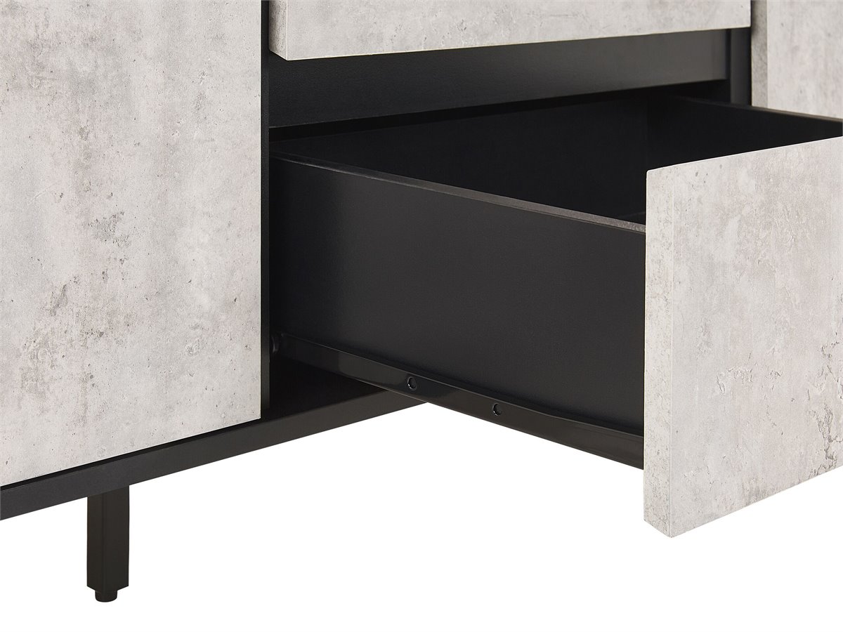 Estiloso aparador en color hormigón. Esta cómoda de inspiración industrial es ideal para cualquier sala de estar de estilo contemporáneo o minimalista. Está fabricada a partir de tablero de partículas resistente y de alta calidad. Puedes utilizar los cajones y los armarios para guardar tus pertenencias. Su forma clásica y su acabado efecto hormigón combinan bien con la encimera y las patas de metal.