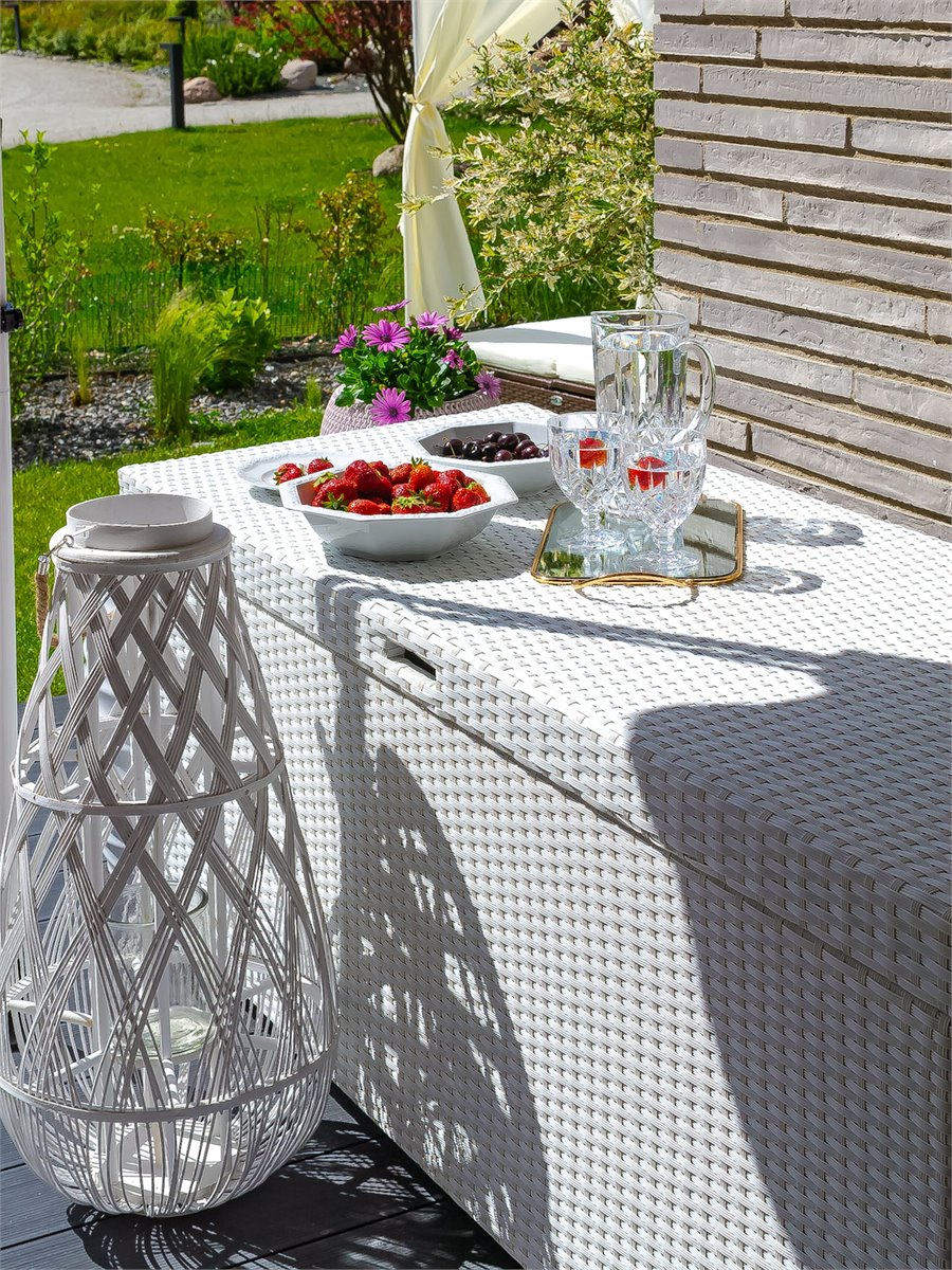 Almacenaje de ratán sintético para jardín. Este arcón está diseñado para resolver problemas de espacio de almacenaje. Es lo suficientemente espaciosa como para guardar cojines, herramientas de jardín, utensilios y juguetes, todo ello a salvo de factores externos. La caja está elaborada de ratán sintético y tiene un marco de acero con recubrimiento de polvo resistente. Cuenta con un forro que protege su contenido del polvo. La caja tiene un mecanismo telescópico para permanecer abierta cuando se levanta y es fácil de mover gracias a las asas laterales.