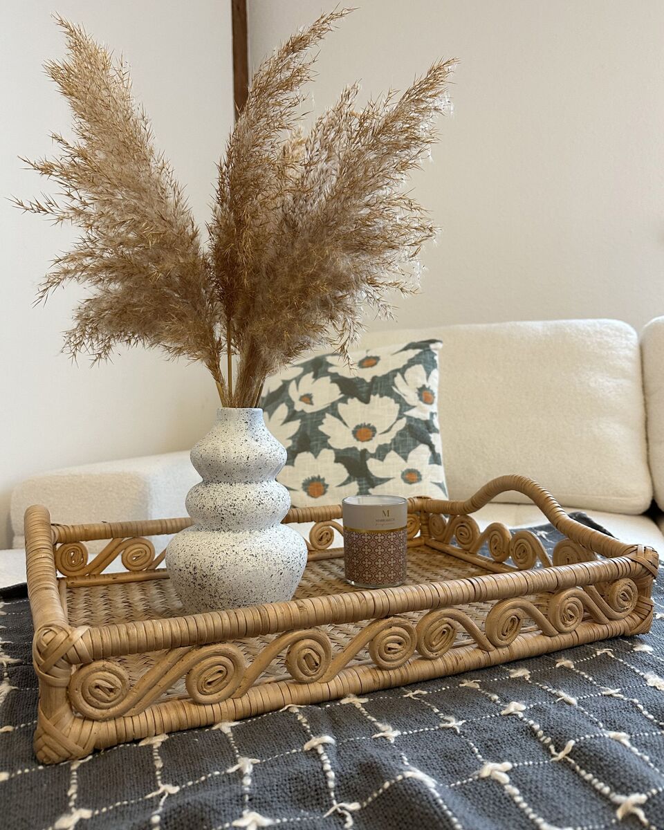 Bandeja rectangular con asas. Realza la decoración de tu hogar con esta bandeja decorativa de inspiración boho. Fabricada a mano en ratán natural de color claro, esta pieza es perfecta para mantener tus joyas organizadas, pero también puede utilizarse como práctica bandeja o como decoración sencilla que llame la atención. Tiene asas, por lo que es fácil de mover y viene con un diseño decorativo en espiral, que sin duda atraerá las miradas de todos tus invitados.