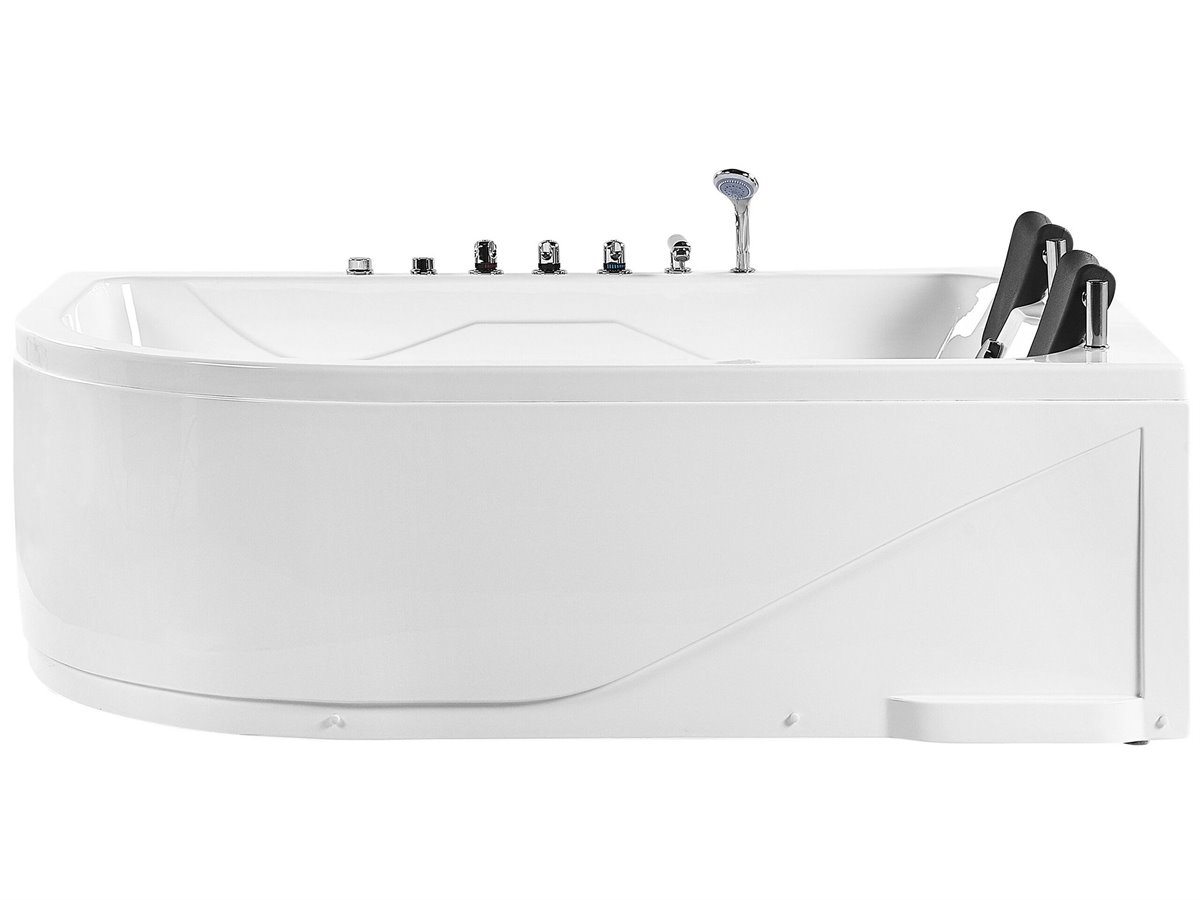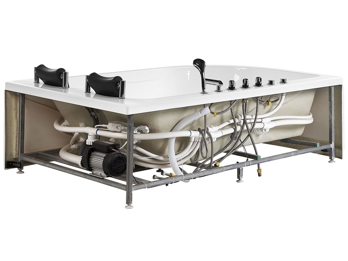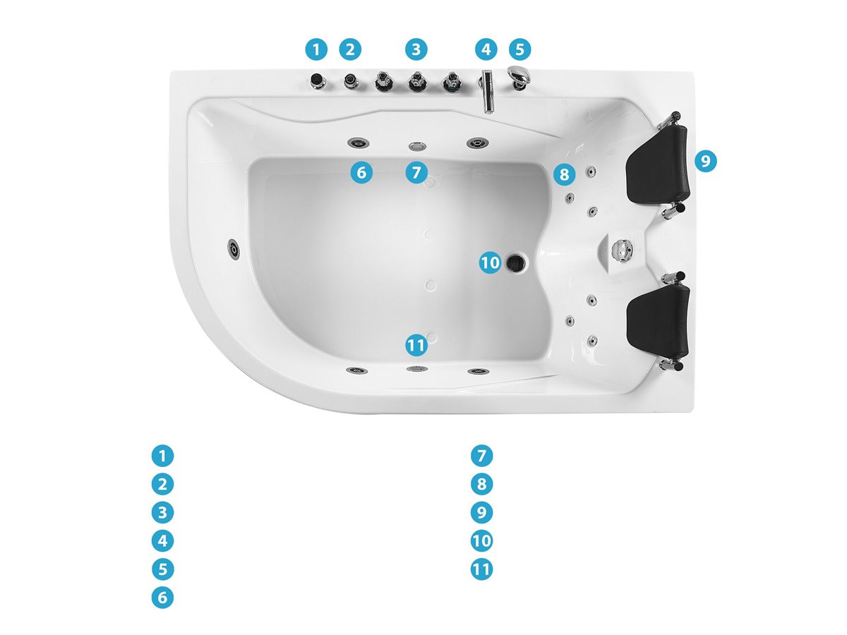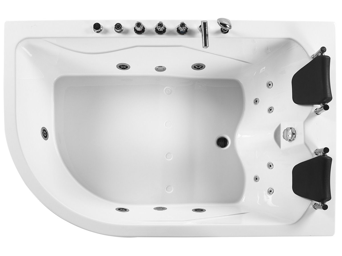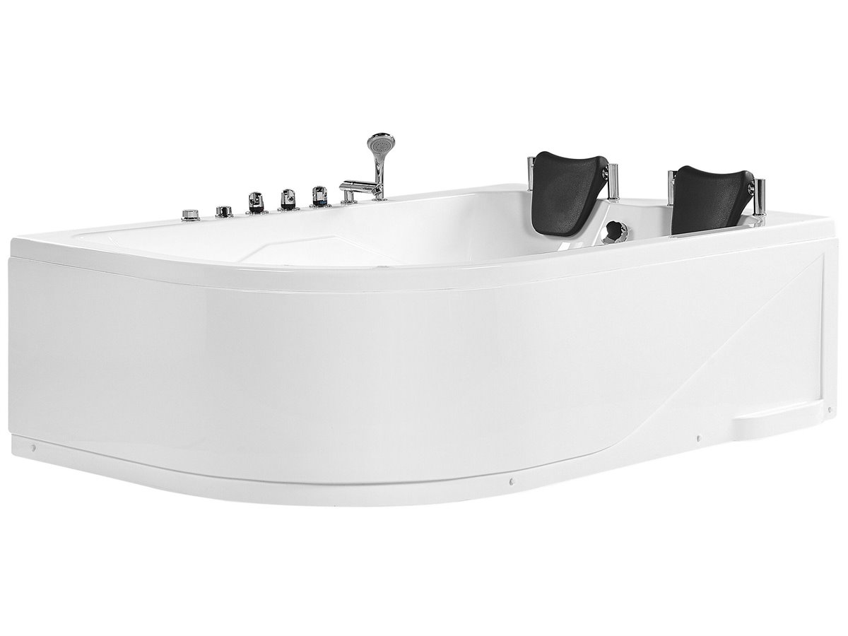Bañera de hidromasaje para dos personas. Añade a tu baño esta bañera de hidromasaje con capacidad para 2 personas. Los jets de masaje y las luces LED proporcionan la máxima relajación. Ideal para habitaciones de dimensiones reducidas gracias a su forma de esquina y a su panel frontal redondeado. Incluye 2 reposacabezas acolchados situados en paralelo.
