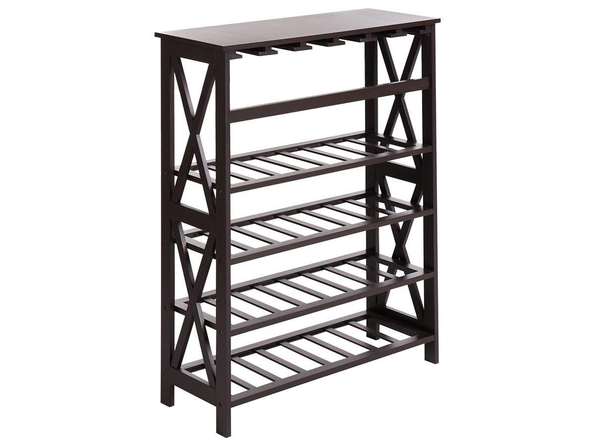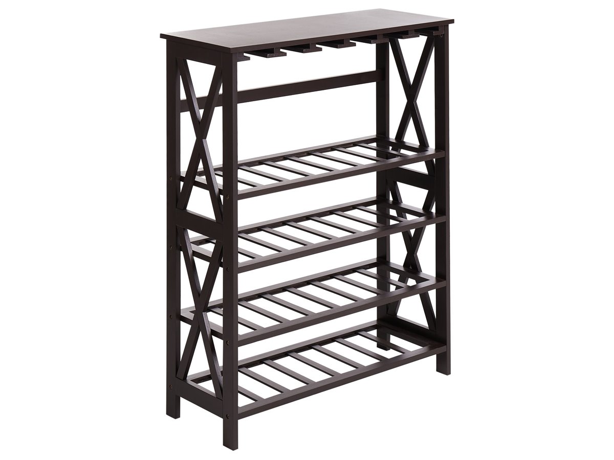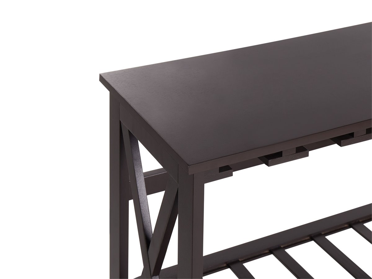 Elegante soporte para vino. Realza el bar de tu casa con este elegante botellero, que cuenta con varios estantes para guardar botellas y rejillas integradas para vasos y copas. El robusto diseño en forma de X garantiza la durabilidad, mientras que la amplia parte superior proporciona una superficie ideal para servir bebidas o mostrar decoración. Diseñado tanto para ser funcional como elegante, esta pieza mantiene tu colección de vinos organizada y fácilmente accesible, por lo que es una pieza imprescindible para cualquier amante del vino.