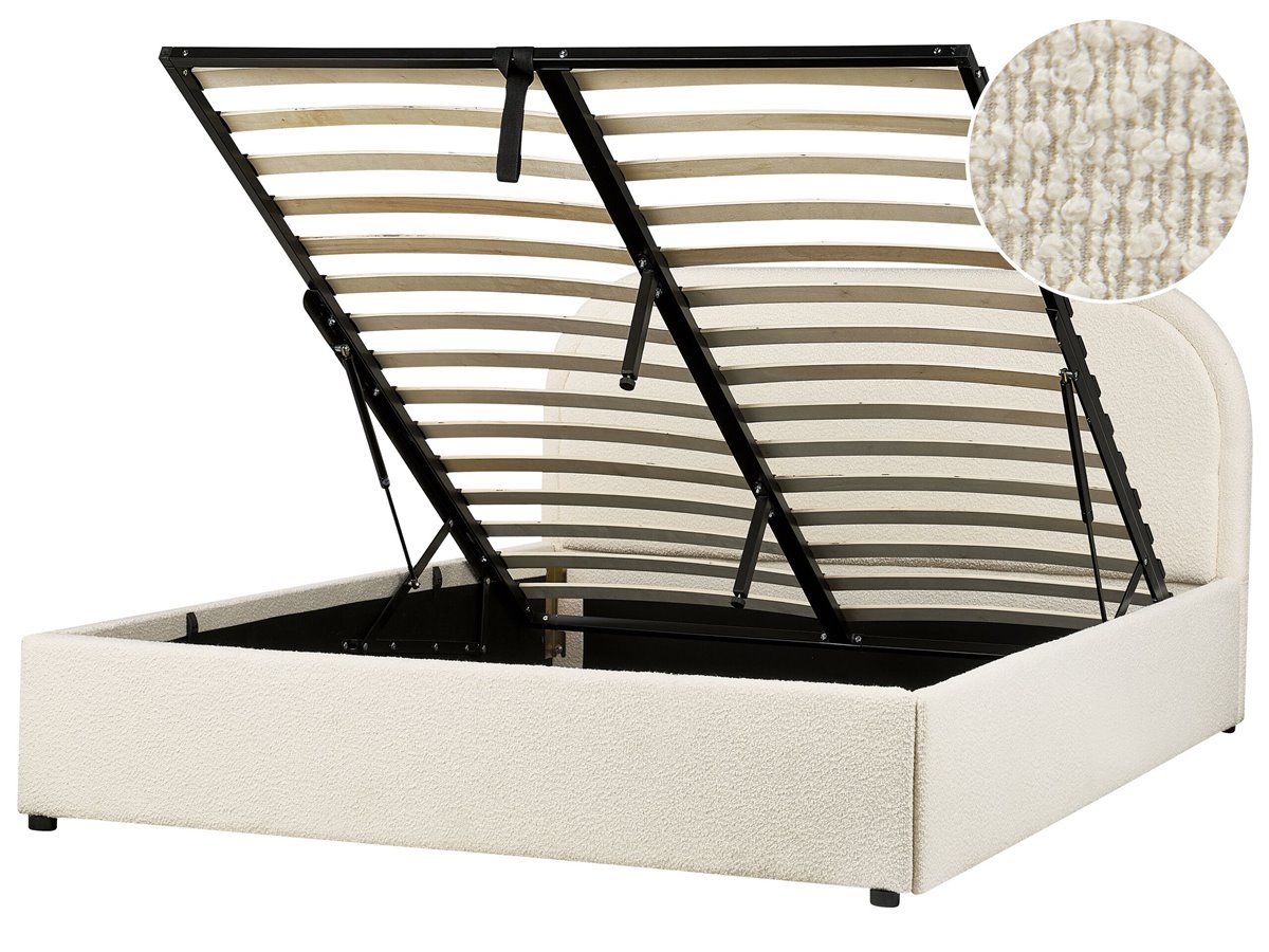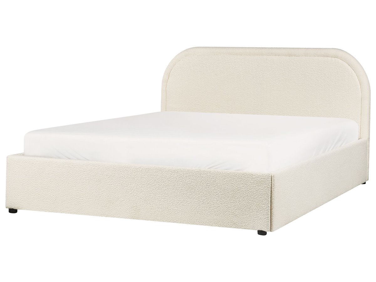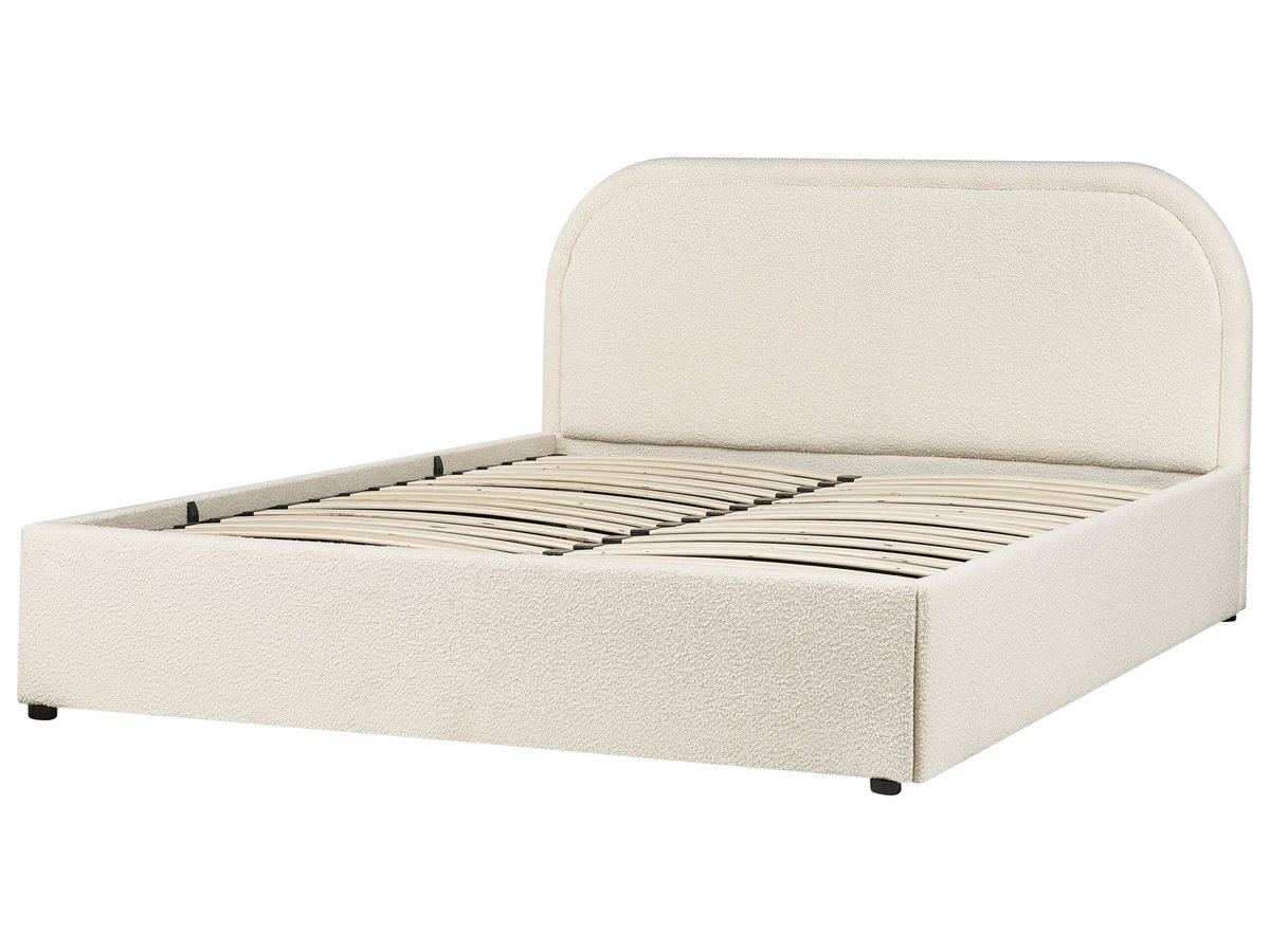 Cama de estilo moderno con cabecero. Esta cama presenta un diseño elegante y funcional, perfecto para dormitorios contemporáneos. Cuenta con un cómodo cabecero tapizado en suave tejido boucle, que añade un toque de lujo y textura. La estructura incluye compartimentos de almacenamiento integrados, ideales para optimizar el espacio guardando la ropa de cama u otros objetos. Fabricada con un robusto somier de láminas, esta cama garantiza un soporte duradero y la circulación del aire, mejorando la longevidad y el confort del colchón. La combinación de practicidad y diseño elegante la convierte en un gran complemento para cualquier hogar moderno.
