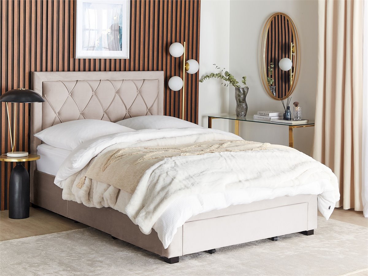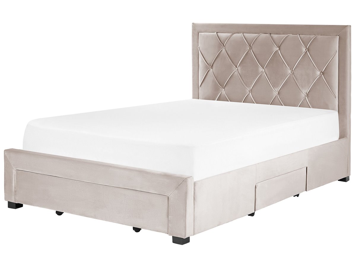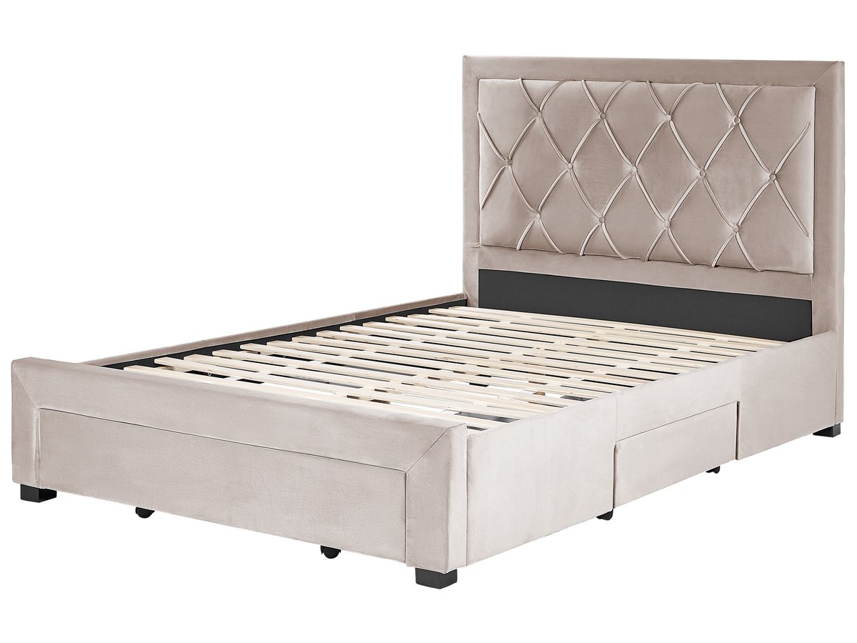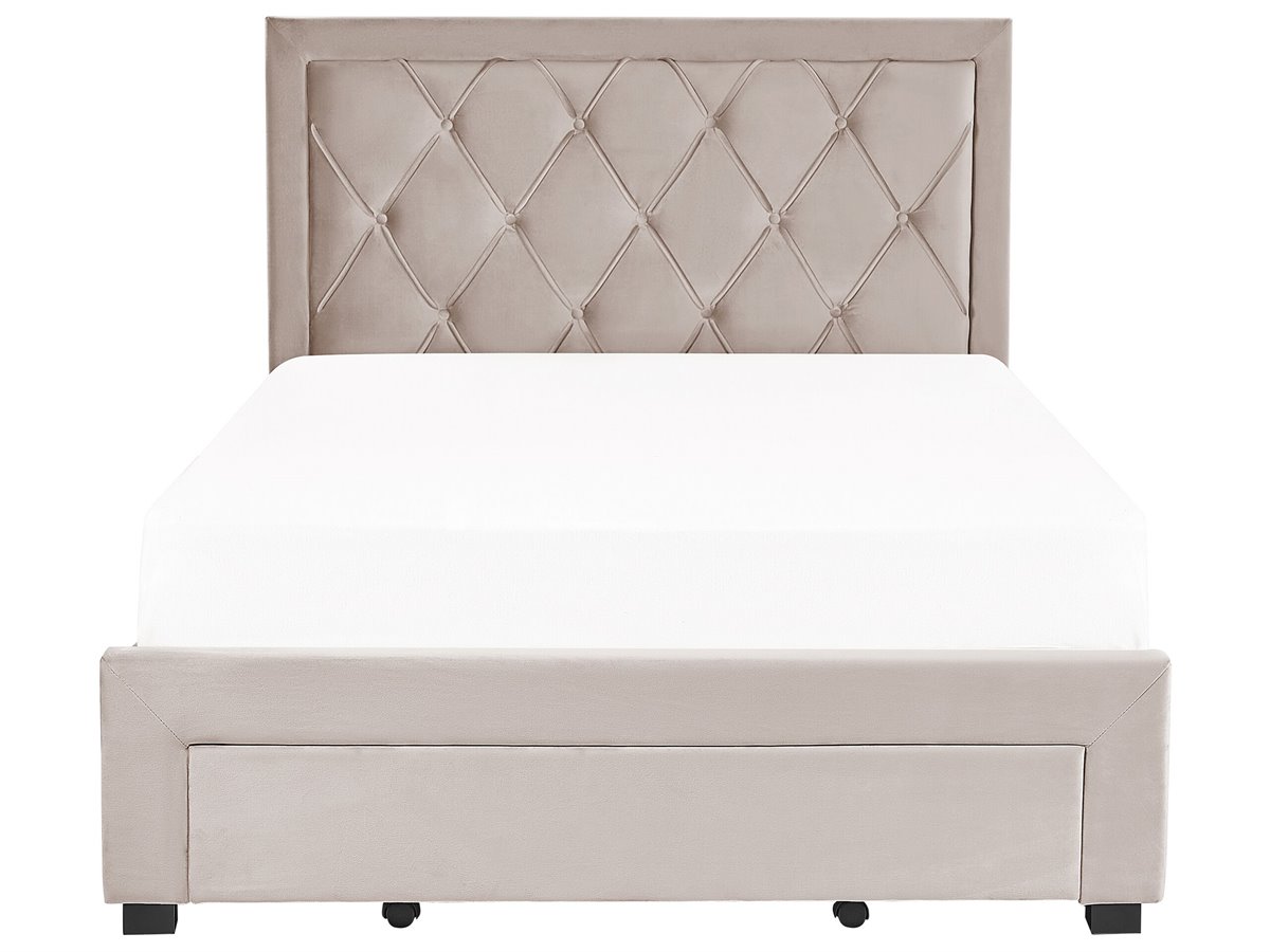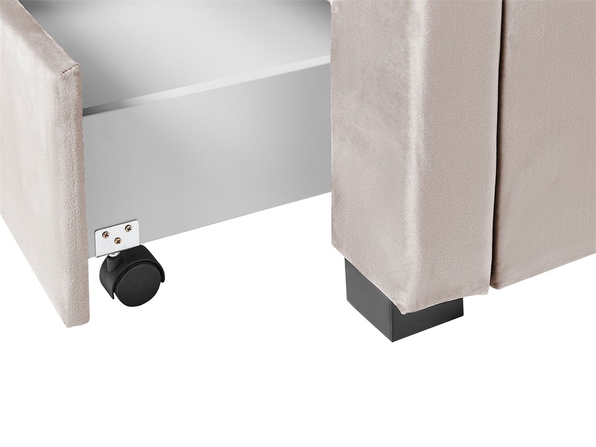 Cama de diseño glamuroso. Añade un toque de glamour a tu dormitorio con esta cama. Está fabricada a partir de terciopelo de alta calidad y suave al tacto. El somier de listones de madera maciza garantiza un sueño saludable. El cabecero capitoné ofrece la máxima comodidad. Incluye un espacio de almacenaje con ruedas donde guardar la ropa de cama.