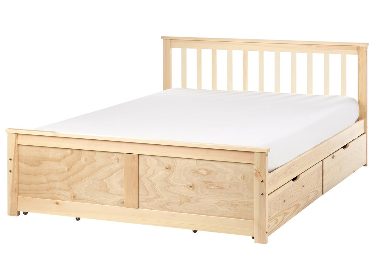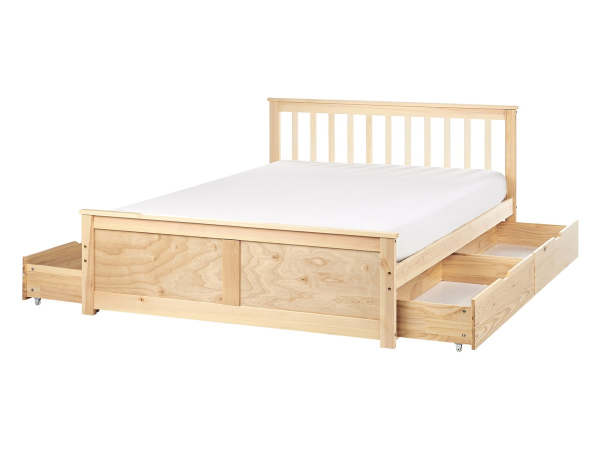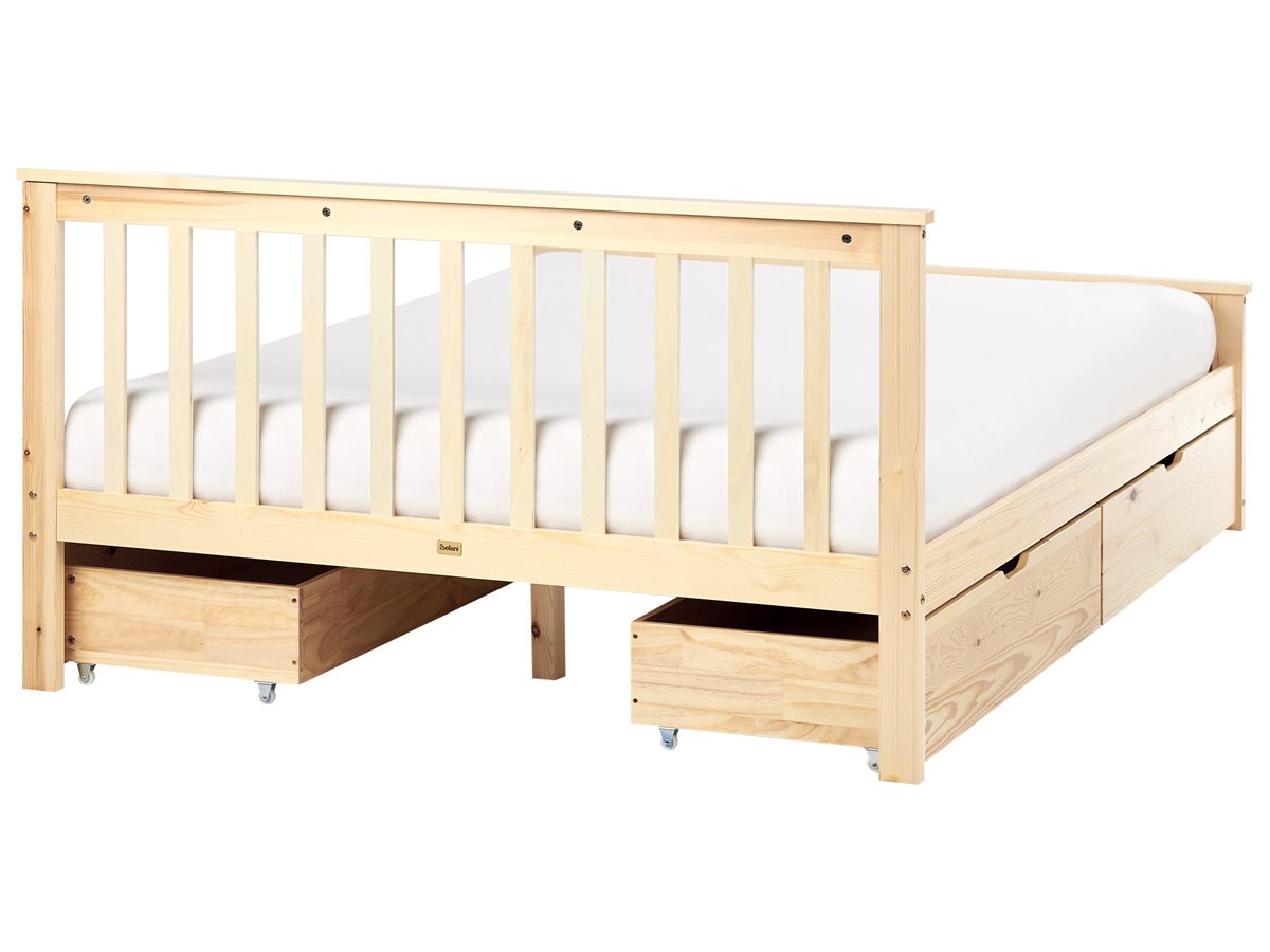 Cama de estilo escandinavo con almacenaje. Esta cama de madera aporta un toque fresco y minimalista a cualquier dormitorio con su diseño sencillo, pero elegante. Con una construcción robusta y duradera hecha de madera de pino, así como somier enrollable, esta cama promete comodidad y estabilidad cada noche, y al mismo tiempo, asegura un uso duradero. Además, cuenta con un juego de 4 espaciosos cajones debajo, que ofrecen una práctica solución de almacenaje para tu dormitorio. Gracias a su aspecto atemporal de líneas rectas y elegantes, y a su color suave y neutro, encaja a la perfección en una gran variedad de interiores.