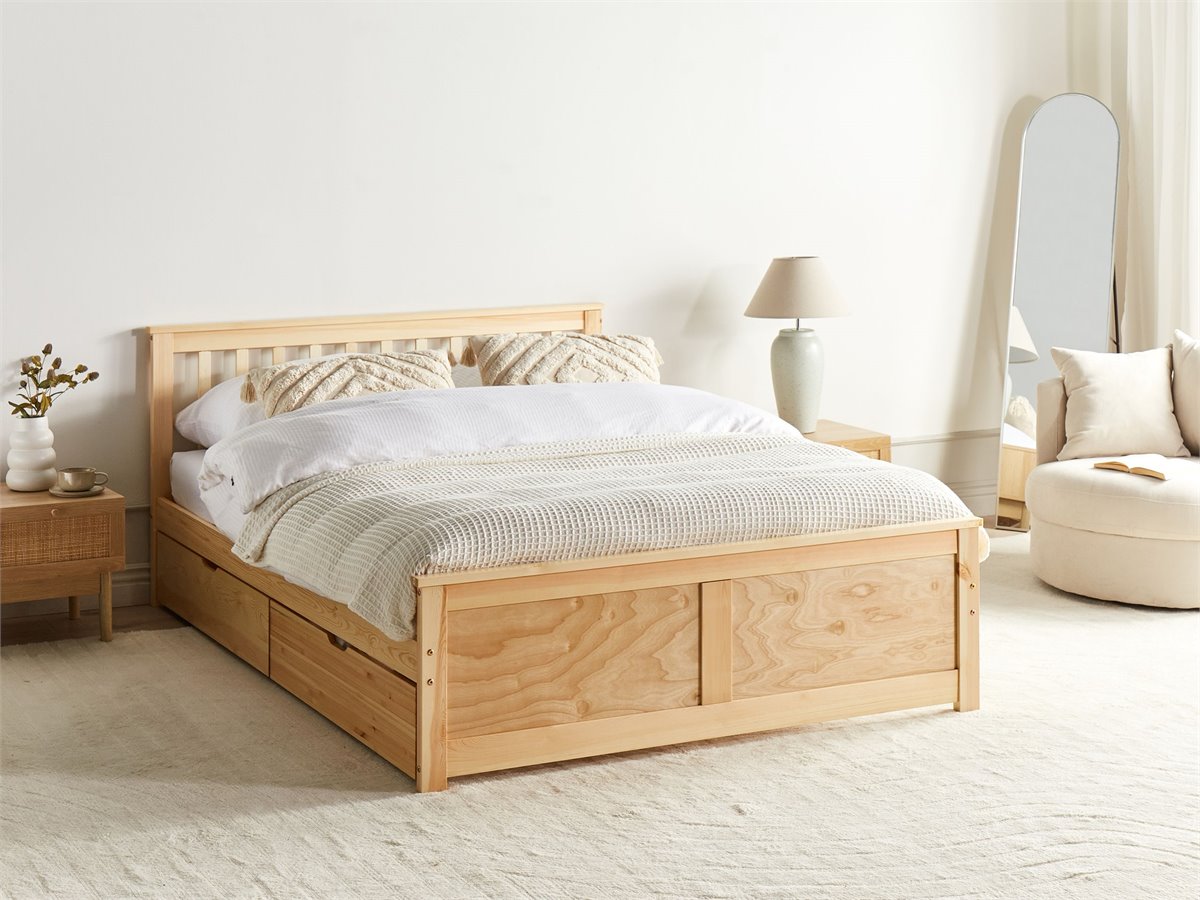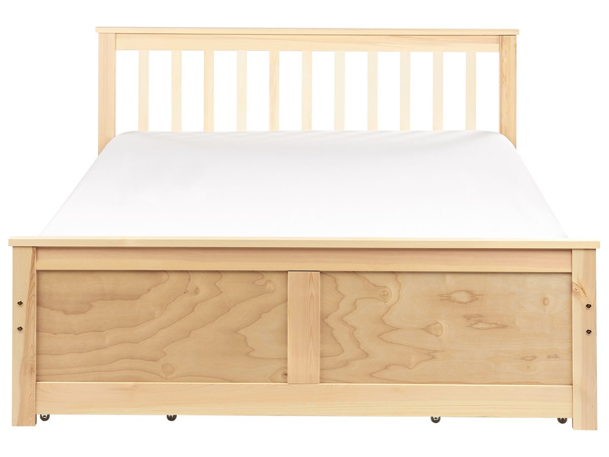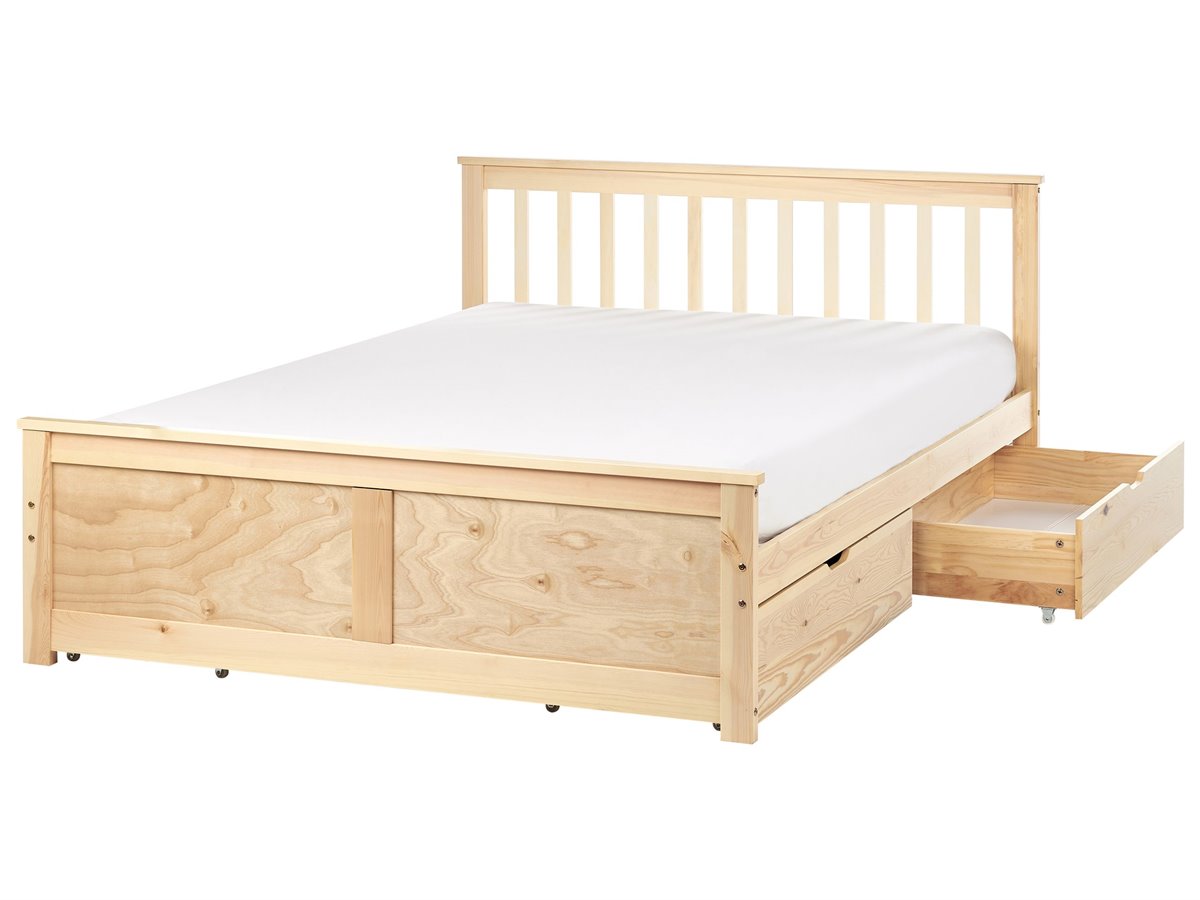 Cama de estilo escandinavo con almacenaje. Esta cama de madera aporta un toque fresco y minimalista a cualquier dormitorio con su diseño sencillo, pero elegante. Con una construcción robusta y duradera hecha de madera de pino, así como somier enrollable, esta cama promete comodidad y estabilidad cada noche, y al mismo tiempo, asegura un uso duradero. Además, cuenta con un juego de 4 espaciosos cajones debajo, que ofrecen una práctica solución de almacenaje para tu dormitorio. Gracias a su aspecto atemporal de líneas rectas y elegantes, y a su color suave y neutro, encaja a la perfección en una gran variedad de interiores.