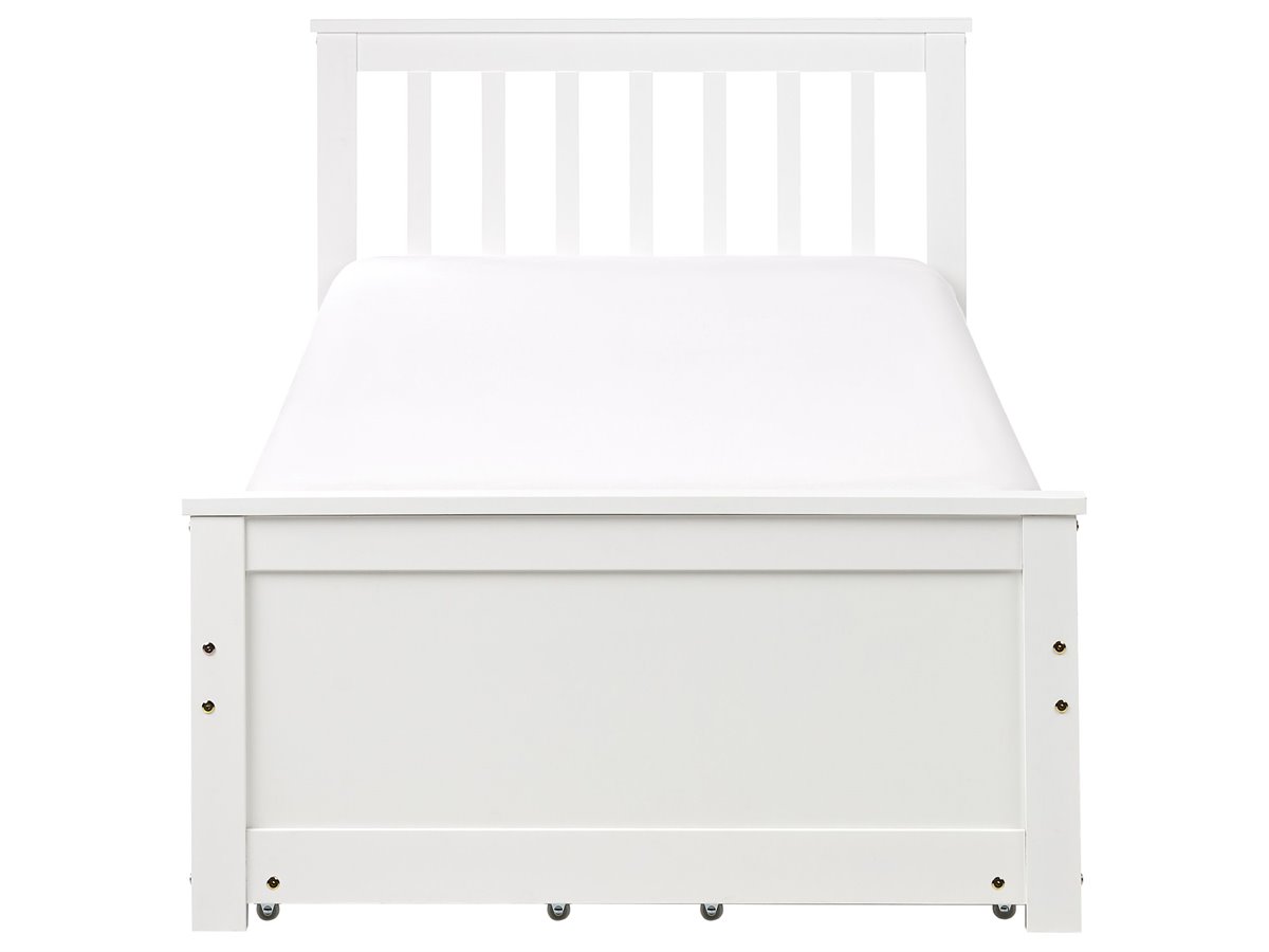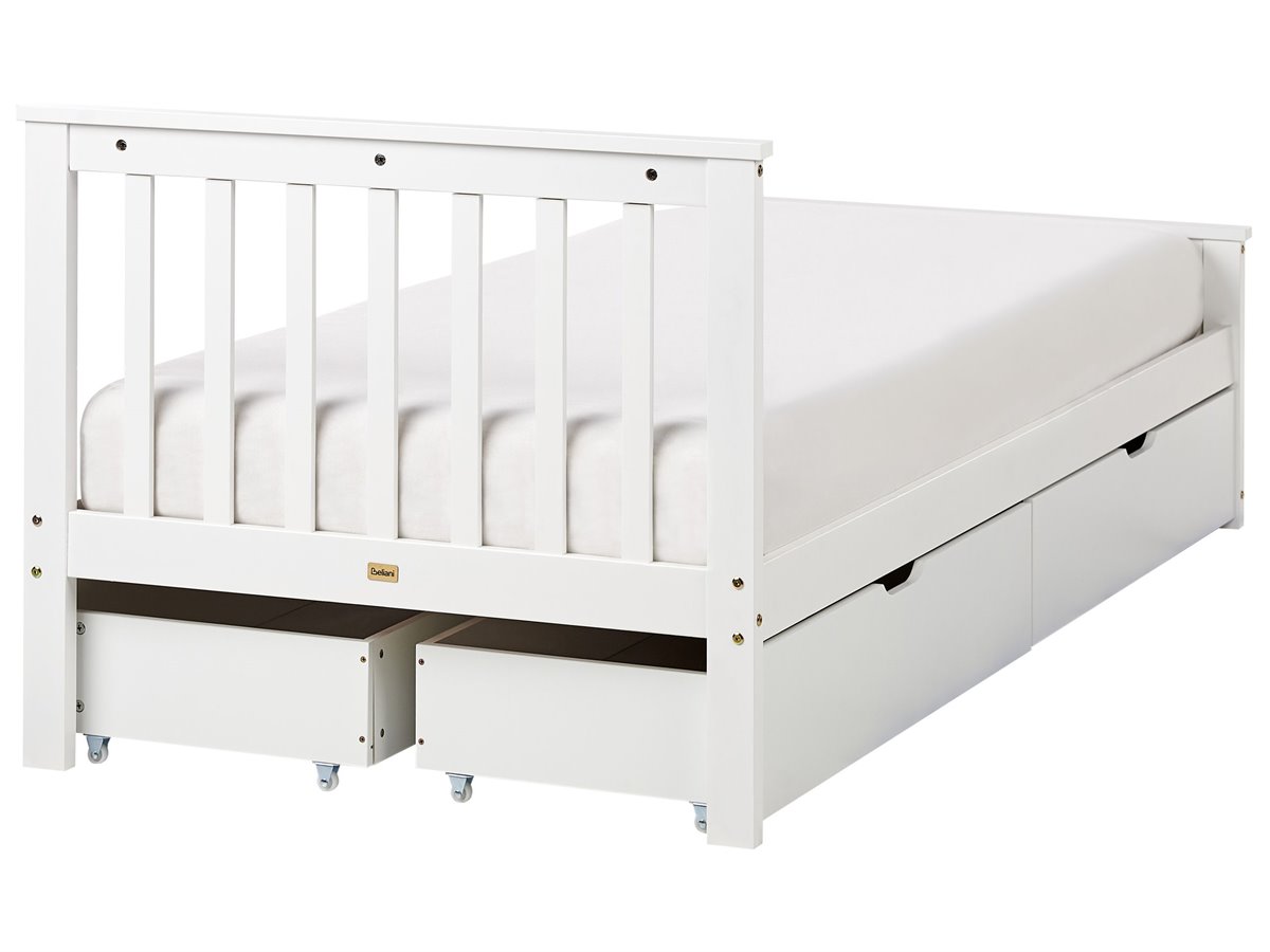 Cama de estilo escandinavo con almacenaje. Esta cama blanca aporta un toque fresco y minimalista a cualquier dormitorio con su diseño sencillo, pero elegante. Con una construcción robusta y duradera hecha de madera de pino, así como somier enrollable, esta cama promete comodidad y estabilidad cada noche, y al mismo tiempo, asegura un uso duradero. Además, cuenta con un juego de 4 espaciosos cajones debajo, que ofrecen una práctica solución de almacenaje para tu dormitorio. Gracias a su aspecto atemporal de líneas rectas y elegantes, y a su color suave y neutro, encaja a la perfección en una gran variedad de interiores.