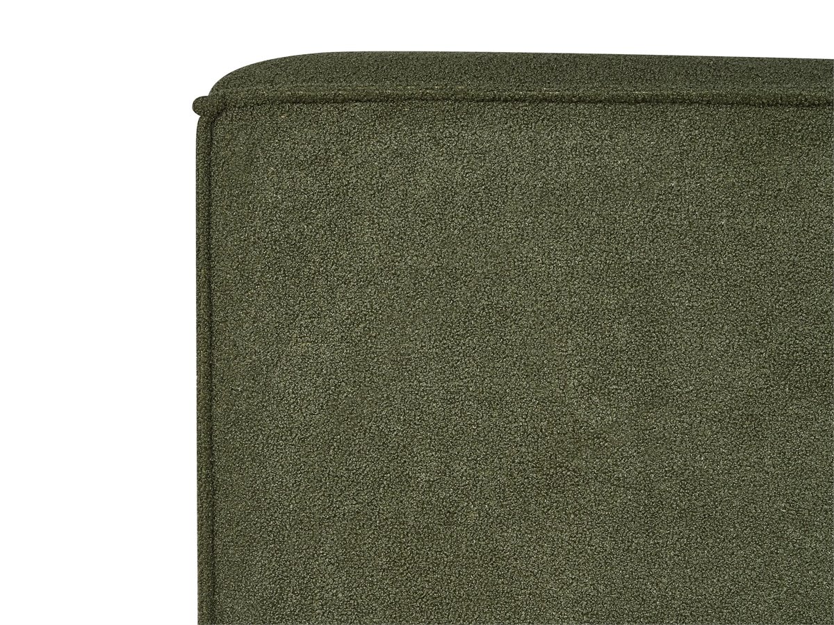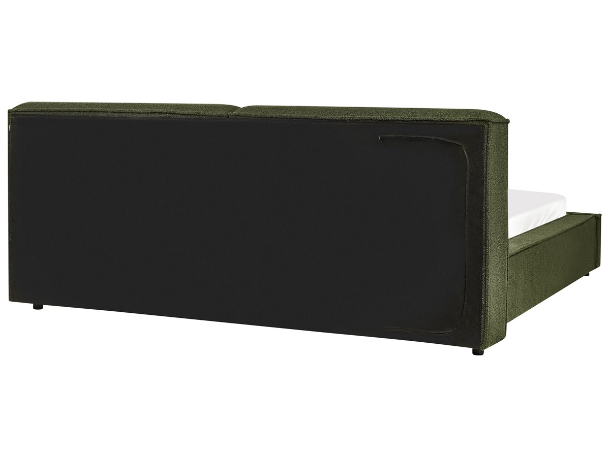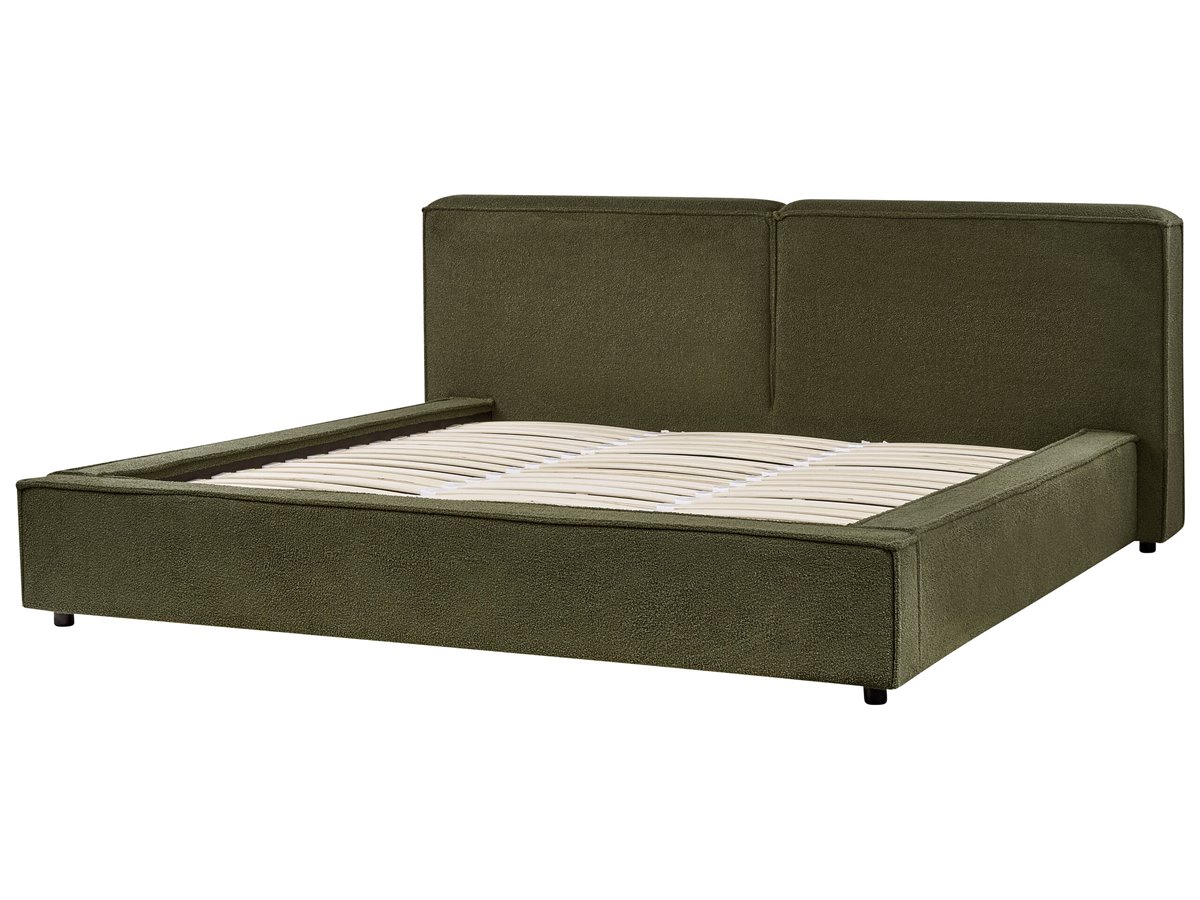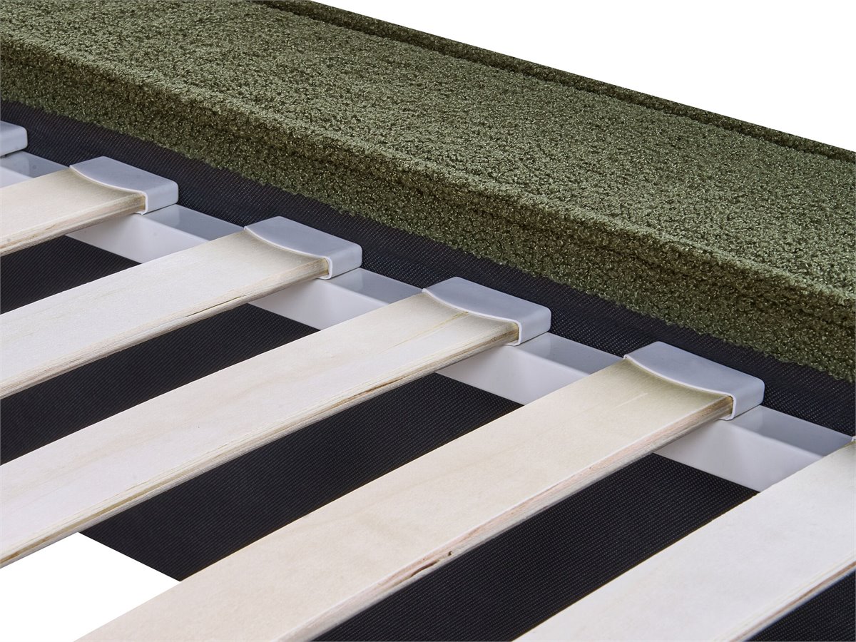 Cama con cabecero tapizado. Dormir bien es muy importante para nuestro bienestar y con esta cama, descansar lo suficiente será muy fácil. Fabricada en bouclé duradero de color verde, es muy agradable al tacto, duradera y no requiere mantenimiento diario. Además, gracias a su diseño clásico, la cama puede combinar con una gran variedad de estilos, desde los más retro hasta los más modernos. El grueso acolchado del cabecero garantizará la comodidad, mientras que los listones de madera maciza garantizan una distribución adecuada del peso corporal.