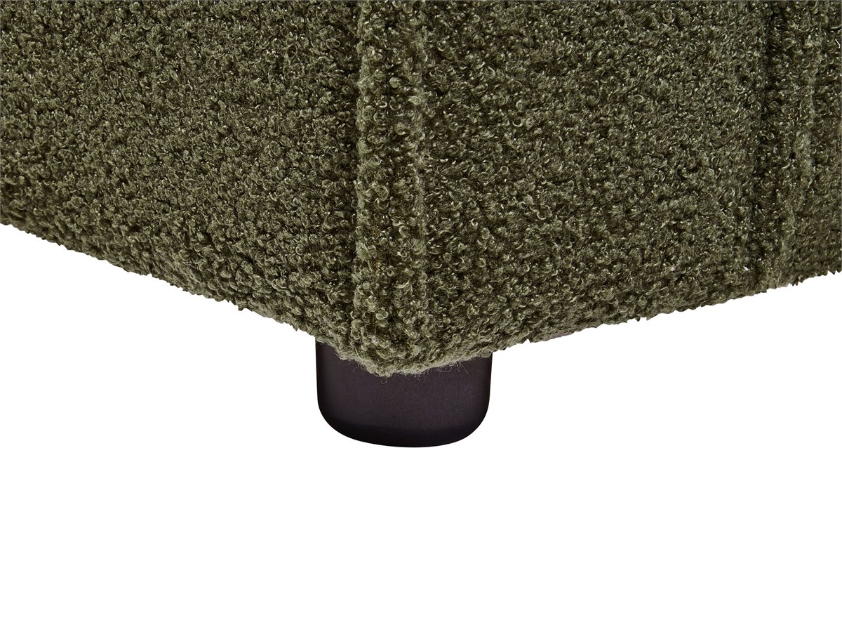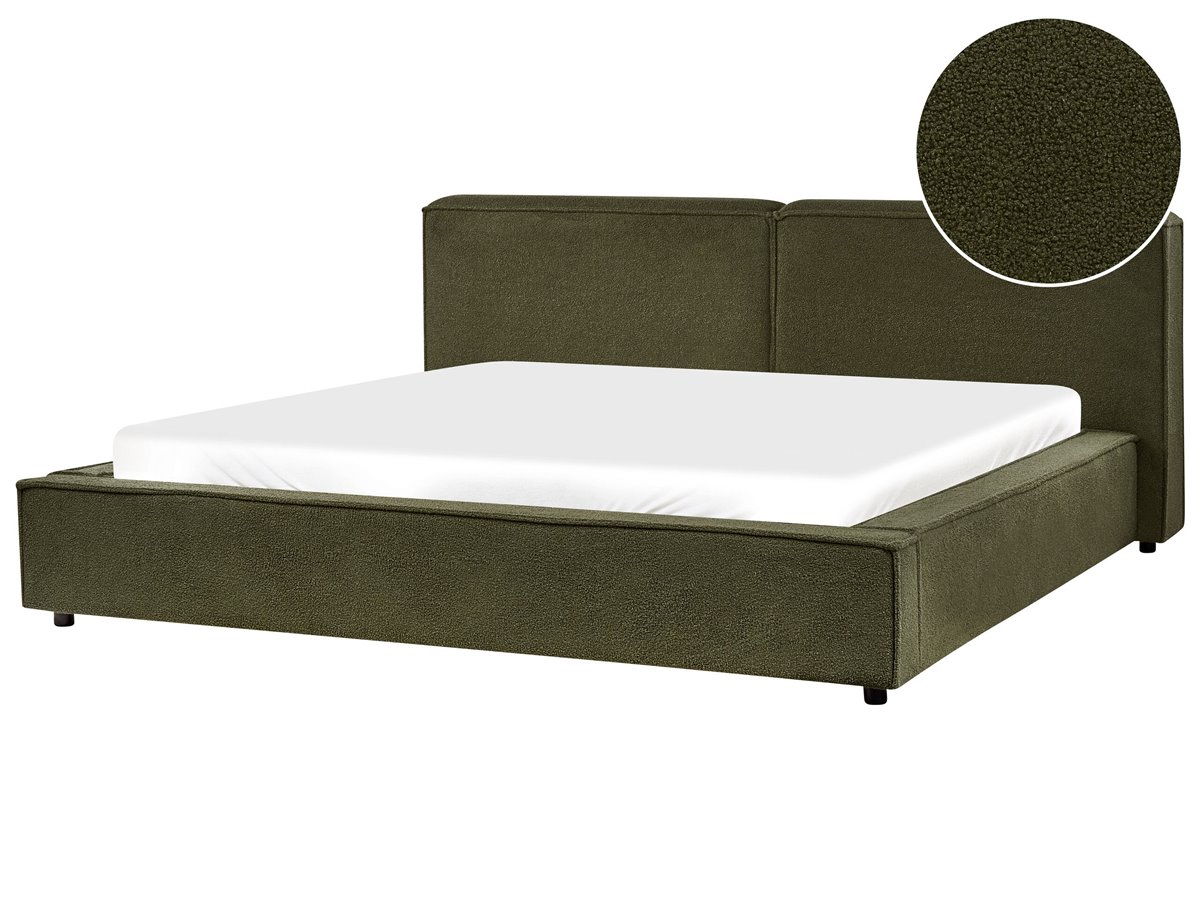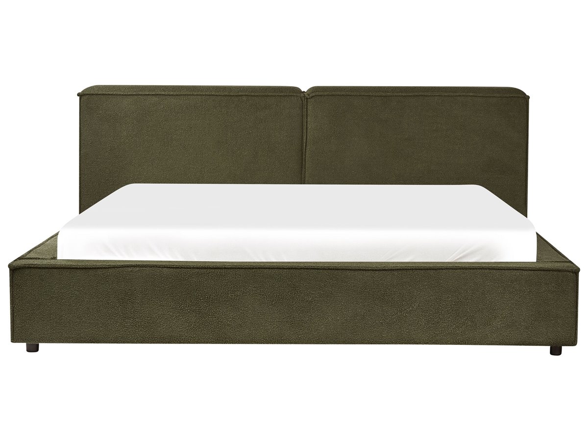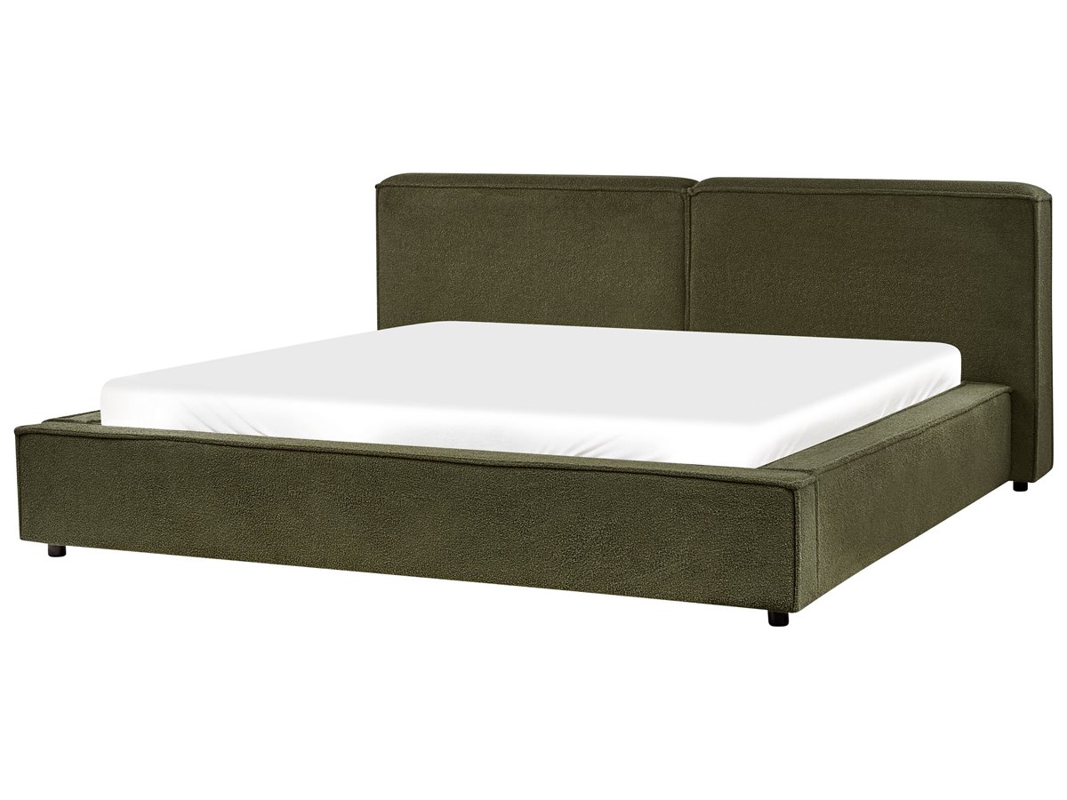 Cama con cabecero tapizado. Dormir bien es muy importante para nuestro bienestar y con esta cama, descansar lo suficiente será muy fácil. Fabricada en bouclé duradero de color verde, es muy agradable al tacto, duradera y no requiere mantenimiento diario. Además, gracias a su diseño clásico, la cama puede combinar con una gran variedad de estilos, desde los más retro hasta los más modernos. El grueso acolchado del cabecero garantizará la comodidad, mientras que los listones de madera maciza garantizan una distribución adecuada del peso corporal.