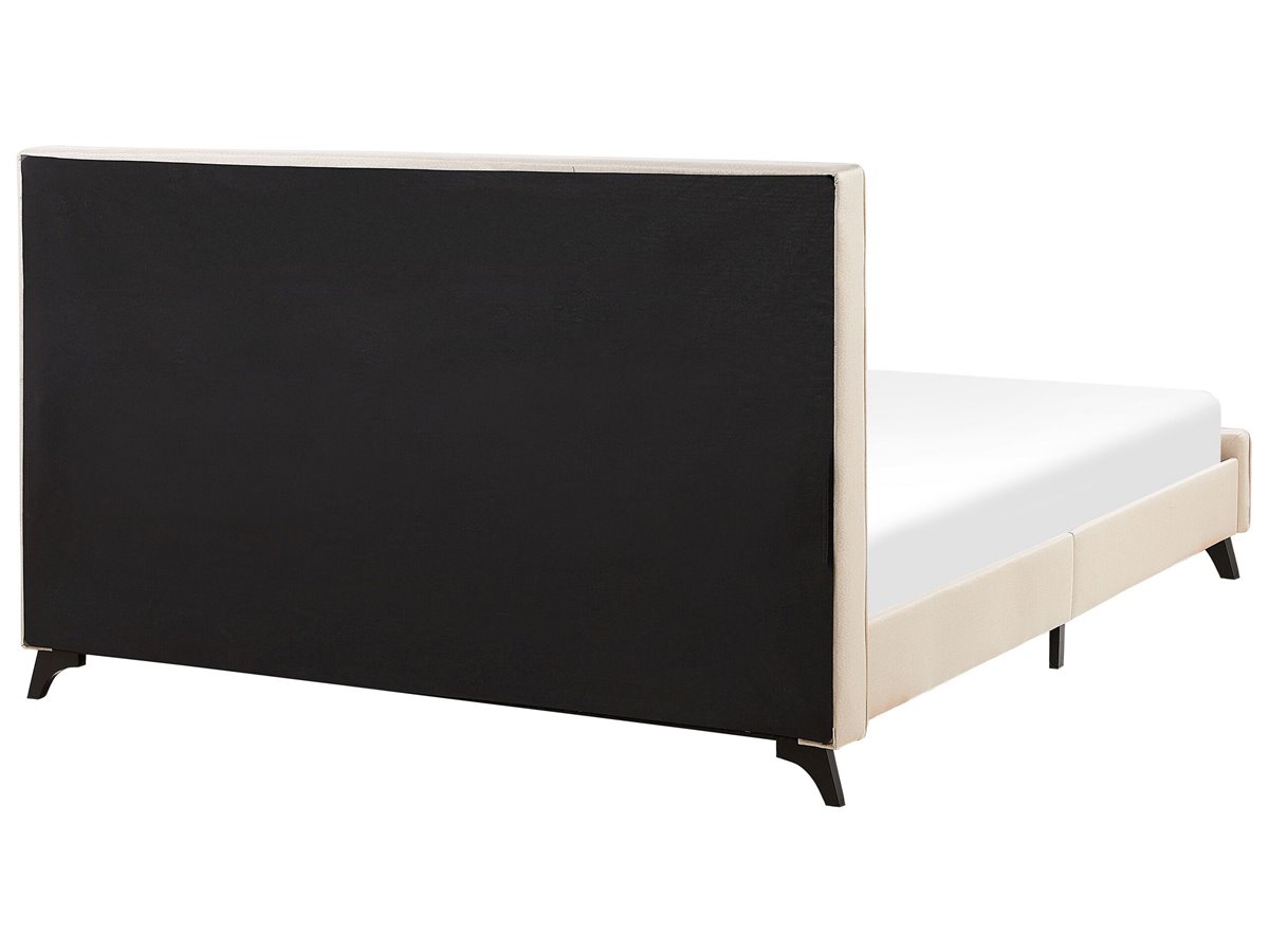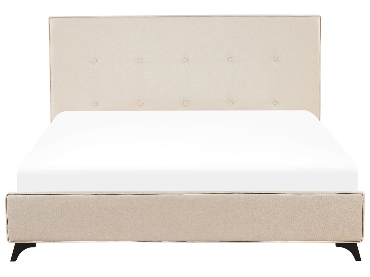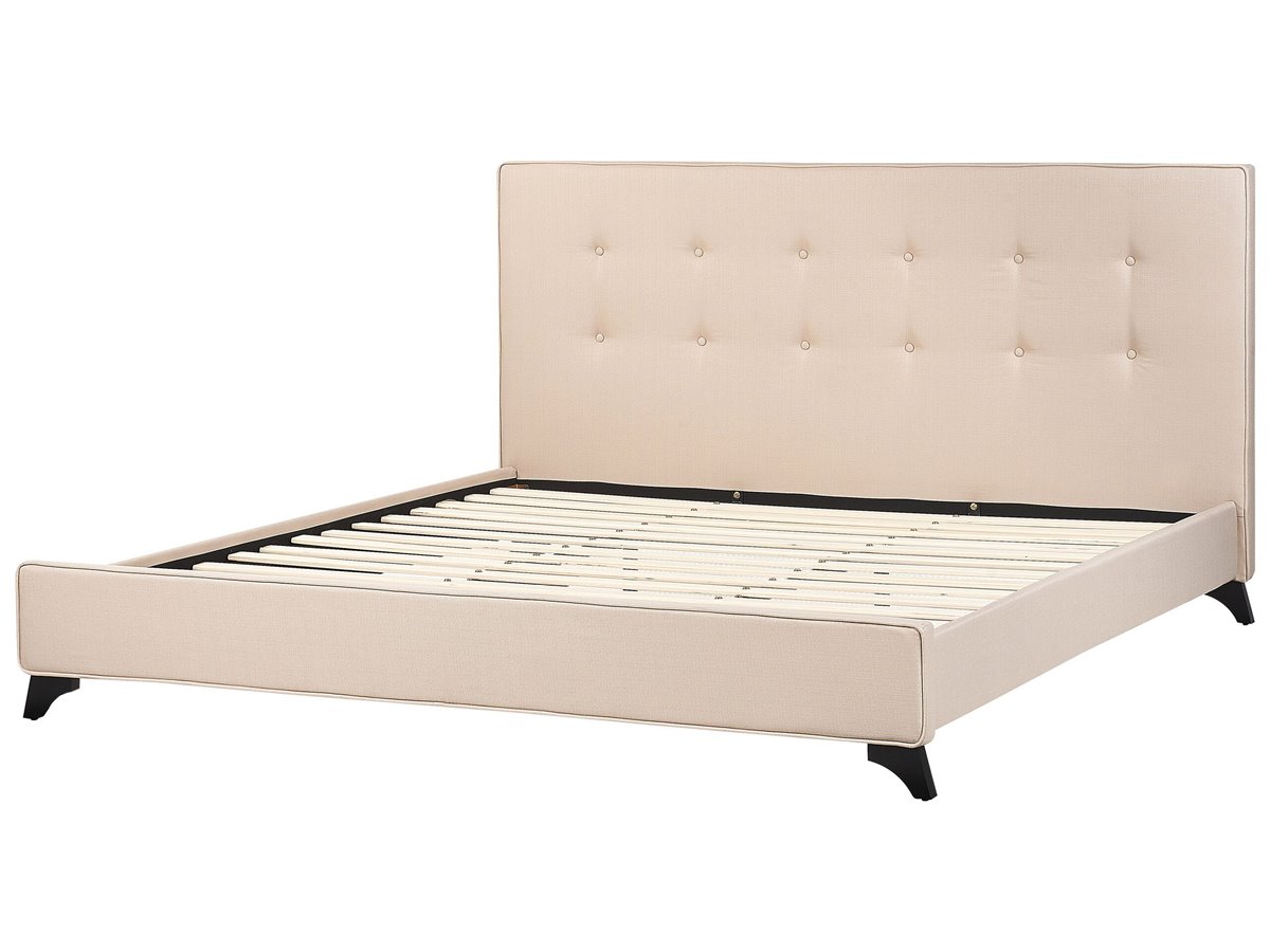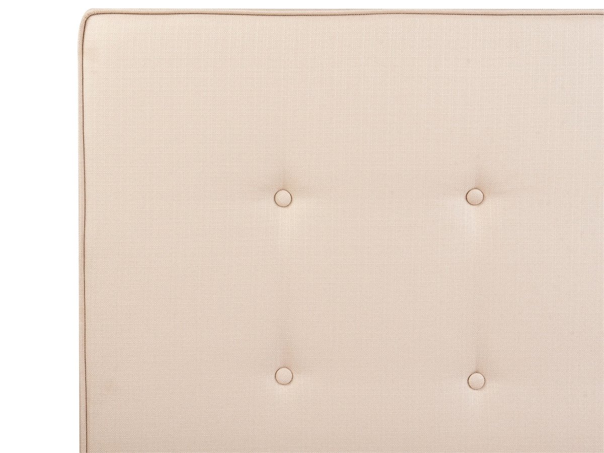 Cama de diseño moderno. Añade a tu dormitorio esta cama con somier inspirada en el diseño escandinavo. Está fabricada a partir de tela de poliéster de alta calidad y suave al tacto. La estructura y las patas de madera ofrecen estabilidad y comodidad. Los botones decorativos aportan un cierto toque sofisticado al estilo.