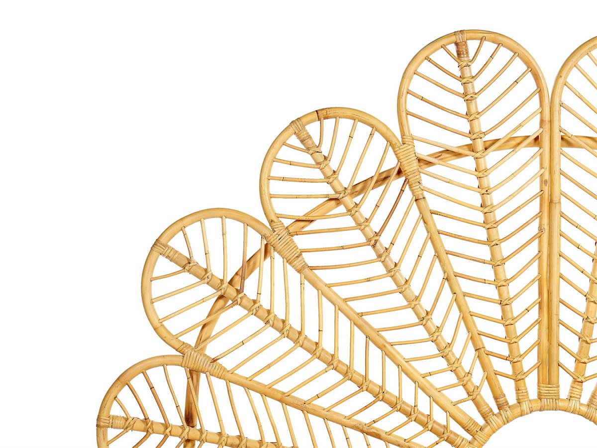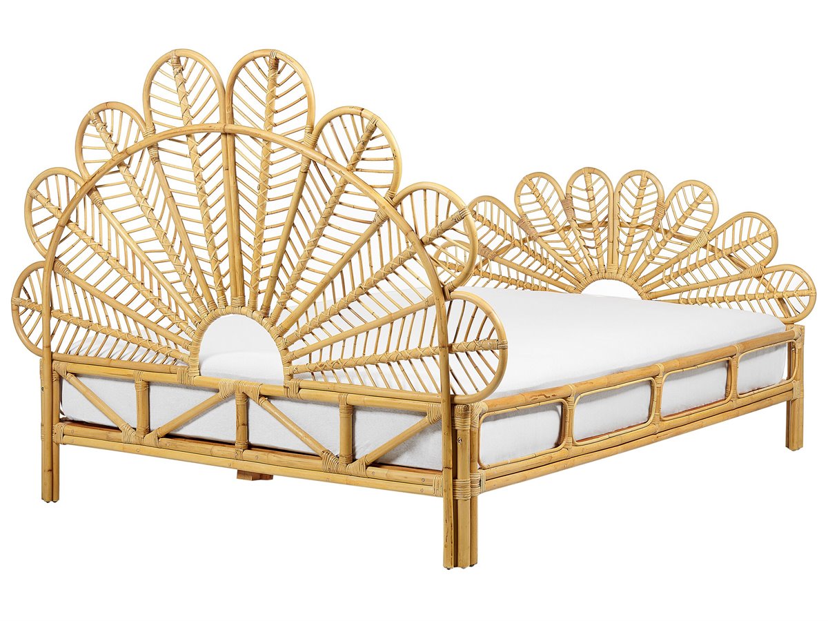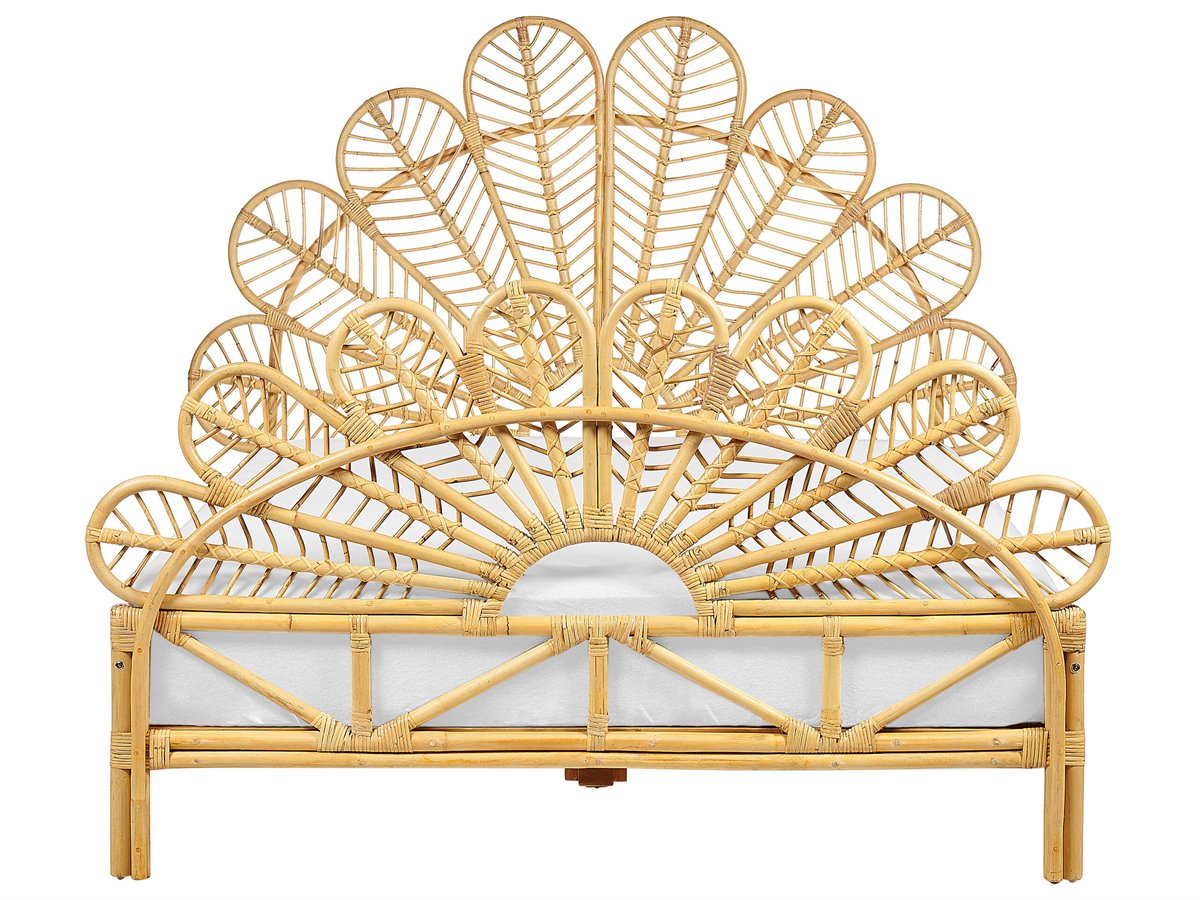Cama con cabecero decorativo. Mejora la calidad de tu descanso con esta cama de estilo pavo real. Está fabricada a partir de ratán de alta calidad. El diseño del cabecero y del pie de cama aportan un toque boho al dormitorio. Las curvas elegantes y los patrones decorativos proporcionan un aire de distinción. La estructura mezcla resistencia y belleza natural.