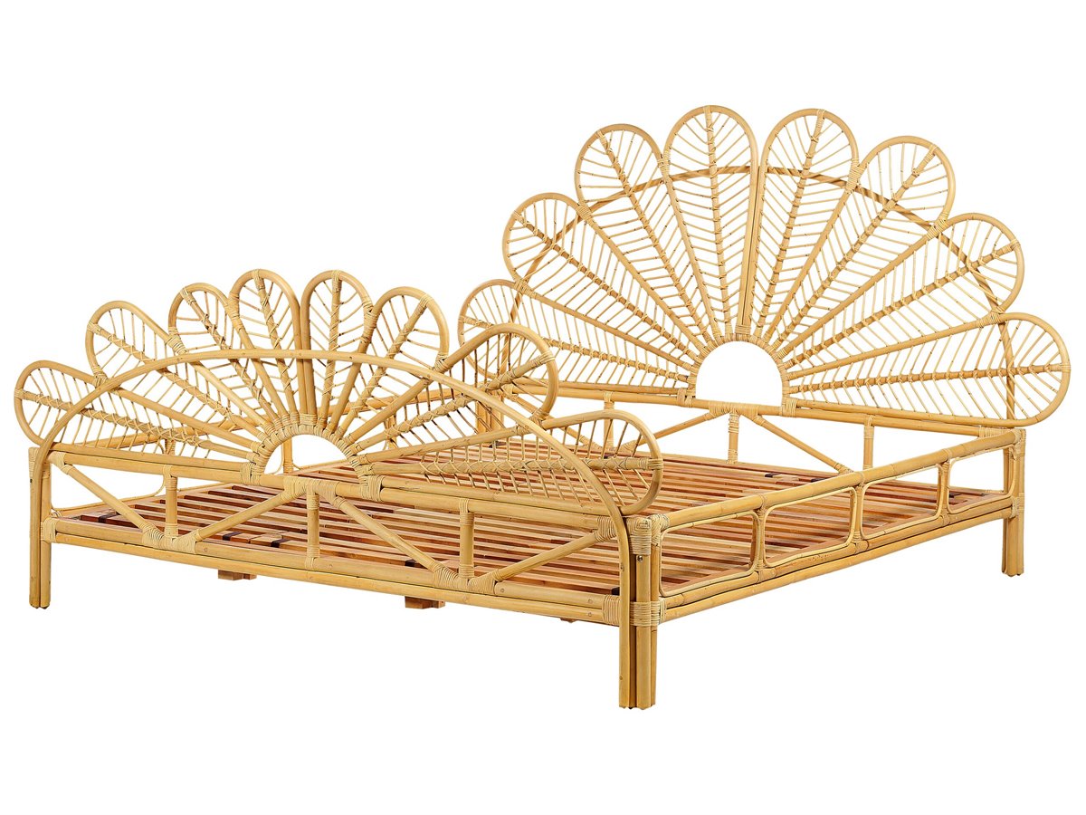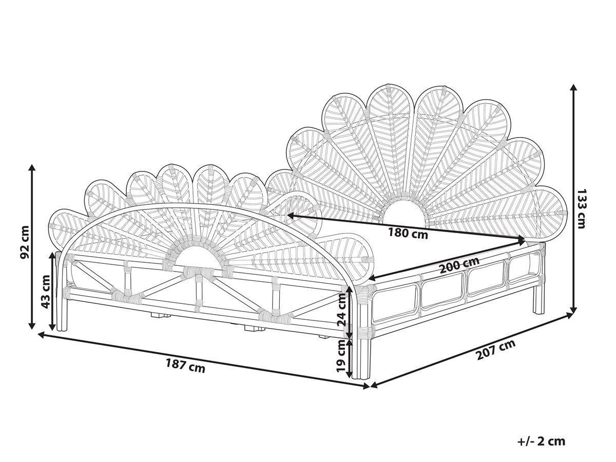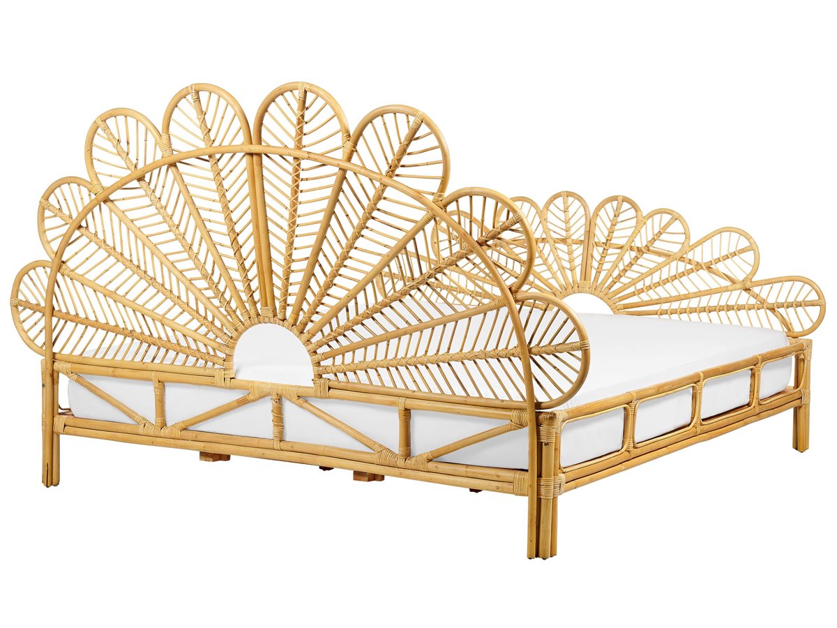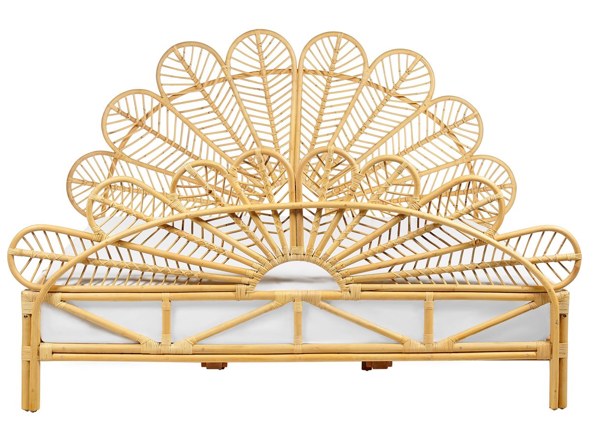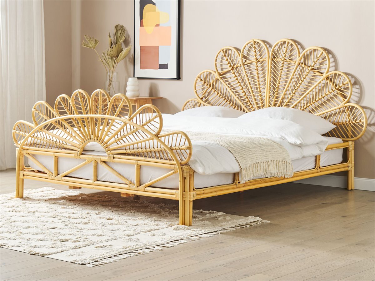 Cama con cabecero decorativo. Mejora la calidad de tu descanso con esta cama de estilo pavo real. Está fabricada a partir de ratán de alta calidad. El diseño del cabecero y del pie de cama aportan un toque boho al dormitorio. Las curvas elegantes y los patrones decorativos proporcionan un aire de distinción. La estructura mezcla resistencia y belleza natural.
