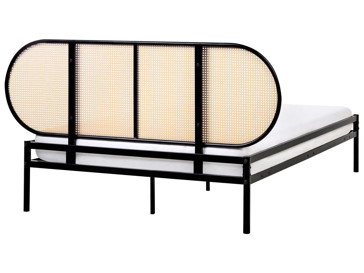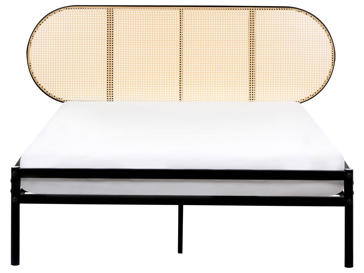 Cama con cabecero de trenza vienesa. Aporta un toque de elegancia a tu dormitorio con esta cama con estructura de hierro, que incluye un cabecero de ratán sintético con un elegante motivo de trenza vienesa. La combinación de metal y ratán crea una estética fresca y aireada que se adapta tanto a interiores modernos como tradicionales. Esta cama no solo ofrece un soporte resistente, sino que también añade una textura sofisticada y natural a tu habitación.