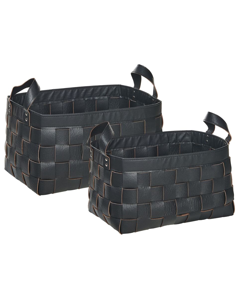 Cajas de almacenaje con asas hechas a mano. Este conjunto de dos cestas de piel sintética aportará un toque de encanto retro a tu espacio. Diseñadas con robustas asas para facilitar su transporte, son perfectas para organizar los objetos de uso diario. Ideales para salones, recibidores u oficinas en casa, estas cestas elegantes y prácticas combinan funcionalidad con un atractivo atemporal.