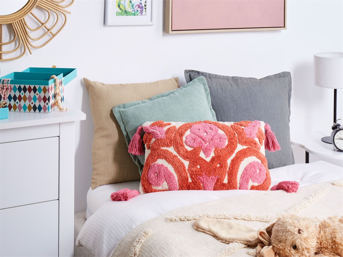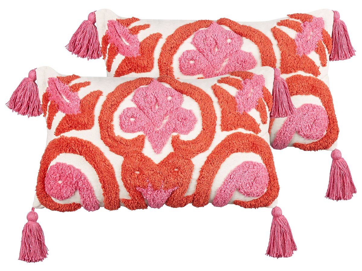Juego de cojines decorativos. Realza el espacio de tu hijo con este encantador conjunto de dos cojines rectangulares. Confeccionados en suave algodón y adornados con encantadoras borlas, estos cojines presentan un divertido estampado de mechones en vibrantes tonos rojos y rosas. Perfectos para añadir un toque de color y personalidad a cualquier habitación infantil, combinan a la perfección estilo y comodidad. Con cómodas cremalleras incorporadas, las fundas extraíbles facilitan la limpieza y el mantenimiento, convirtiéndolos en un complemento práctico y encantador para el espacio de tu pequeño.