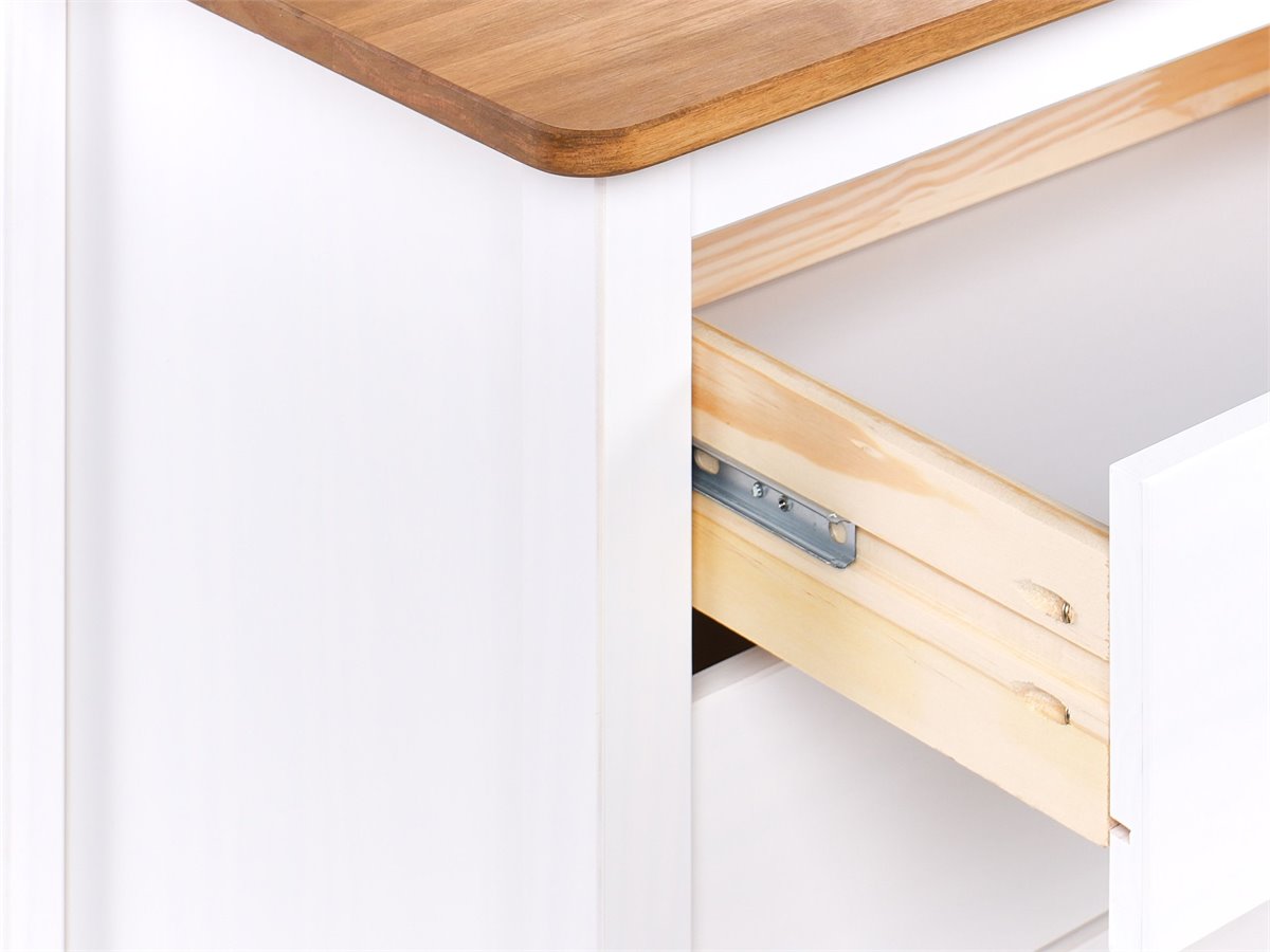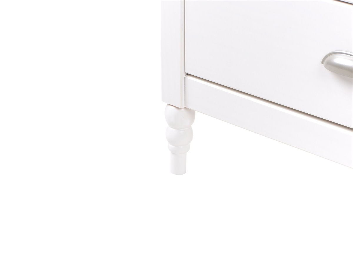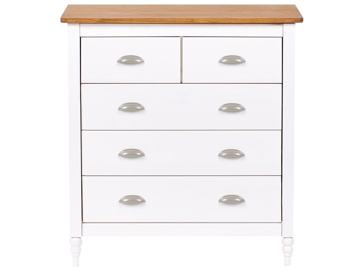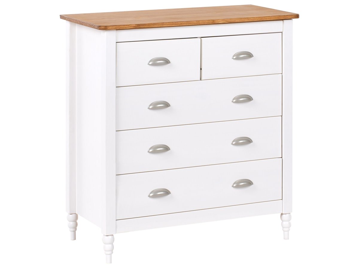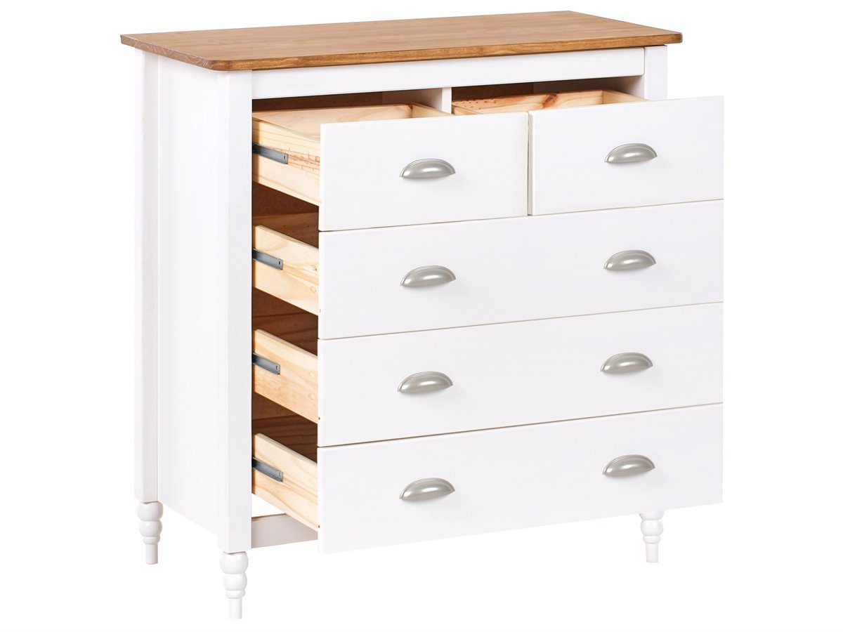 Armario de 5 cajones. Añade un toque de elegancia y funcionalidad a tu dormitorio con esta elegante cómoda. El cuerpo, las patas y el tablero están fabricados en robusta madera de pino, lo que garantiza una calidad duradera, y los tiradores son de zamak, una aleación de zinc resistente. Con una combinación atemporal de blanco y madera, combina a la perfección con interiores modernos y clásicos. Los cinco amplios cajones ofrecen espacio suficiente para guardar ropa, accesorios o utensilios domésticos, ayudándote a tenerlo todo bien organizado. La robusta encimera ofrece una superficie perfecta para adornos, una lámpara o artículos personales, lo que convierte a esta cómoda en un complemento práctico y sofisticado para cualquier hogar.