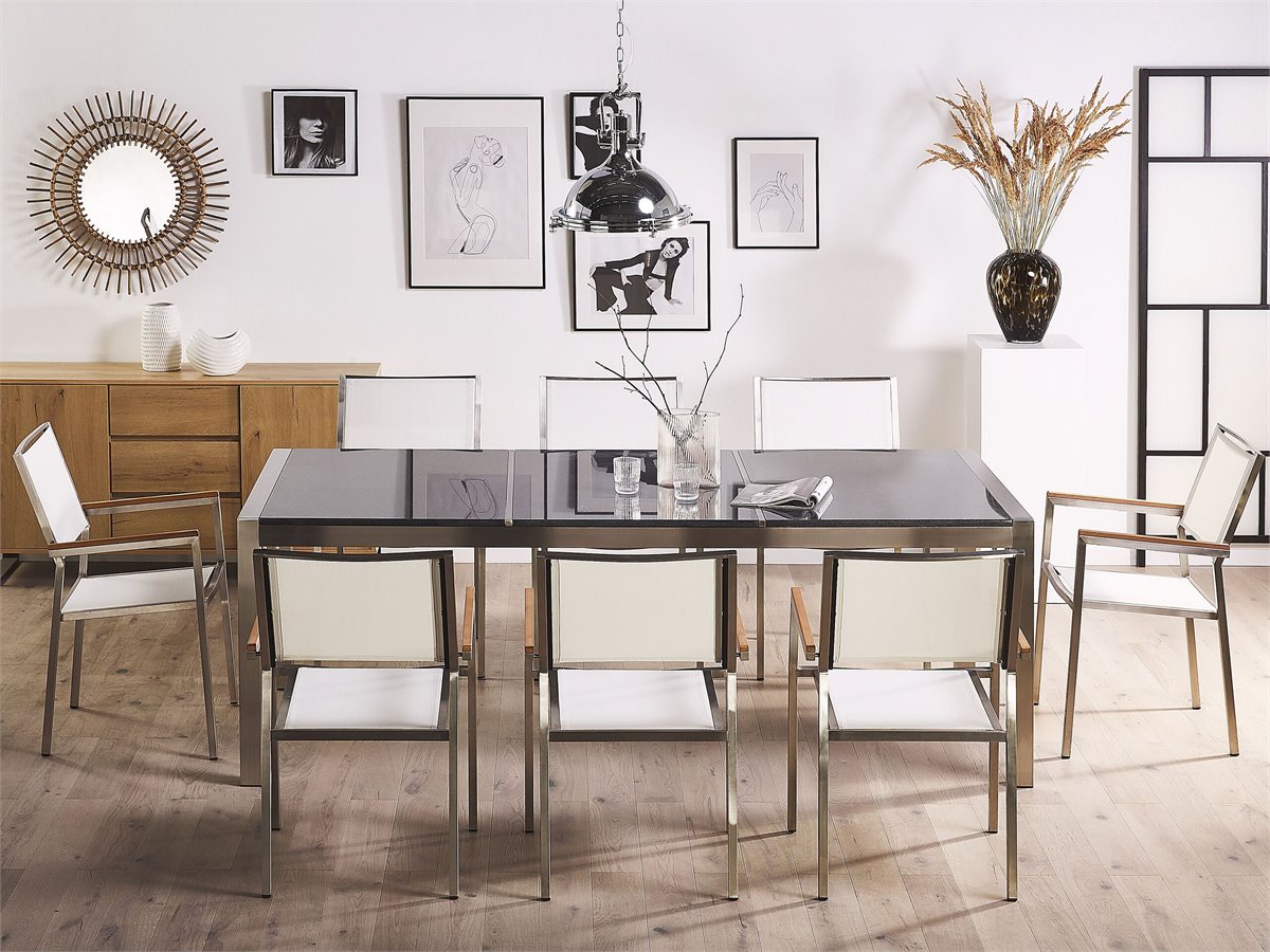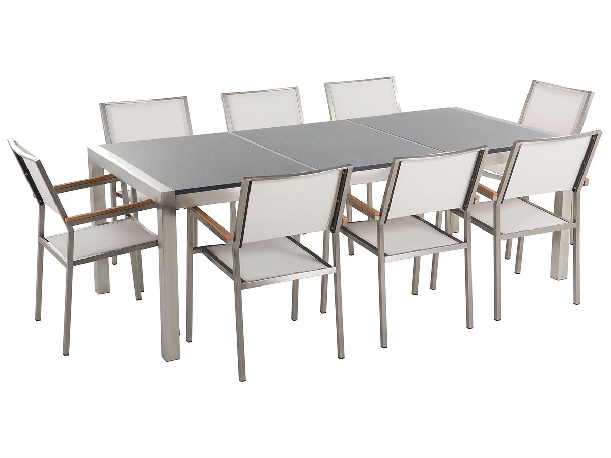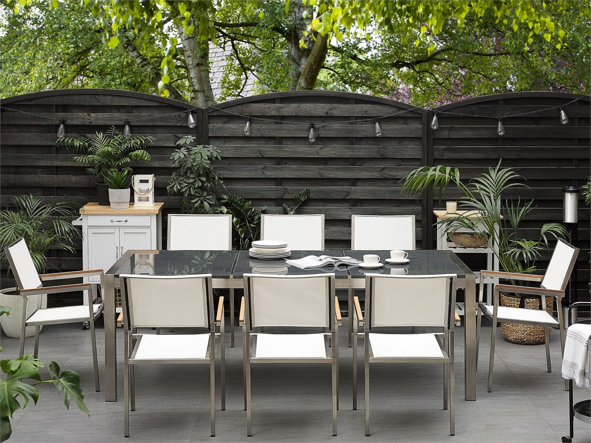Elegante conjunto de jardín. Añade elegancia a tu zona exterior con este conjunto de comedor. Está constituido por una mesa y 8 sillas. Fabricado a partir de acero inoxidable duradero y granito resistente a la intemperie. Las sillas son resistentes a los rayos UV y apilables, lo que permite ahorrar espacio.