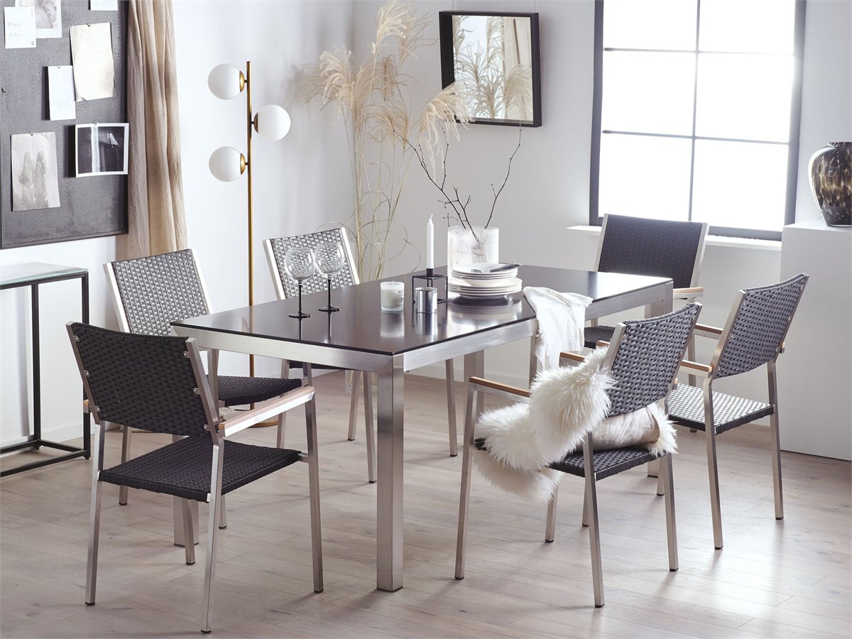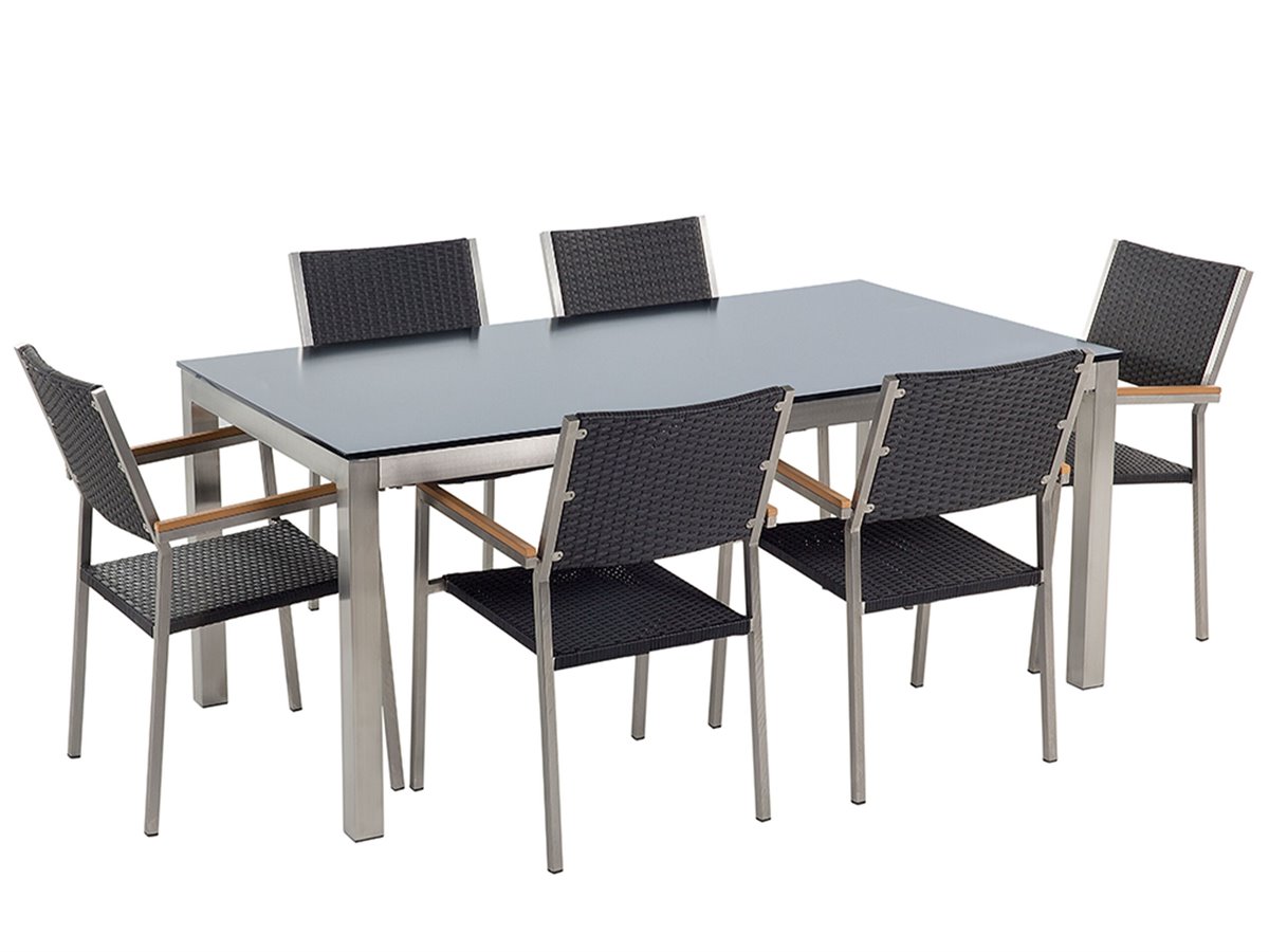 Moderno conjunto de jardín con mesa y 6 sillas. Añade elegancia a tu zona exterior con este conjunto de comedor. Está constituido por una mesa y 6 sillas. Fabricado a partir de acero inoxidable duradero y vidrio templado. Las sillas son resistentes a los rayos UV y apilables, lo que permite ahorrar espacio.