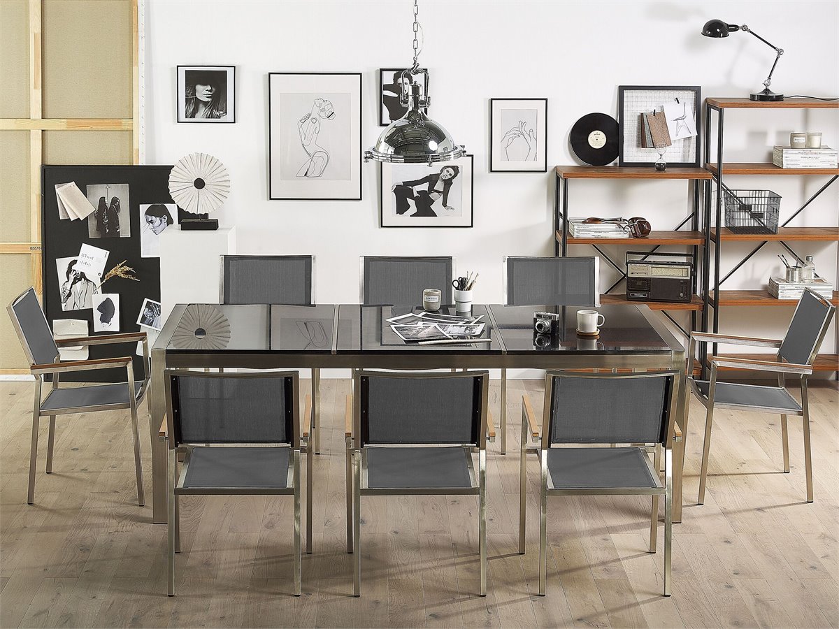 Elegante conjunto de jardín. Añade elegancia a tu zona exterior con este conjunto de comedor. Está constituido por una mesa y 8 sillas. Fabricado a partir de acero inoxidable duradero y granito resistente a la intemperie. Las sillas son resistentes a los rayos UV y apilables, lo que permite ahorrar espacio.