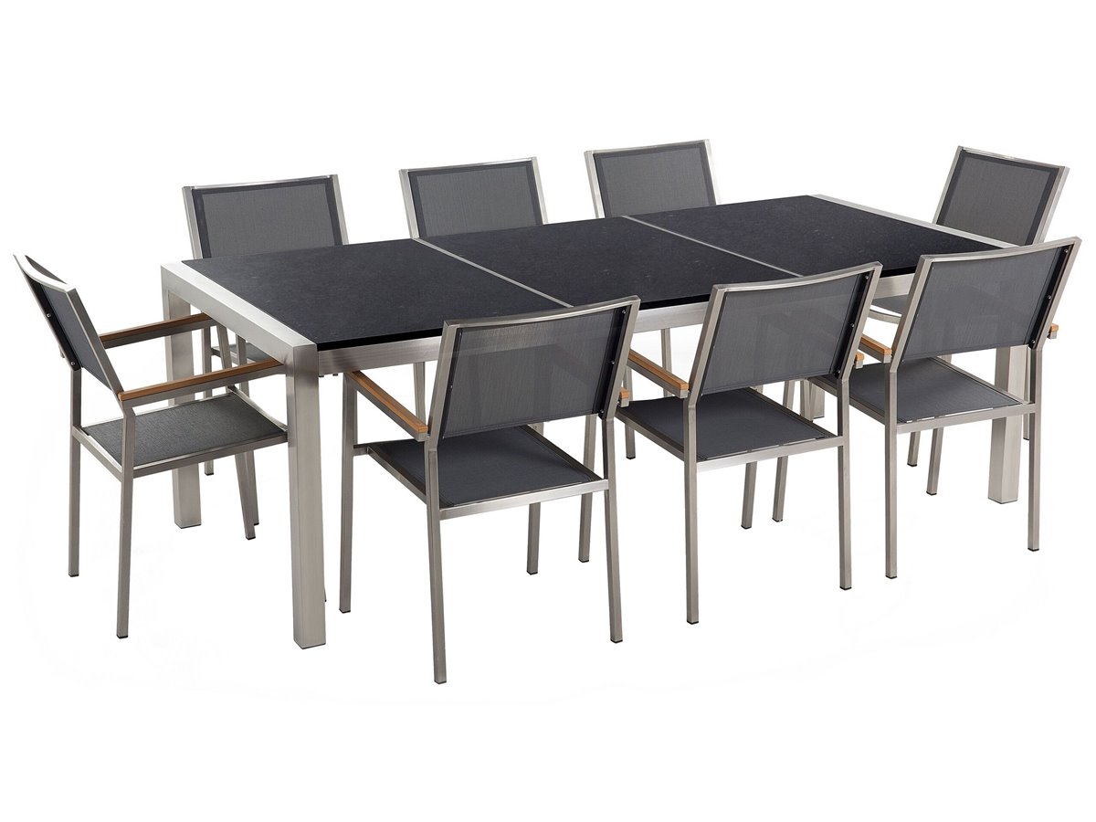 Elegante conjunto de jardín . Añade elegancia a tu zona exterior con este conjunto de comedor. Está constituido por una mesa y 8 sillas. Fabricado a partir de acero inoxidable duradero y granito resistente a la intemperie. Las sillas son resistentes a los rayos UV y apilables, lo que permite ahorrar espacio.