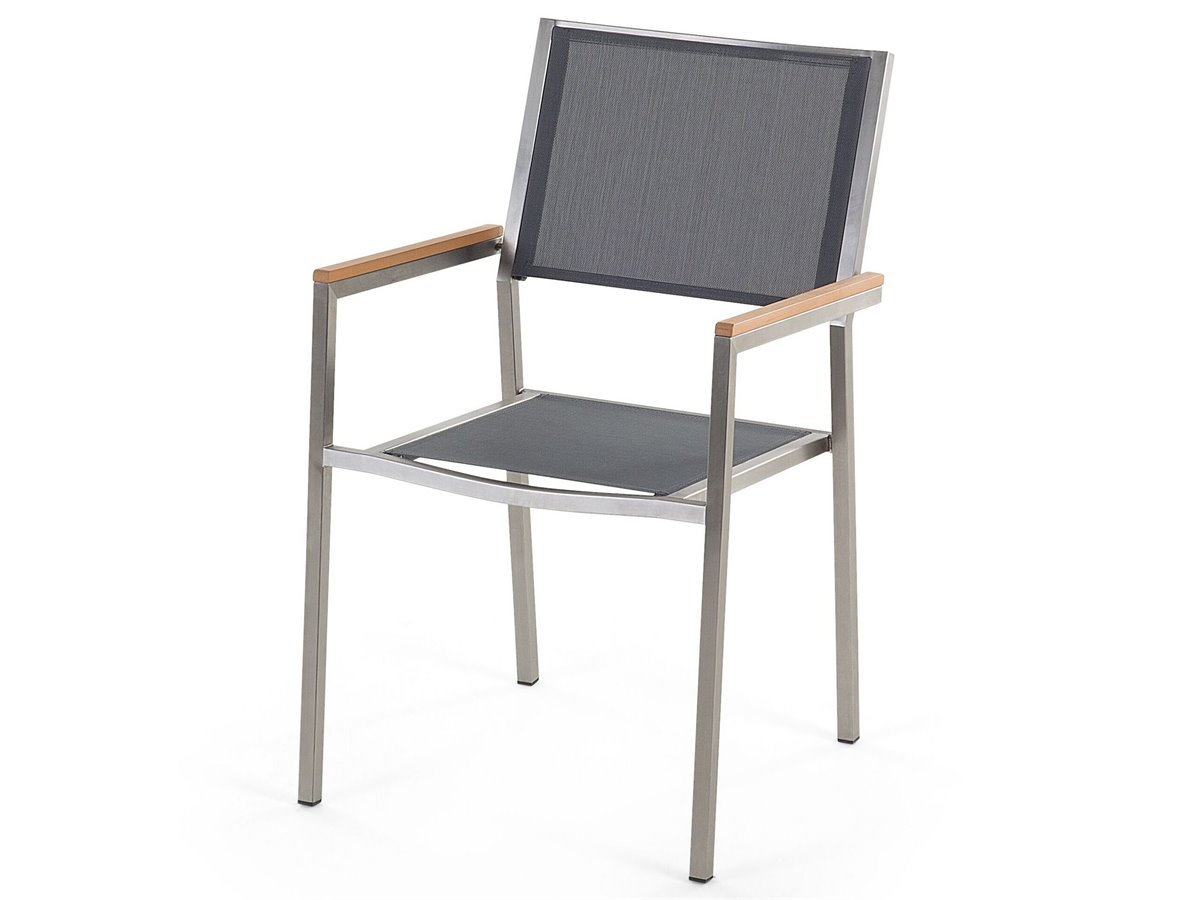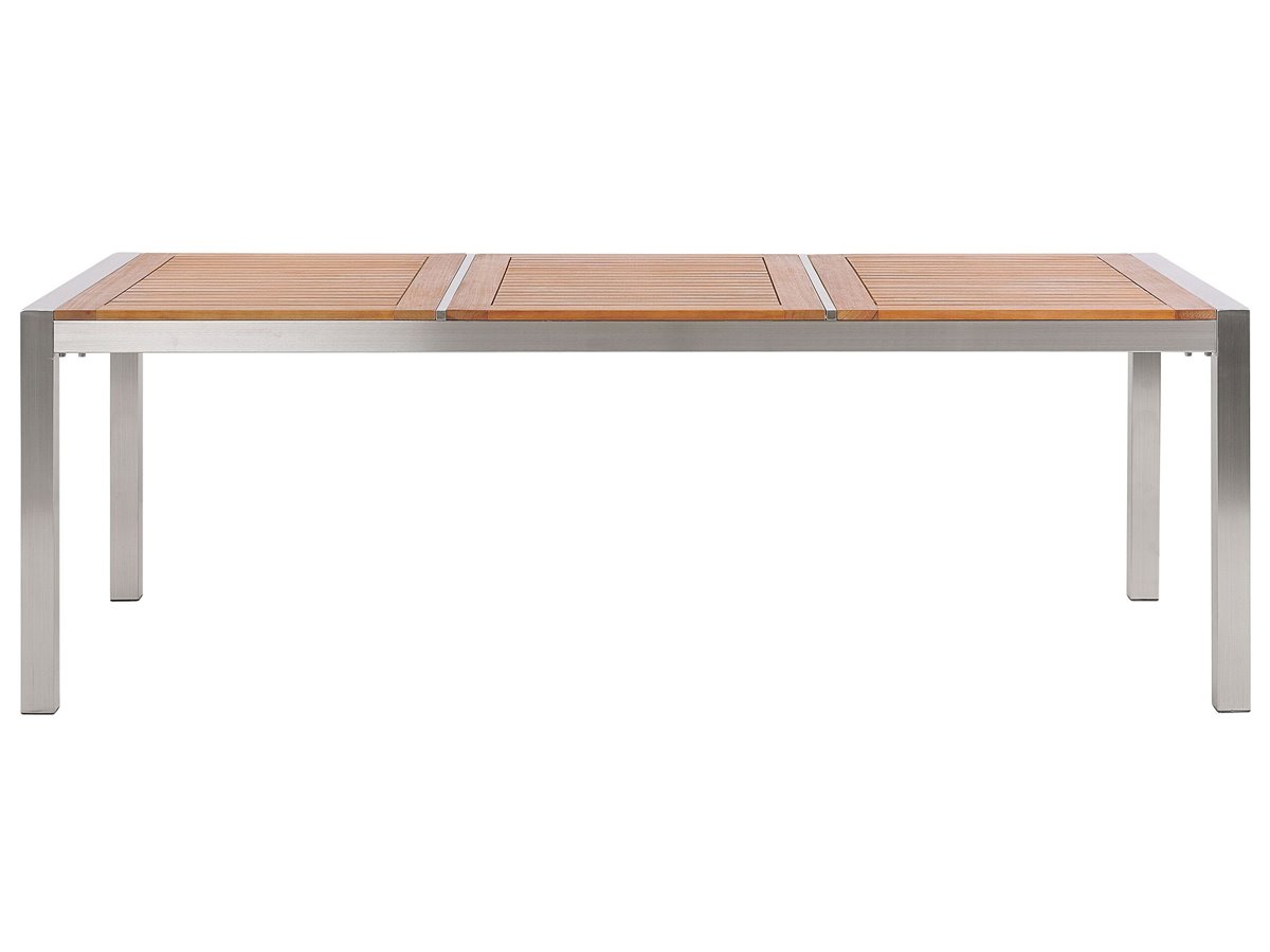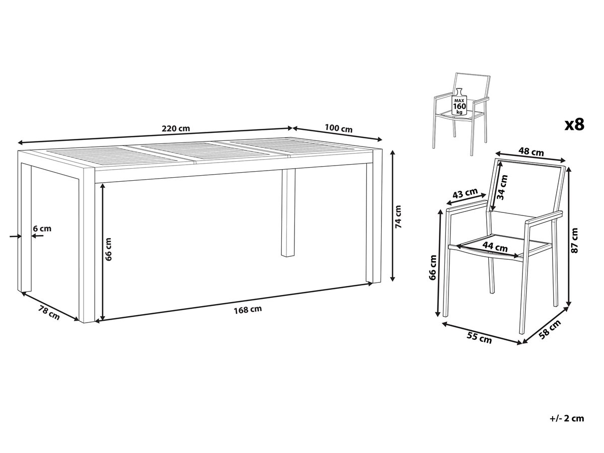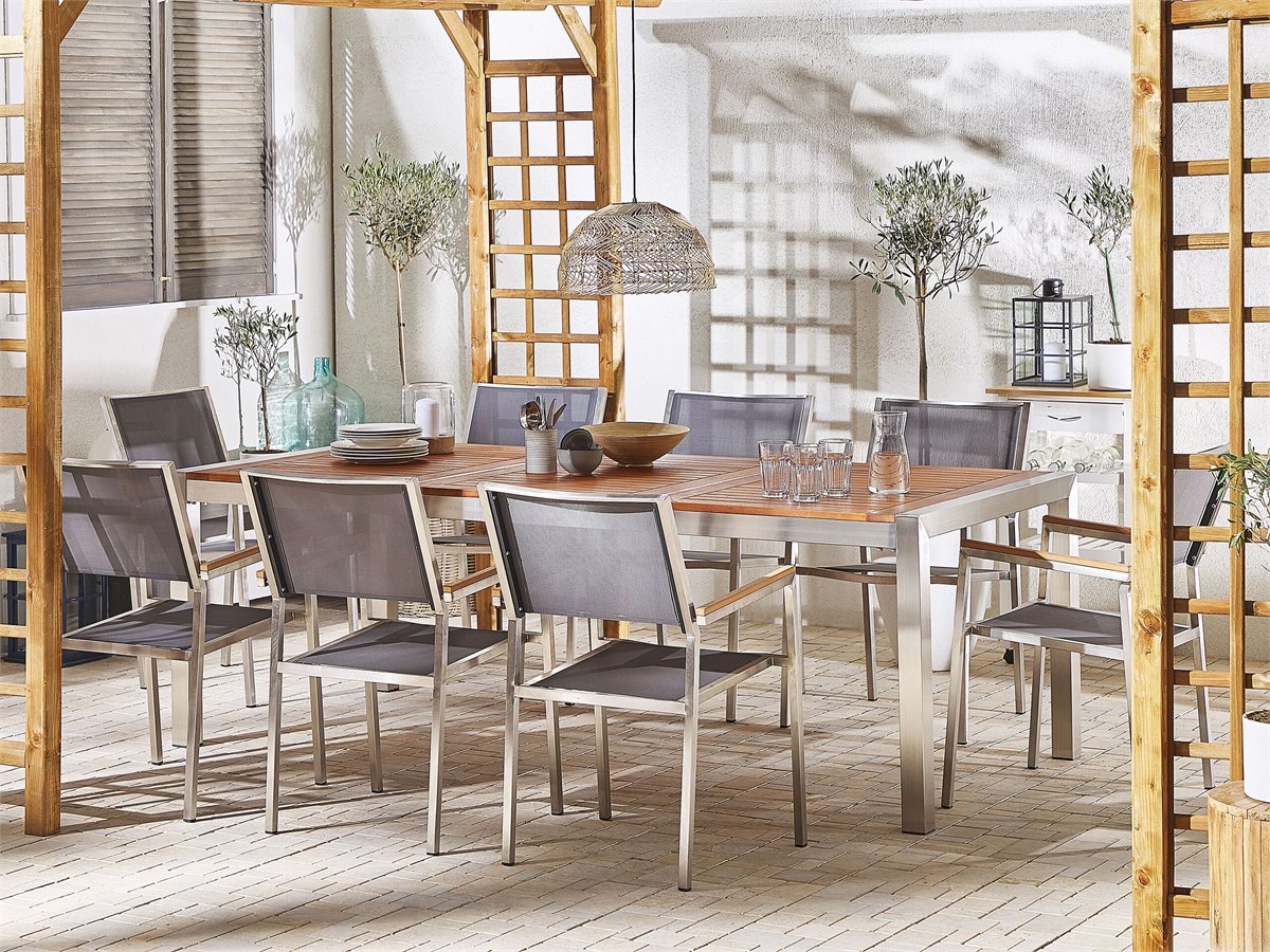 Moderno conjunto de jardín de mesa y 8 sillas. Añade elegancia a tu zona exterior con este conjunto de comedor. Está constituido por una mesa y 8 sillas. Fabricado a partir de acero inoxidable duradero y madera de eucalipto resistente a la intemperie. Las sillas son resistentes a los rayos UV y apilables, lo que permite ahorrar espacio.