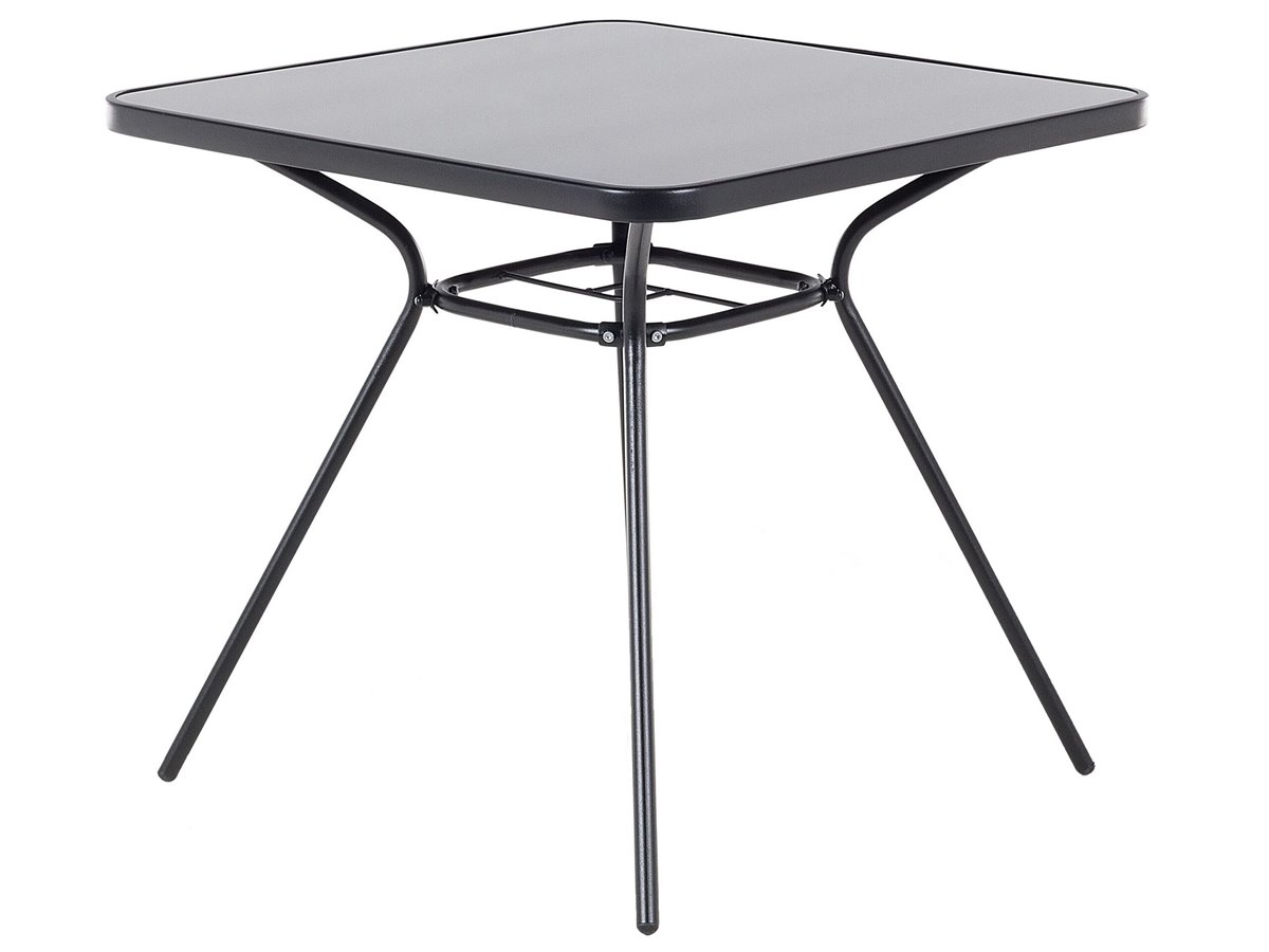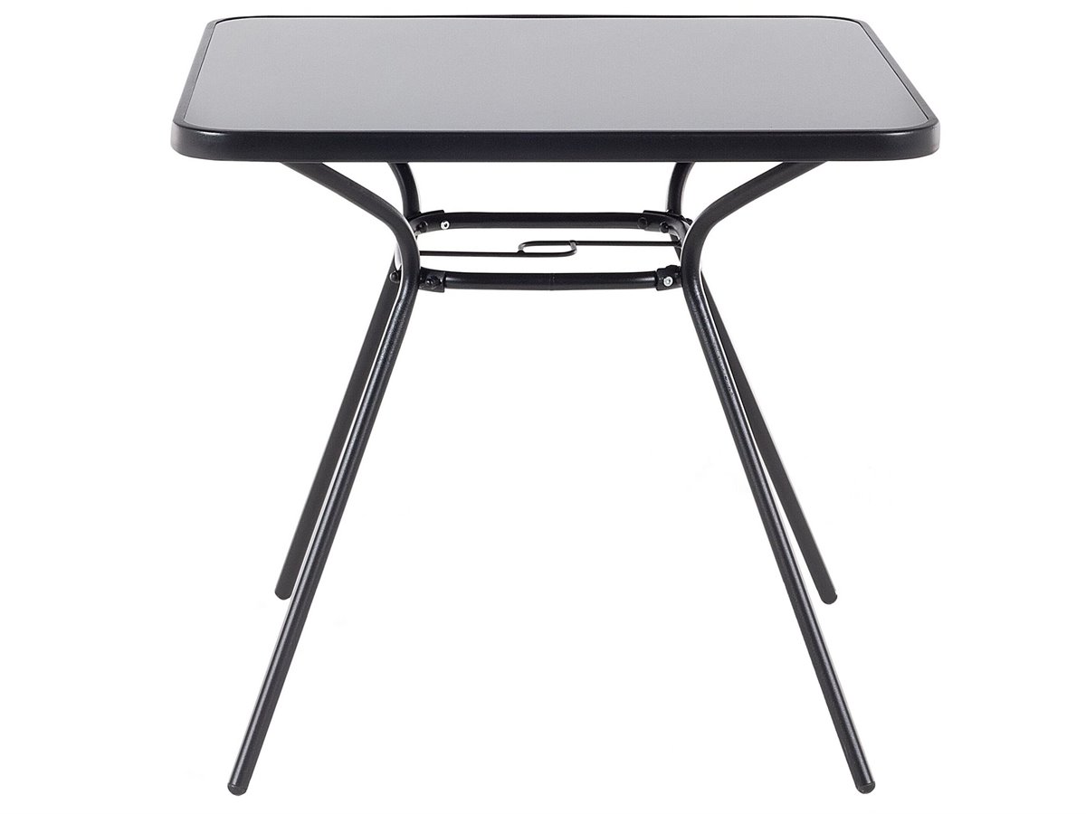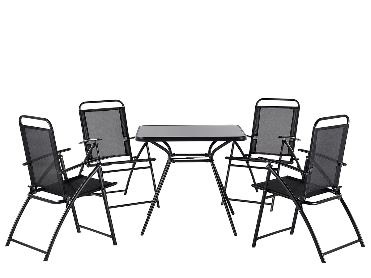 Conjunto muebles de jardín de una mesa y 4 sillas. Este práctico conjunto está compuesto por una mesa y 4 sillas, ofreciendo muchísimas posibilidades de organización para tu exterior. Elaborado de materiales de la más alta calidad, el conjunto cuenta con una elegante mesa con estructura en metal y tablero en vidrio templado, y 4 confortables sillas. El mueble será la elección ideal para tu jardín o una terraza. Gracias al revestimiento en polvo antioxidante, el juego resiste a la intemperie, garantizándole una larga vida útil.