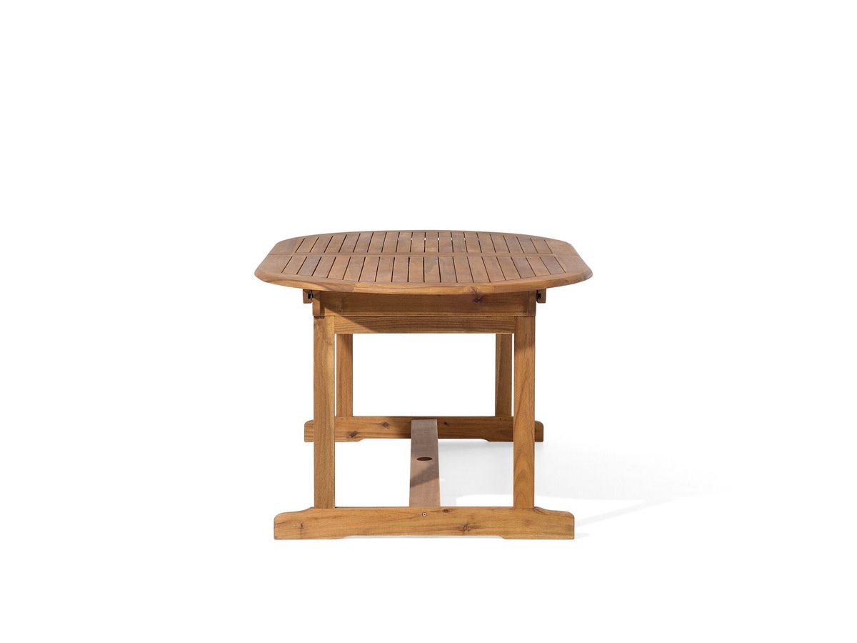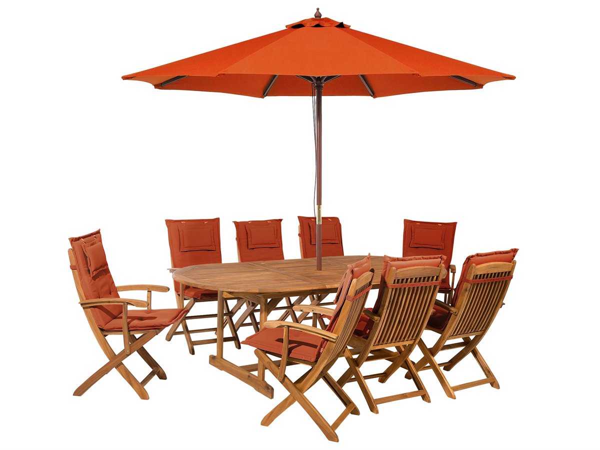 Conjunto de jardín de madera de acacia con cojines y sombrilla. El conjunto de jardín incluye una mesa ovalada, 8 cómodas sillas con reposabrazos y 8 elegantes y cómodos cojines. El diseño atemporal y la alta calidad harán que el juego sea la pieza central de tu hogar. Todas las elementos son resistentes y fácil de conservar. La mesa tiene una abertura en la parte superior y un elemento estabilizador para la base de una sombrilla. Las 8 sillas cuentan con reposabrazos ergonómicos, proporcionando espacio y la máxima comodidad para todos tus invitados. Este conjunto convertirá tu exterior en el sitio ideal para disfrutar.