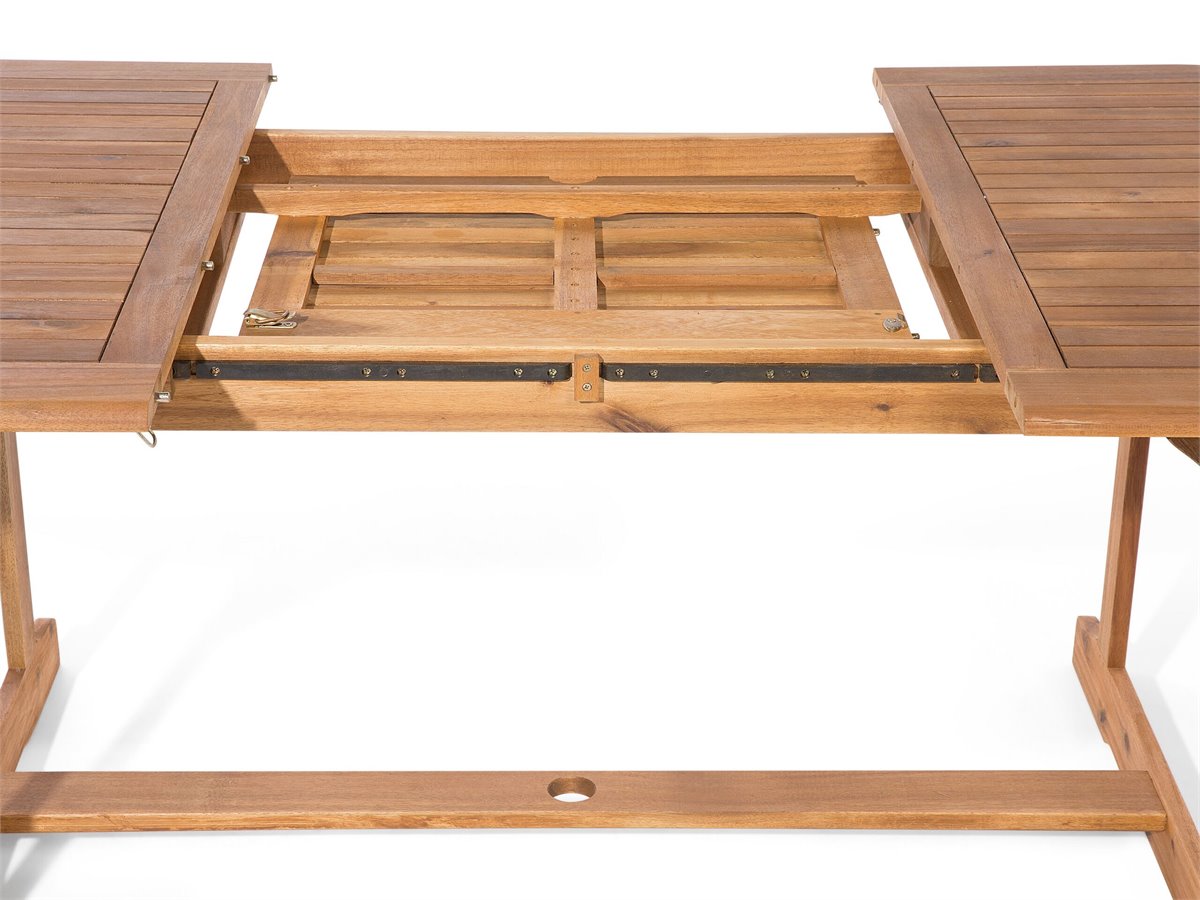 Ventajas: Ideal para grandes reuniones con amigos y familiares, Tablero con agujero para sombrilla, Las tiras ofrecen una fijación segura, Reposabrazos ajustados, Diseño atemporal, Materiales de la más alta calidad, Resistencia UV 5 (ISO 105-B02), Para mantener su calidad, debe protegerse del agua y la lluvia, Plegable para un fácil almacenamiento, La mesa extensible proporciona espacio adicional