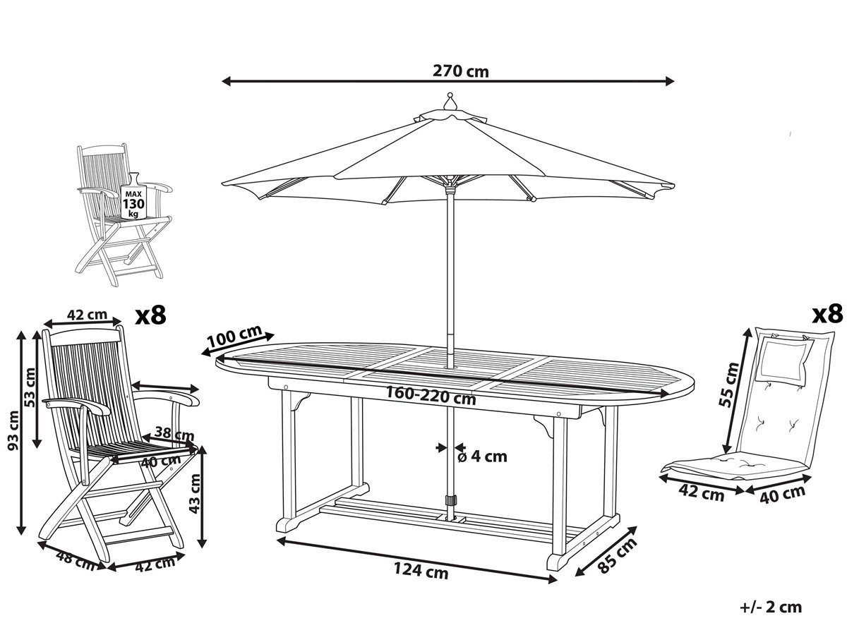 La oferta incluye: 1 x Mesa, 8 x Silla, 8 x Cojín del asiento, 1 x Sombrilla, No incluye: base para la sombrilla