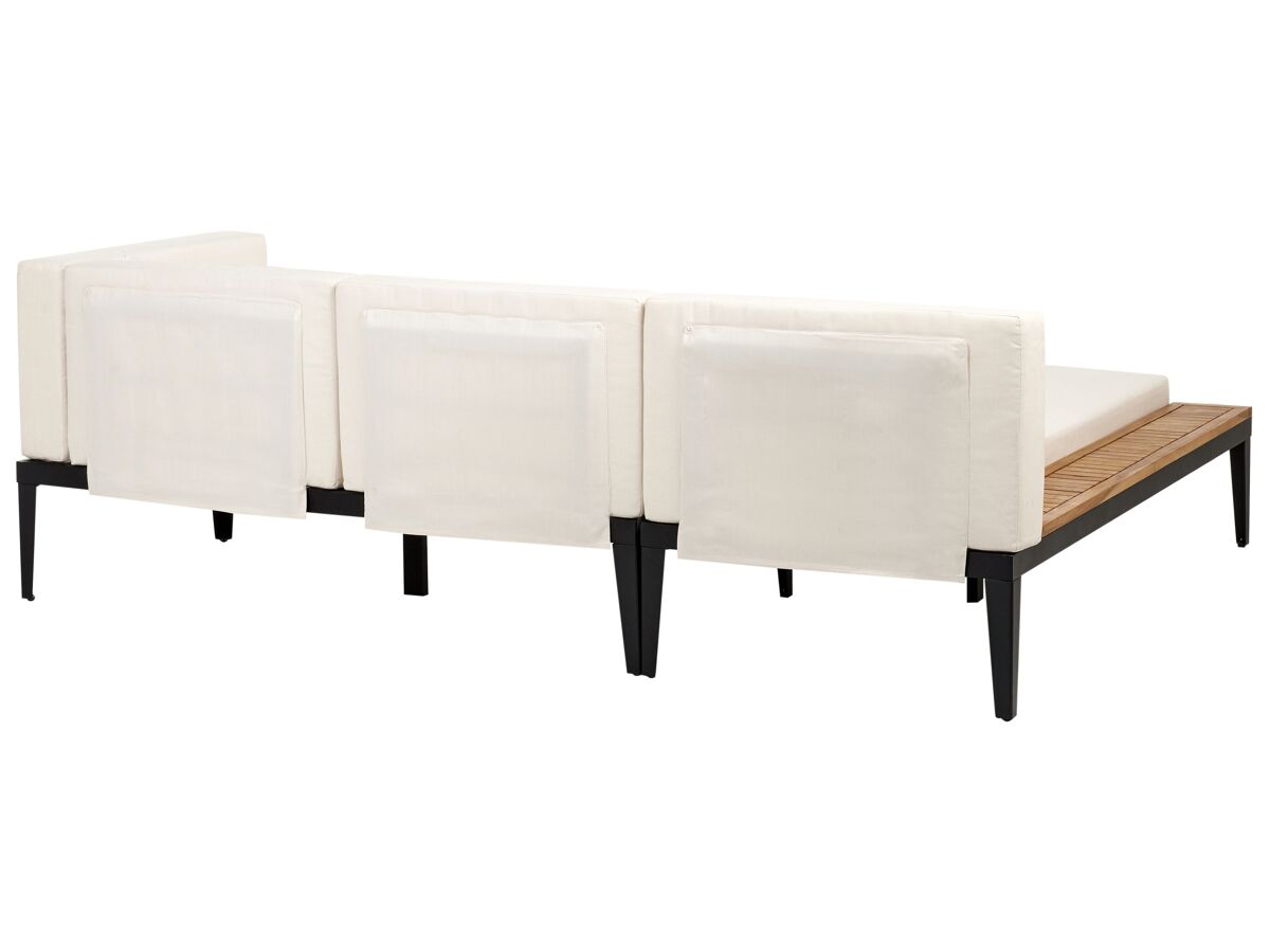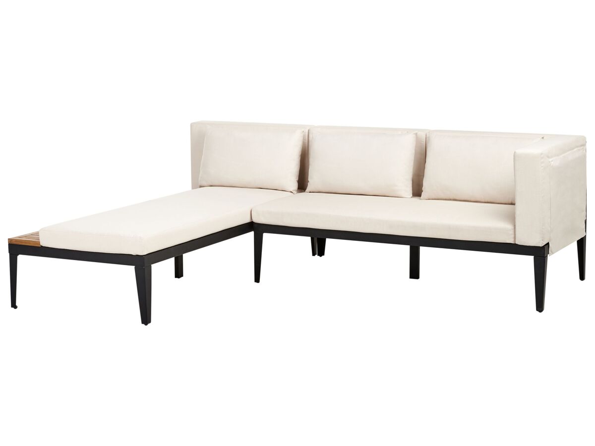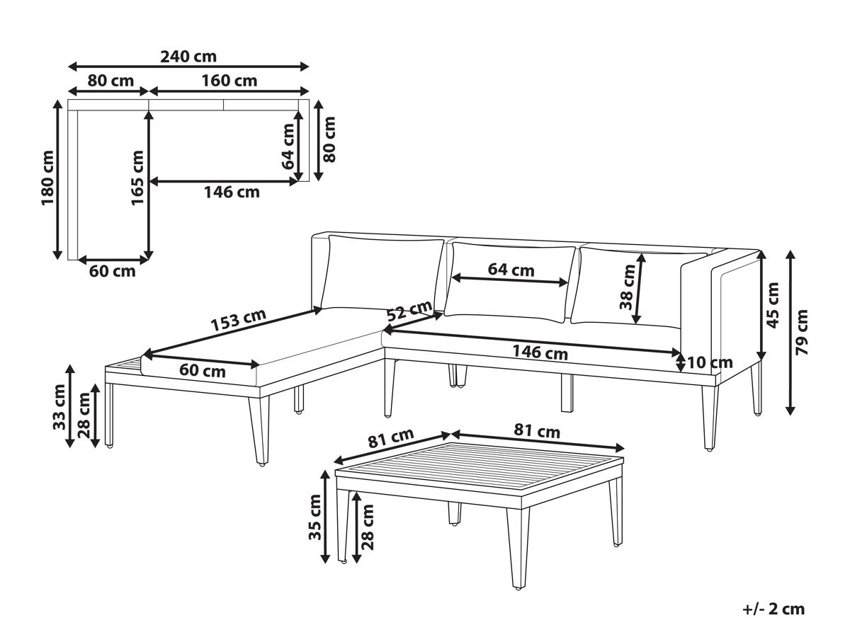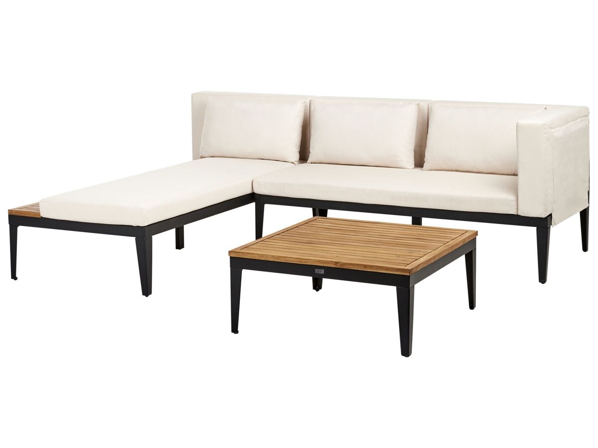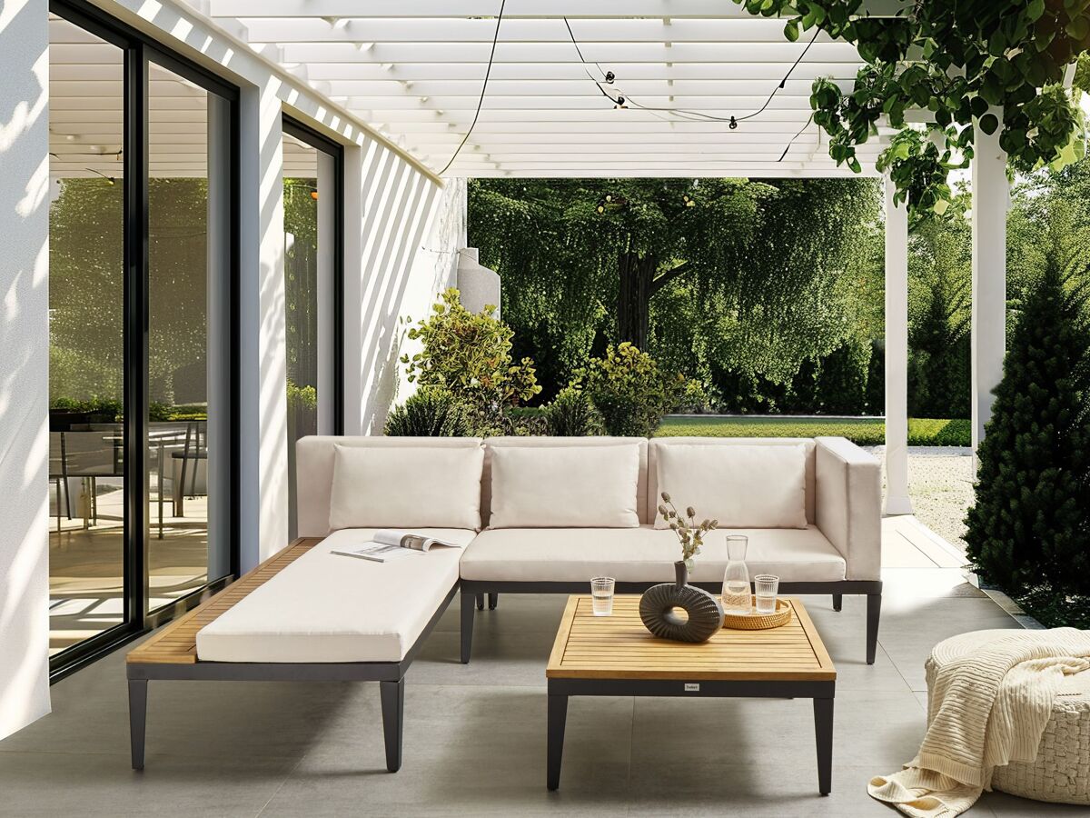 Juego de sofá con mesa de centro. Este conjunto de jardín cuenta con un diseño minimalista, por lo que es un complemento perfecto para cualquier espacio al aire libre, ya sea un exuberante jardín verde o una elegante terraza industrial. Construido sobre una robusta estructura de aluminio, el sofá esquinero cuenta con una sección no tapizada fabricada en madera de acacia certificada, ideal para guardar bebidas, gafas de sol, libros u otros objetos esenciales. Los cojines incluidos están confeccionados por expertos y ofrecen la comodidad de un sofá de salón gracias a su grueso acolchado. El conjunto se completa con una mesa de centro cuadrada de tamaño perfecto, ideal para disfrutar de un almuerzo al aire libre.
