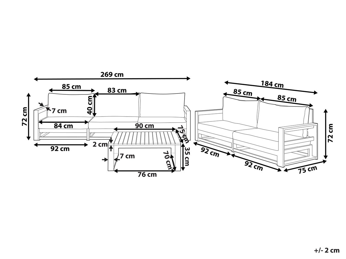 La oferta incluye: 1 x Mesa de centro, 1 x Sofá de 3 plazas, 1 x Sofá de 2 plazas, Cojines incluidos