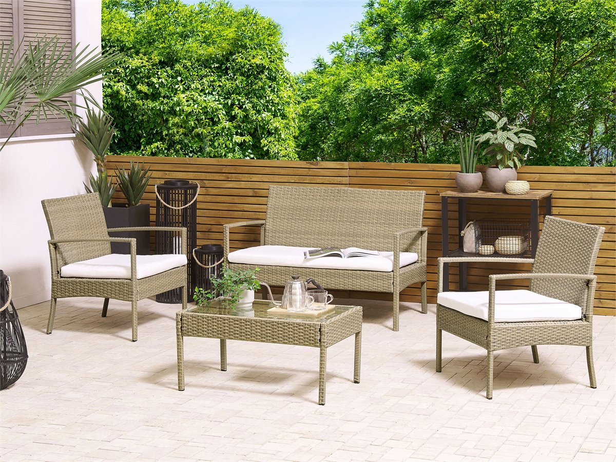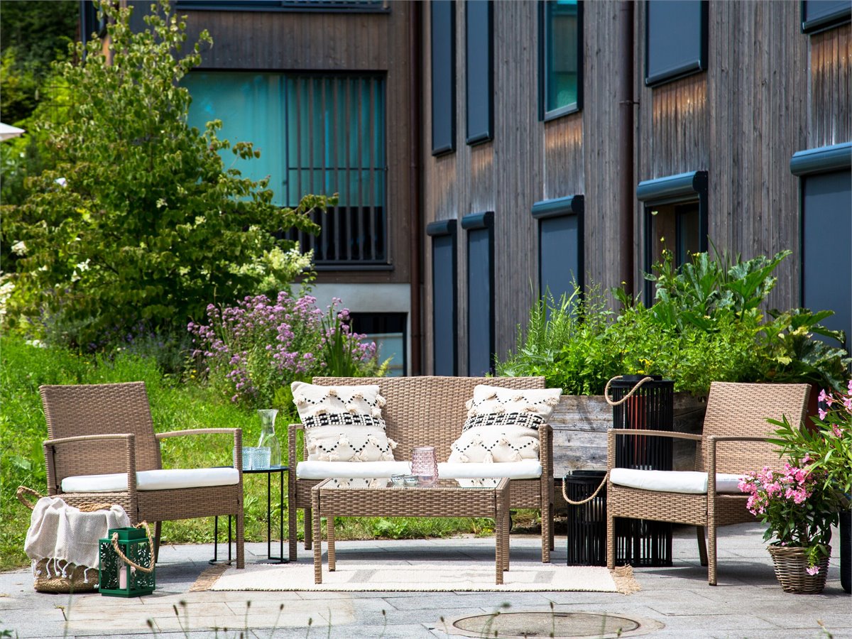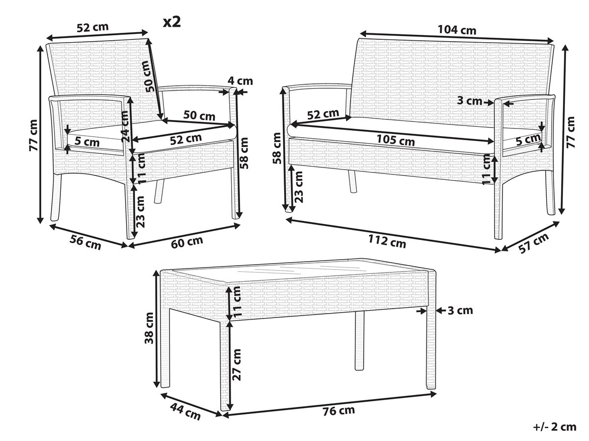 La oferta incluye: 1 x Mesa de centro, 1 x Sofá de 2 plazas, 2 x Sillón, 3 x Cojín del asiento