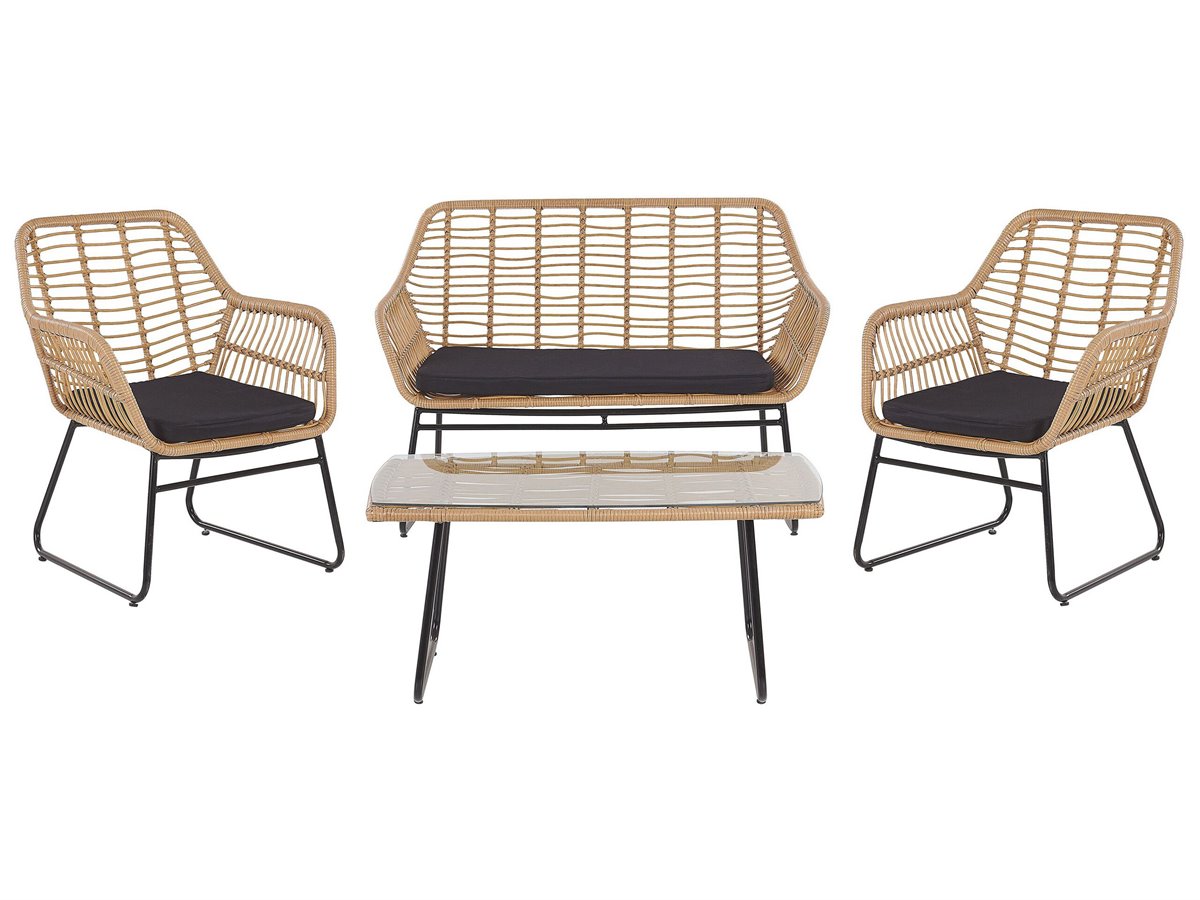 Conjunto de jardín rústico. Disfruta más de tu zona exterior con este conjunto. Compuesto por un sofá y dos sillones, ofrece espacio suficiente para 4 personas, y la mesa de centro incluida te permite ofrecer a tus invitados aperitivos y bebidas mientras os relajáis. Los suaves cojines de los asientos mejoran la experiencia elevando el confort.
