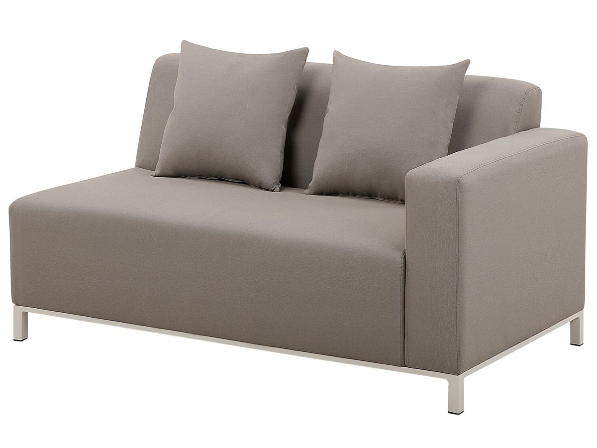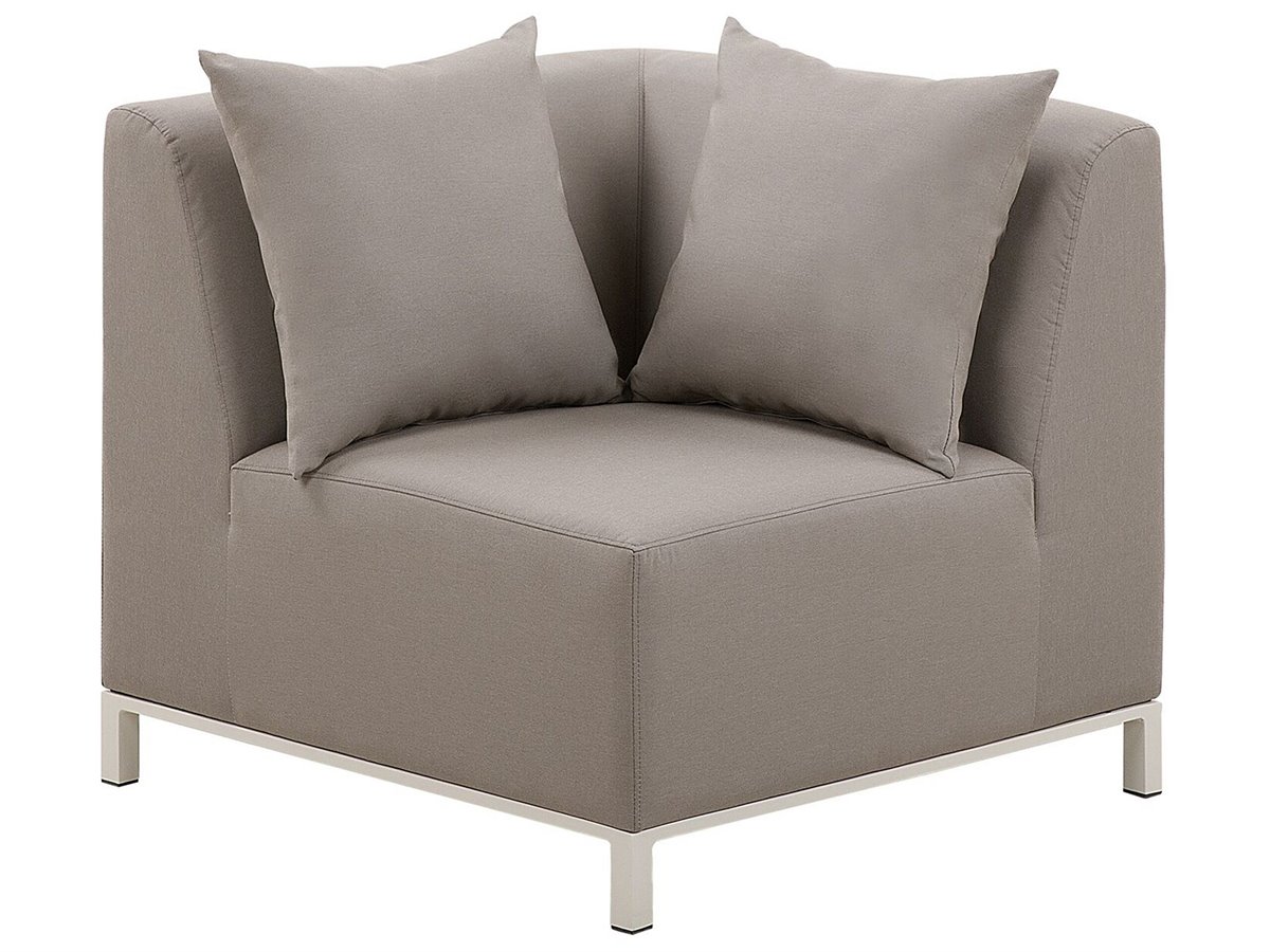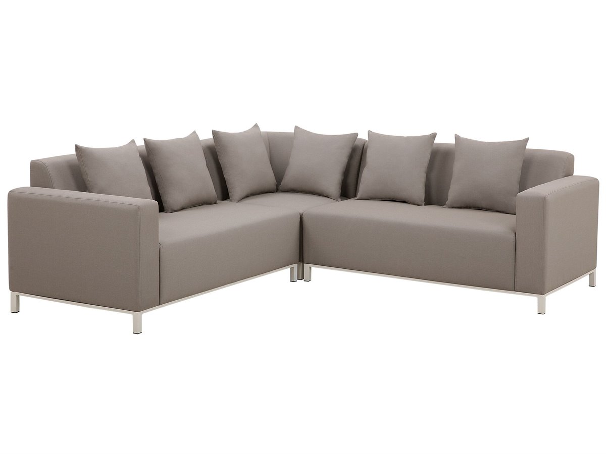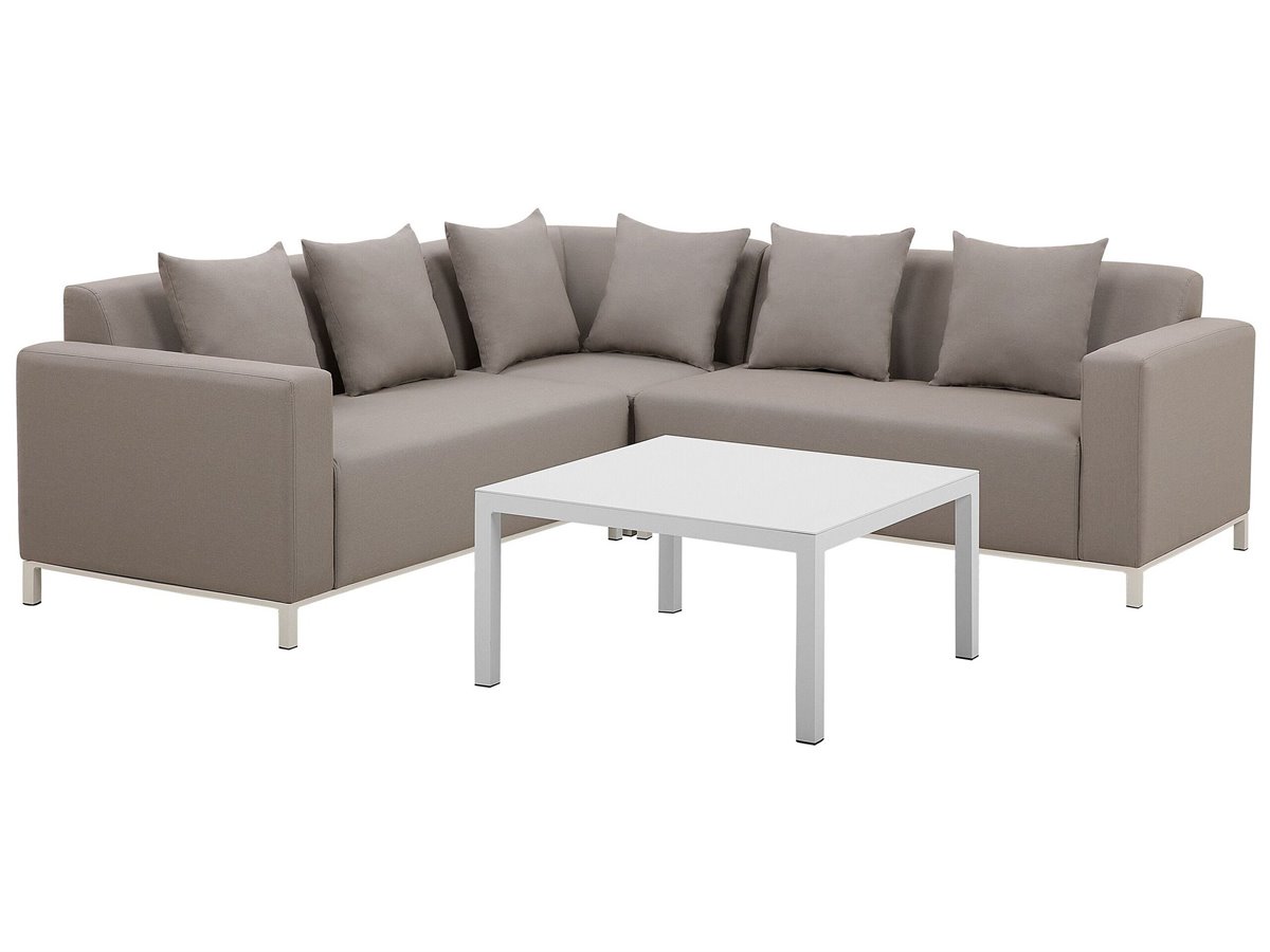 Conjunto de muebles de exterior. Mejora tu área al aire libre con este conjunto de descanso. El sofá esquinero ofrece mucho espacio para hasta 5 personas y se puede configurar como desees. Tapizado en tela de poliéster duradera en un elegante color gris pardo, es altamente resistente a los rayos UV y fácil de cuidar. El conjunto viene con una mesa de centro a juego hecha de aluminio con recubrimiento de polvo en color blanco crema y cojines adicionales que aumentan la comodidad de la pieza. Su relleno de espuma de secado rápido aumenta la resistencia de los muebles a la lluvia y a diversas condiciones climáticas. Gracias a su diseño moderno y minimalista, se adapta fácilmente a varios estilos de decoración de jardines.