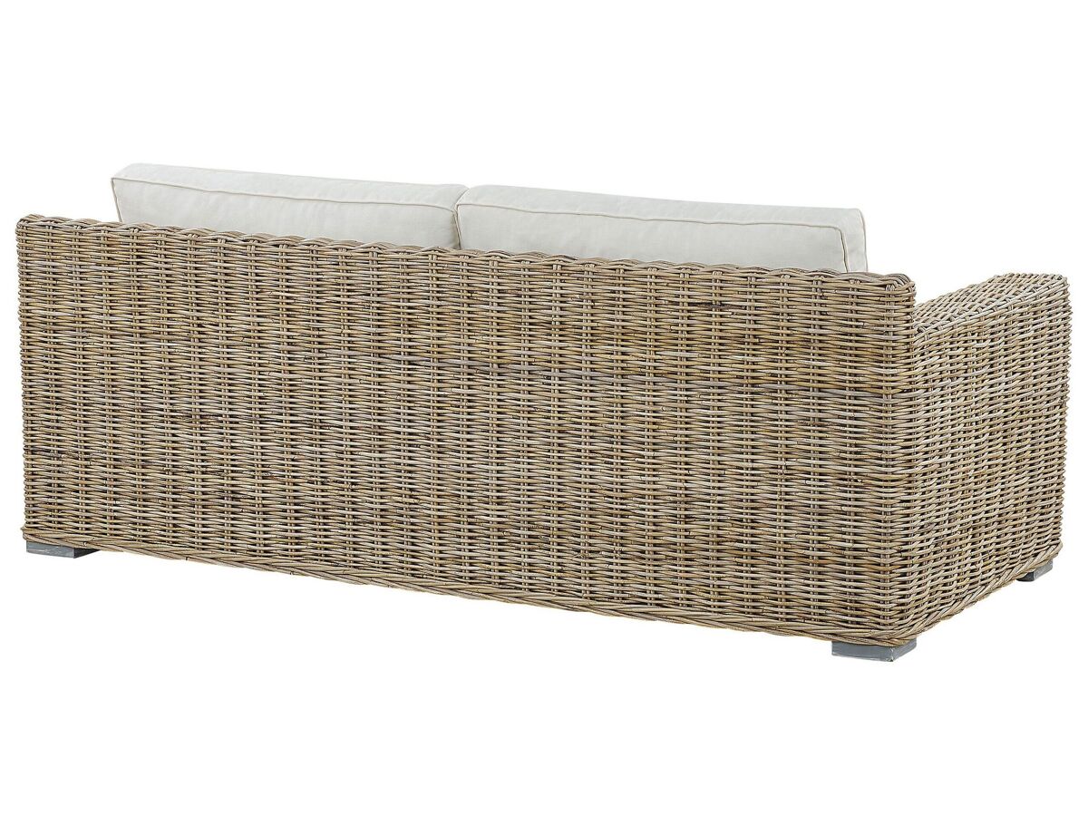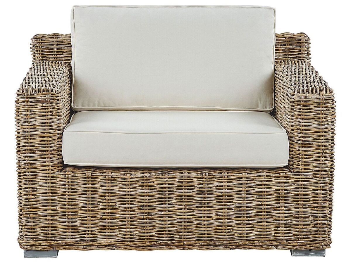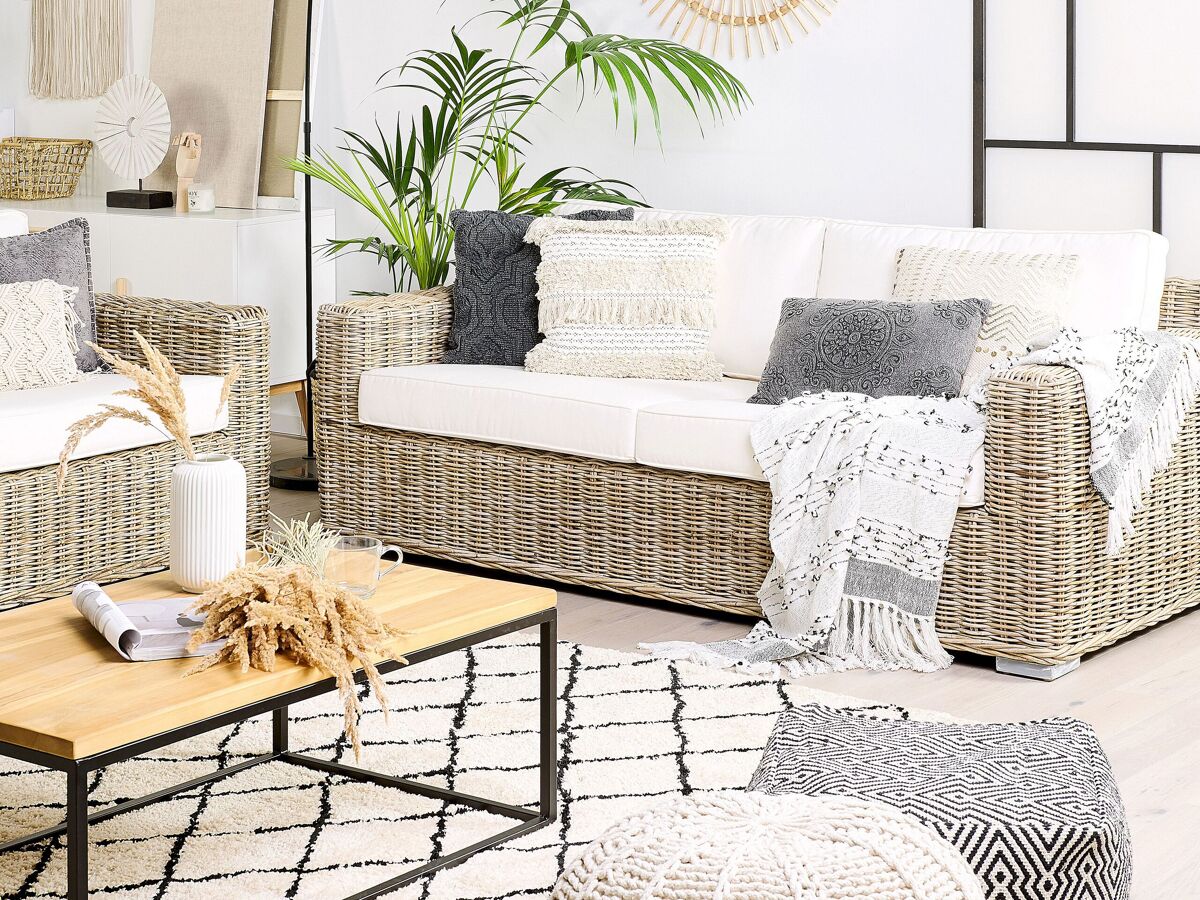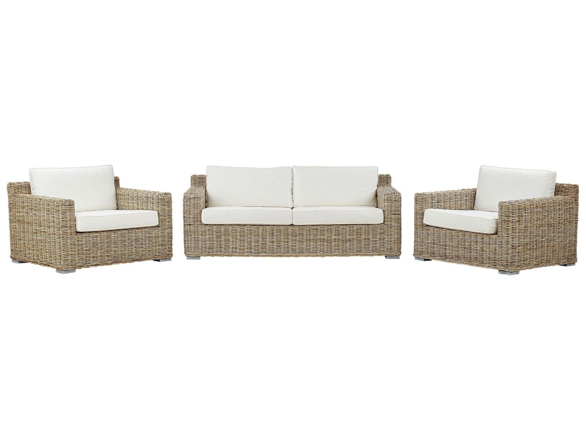 Juego de ratán natural. Vuelve la tendencia del ratán de los años 70. Reencarnada en el diseño más confortable, se presenta en este conjunto de 4 piezas. Incluye un sofá y dos sillones, y crea una acogedora zona de ocio donde puedes celebrar una pequeña fiesta o disfrutar relajándote. Confeccionado en mimbre natural de madera clara, el conjunto aporta un atractivo vintage y una sensación nostálgica. Equipado con gruesos cojines de color blanco crema, generosamente rellenos para proporcionar el mismo nivel de comodidad que en los asientos de interior.