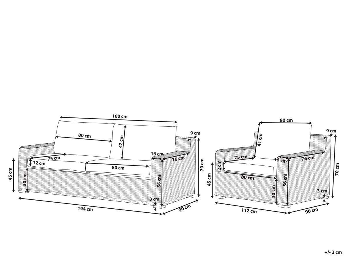 Dimensiones del sofá de 2 plazas: 194x90x70