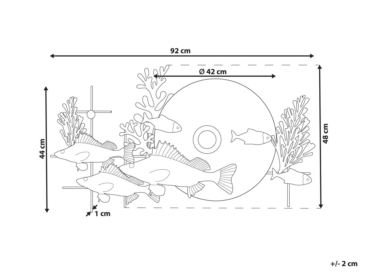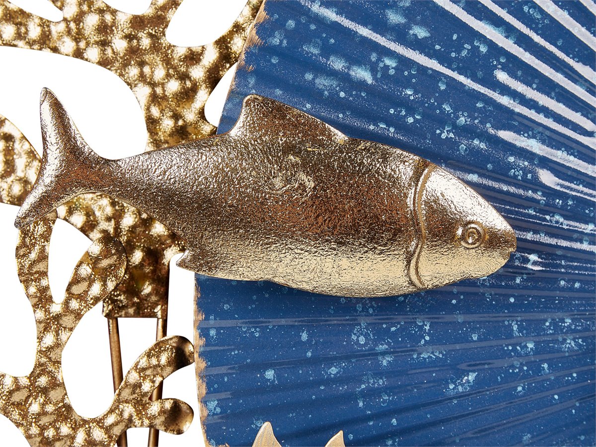Decoración de metal hecha a mano. Actualiza tu hogar añadiendo esta exclusiva decoración colgante a una de tus paredes. Esta pieza de metal hecha a mano presenta una cautivadora escena acuática, con peces y detalles de arrecifes de coral, realzada con pintura dorada. Este adorno de pared quedará increíble en salones de inspiración moderna o mediterránea y añadirá un toque de color a tu interior.