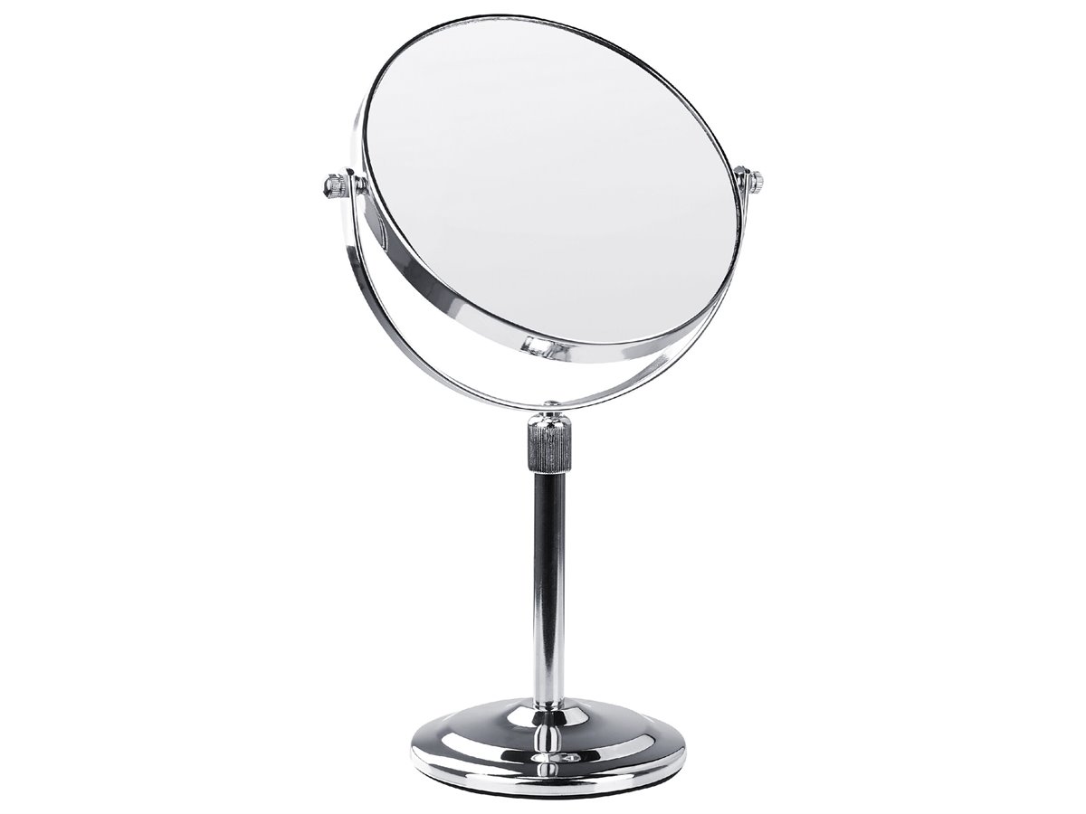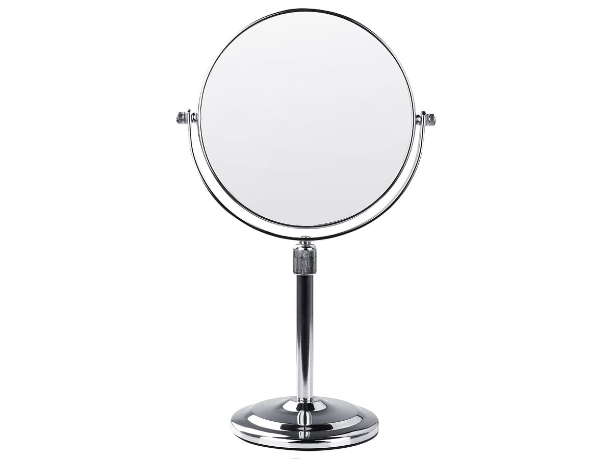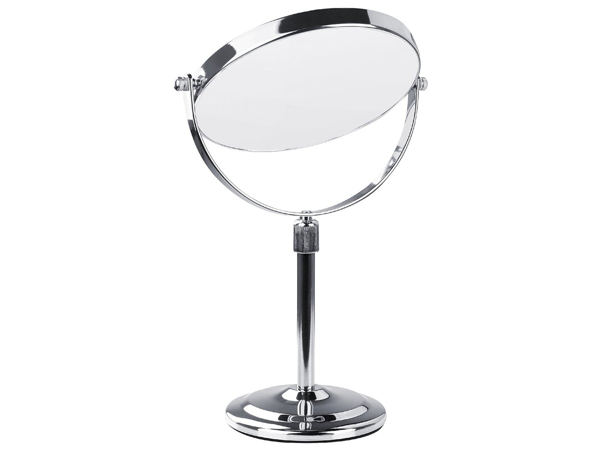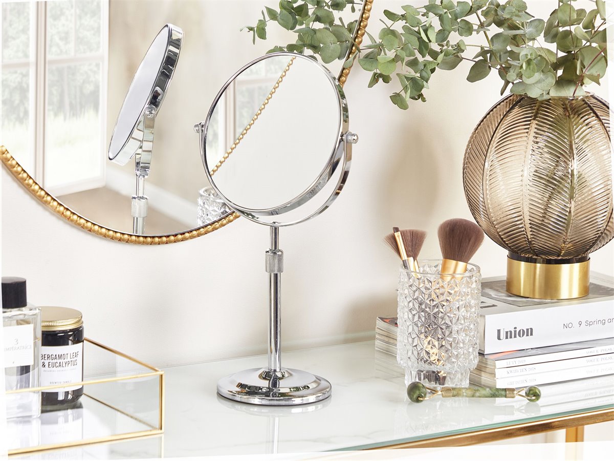 Espejo de baño. Añade funcionalidad y modernidad a tu baño o tocador con este espejo de maquillaje. Está fabricado a partir de metal brillante y resistente. Es reversible y ajustable en altura. La superficie de doble cara ofrece un aumento de 1X o 2X.