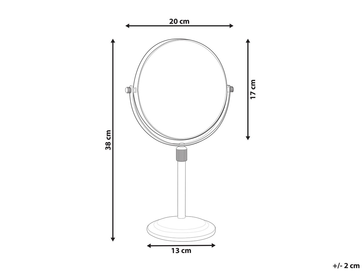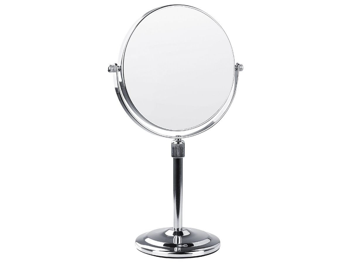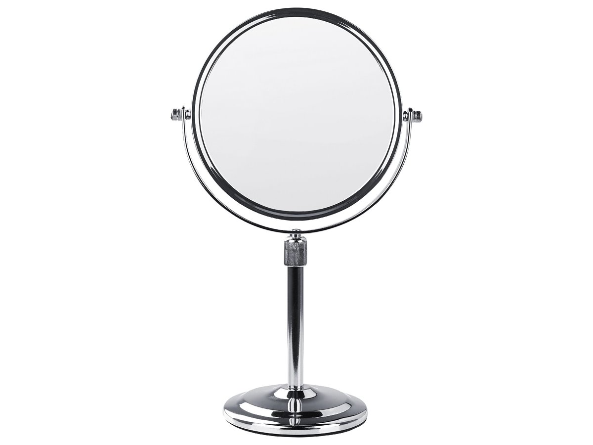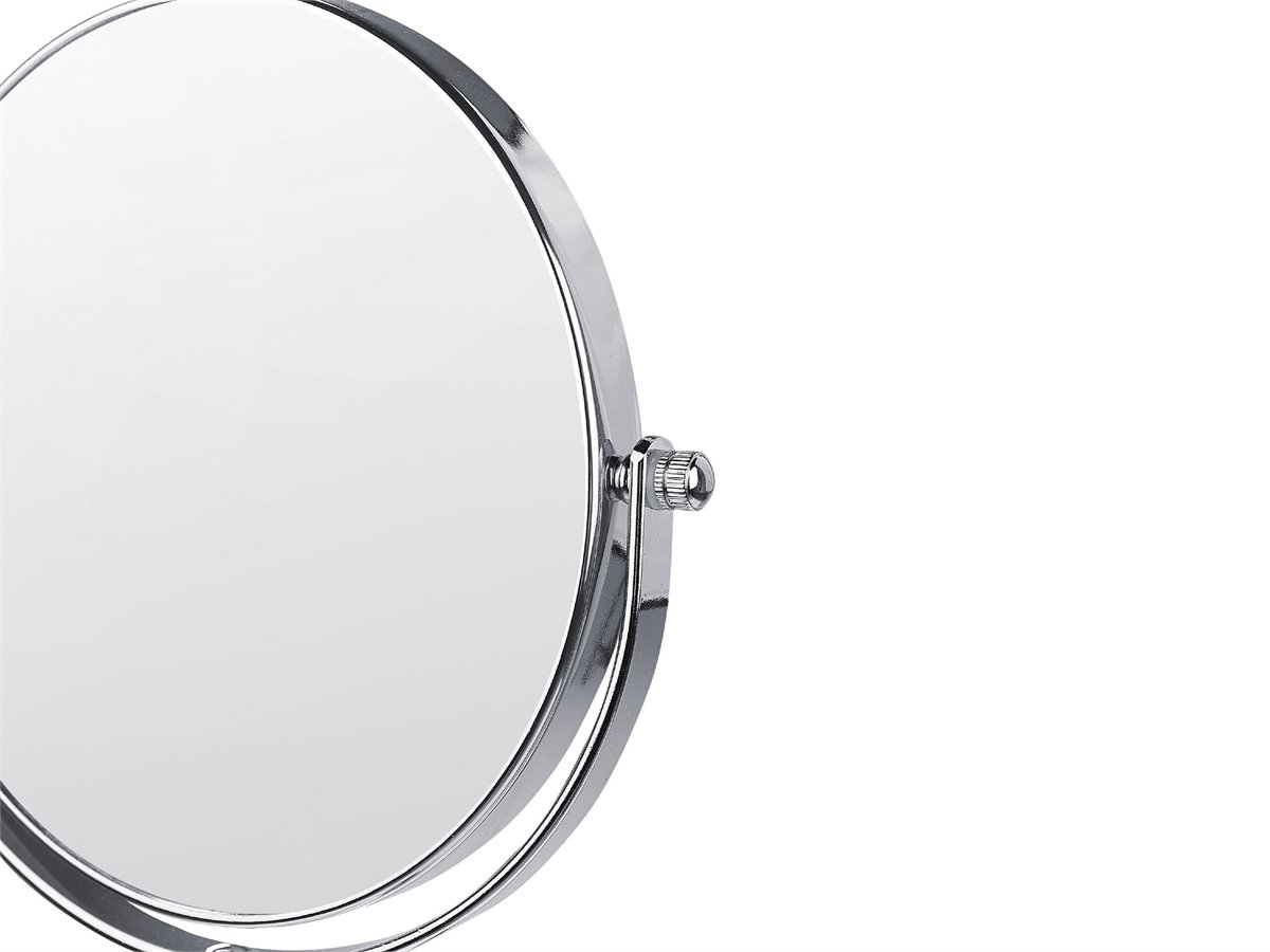 Espejo de baño. Añade funcionalidad y modernidad a tu baño o tocador con este espejo de maquillaje. Está fabricado a partir de metal brillante y resistente. Es reversible y ajustable en altura. La superficie de doble cara ofrece un aumento de 1X o 2X.