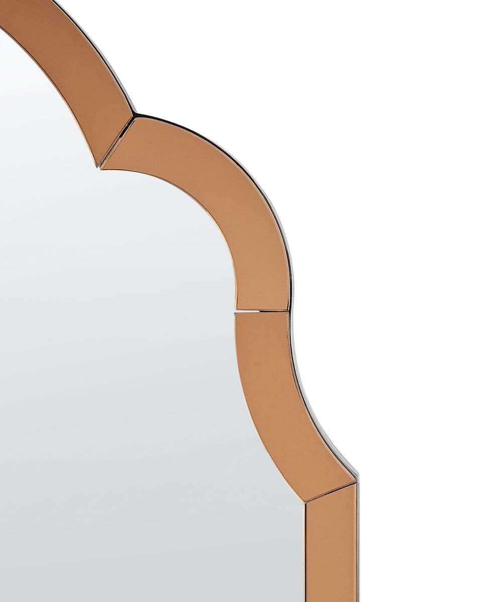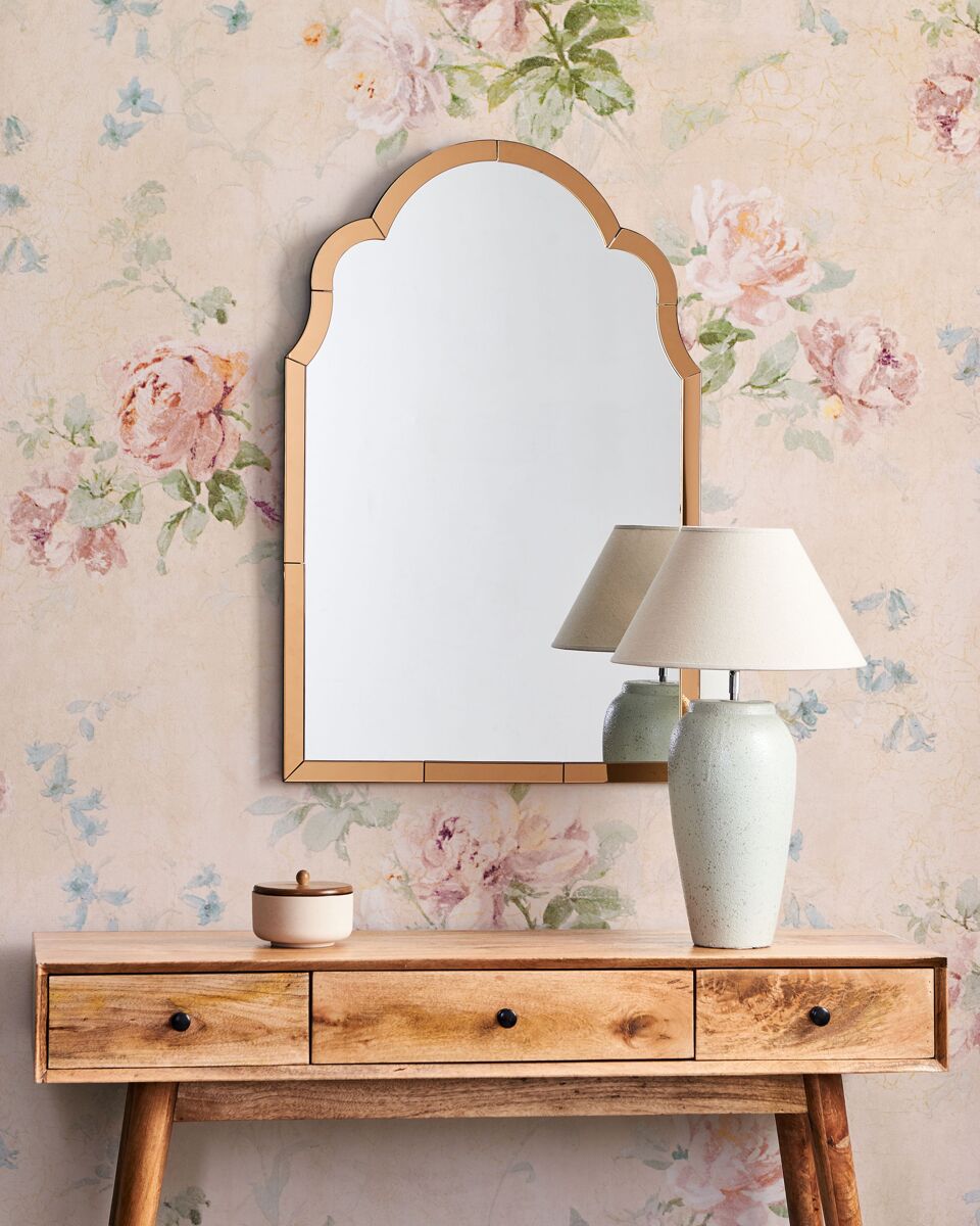 Espejo de pared estilo retro. Este espejo añadirá carácter a cualquier habitación en la que se cuelgue. Diseñado con un marco curvado de estilo retro y tintado con un bonito tono cobrizo, será un funcional elemento decorativo. Con ganchos en la parte posterior, podrás colgarlo fácilmente y decorar tu pared favorita.