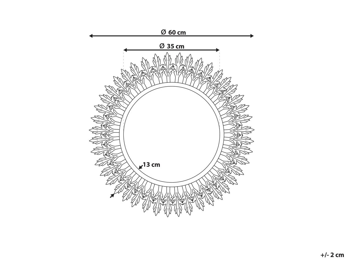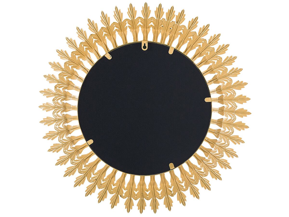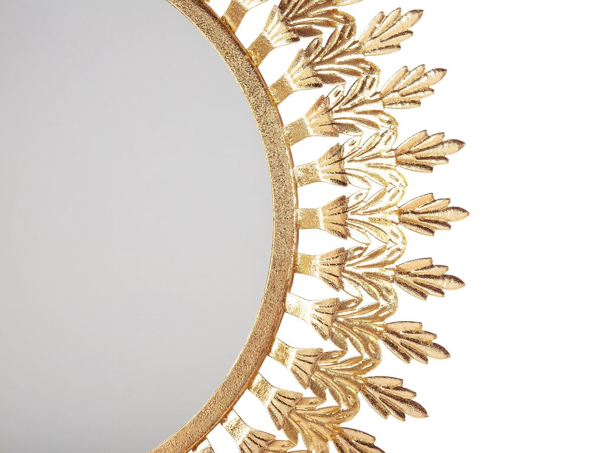 Espejo decorativo en color dorado. Añade funcionalidad y glamour a tu interior con este espejo de pared. Está fabricado a partir de metal de alta calidad. El patrón decorativo en el marco llama poderosamente la atención. Combina bien en cualquier espacio de estilo moderno.