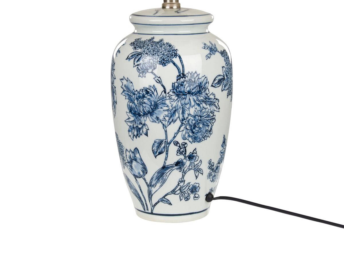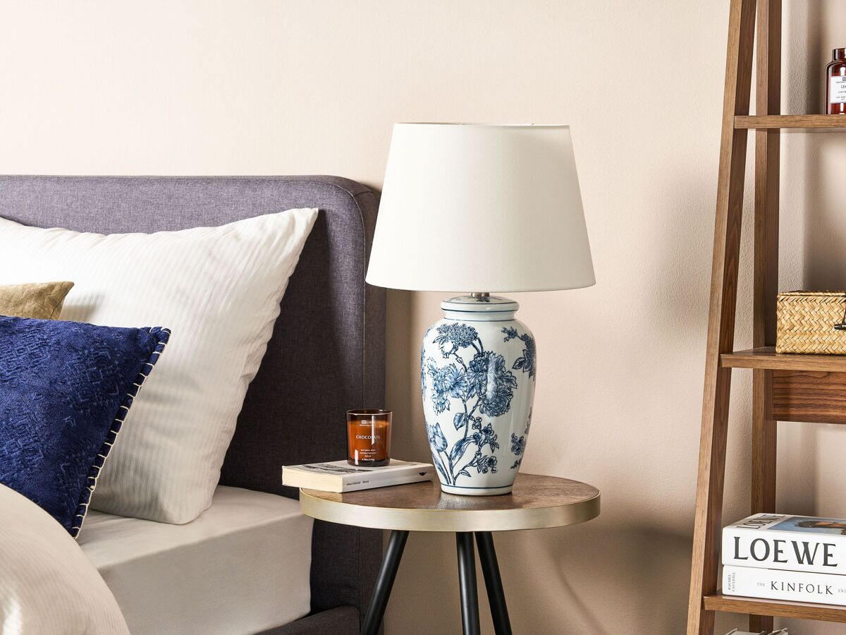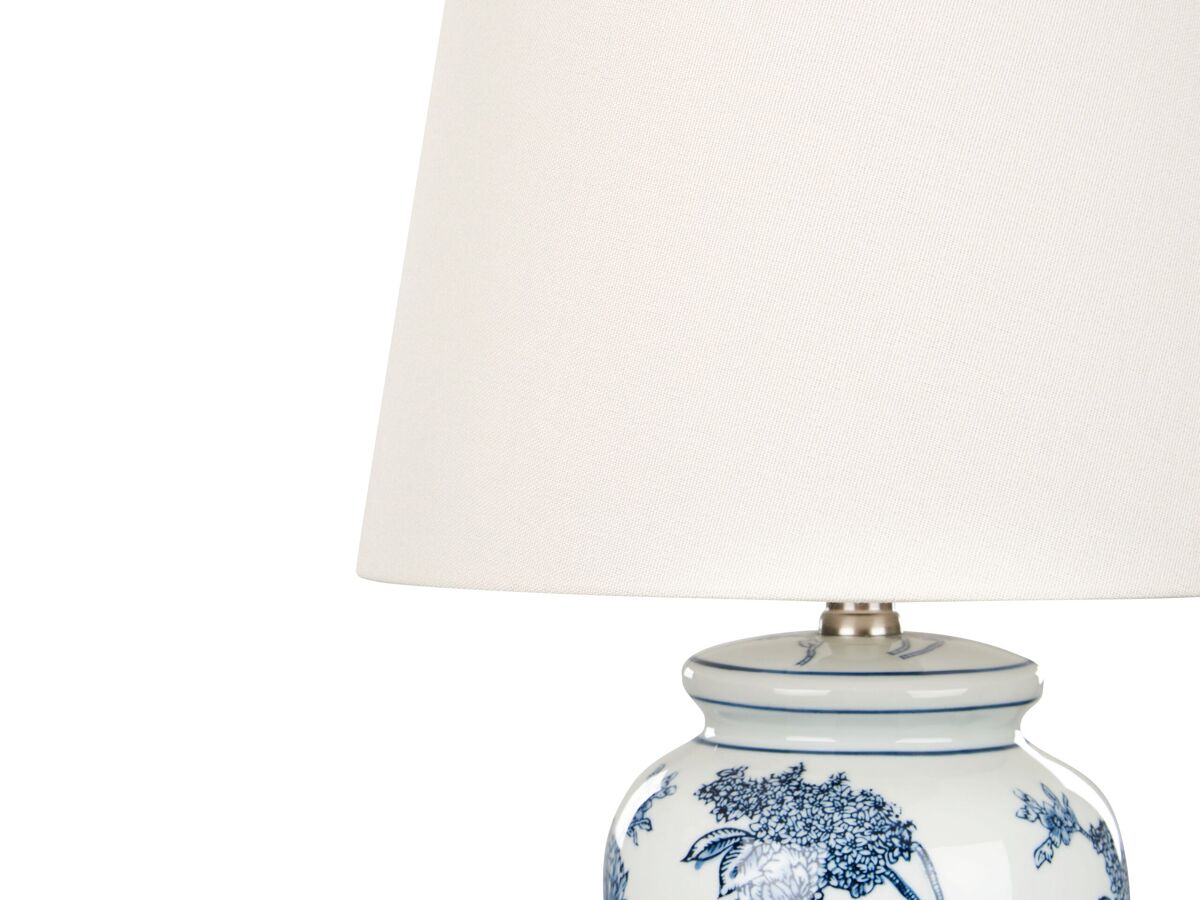 Lámpara con motivos decorativos. Alegra tu hogar con esta lámpara de sobremesa con un bonito acabado pintado a mano. Tiene una base de porcelana y una pantalla de tela de lino, lo que la convierte en un gran complemento para interiores de cualquier estilo decorativo. Elegante y práctica, también es fácil de mantener a diario.