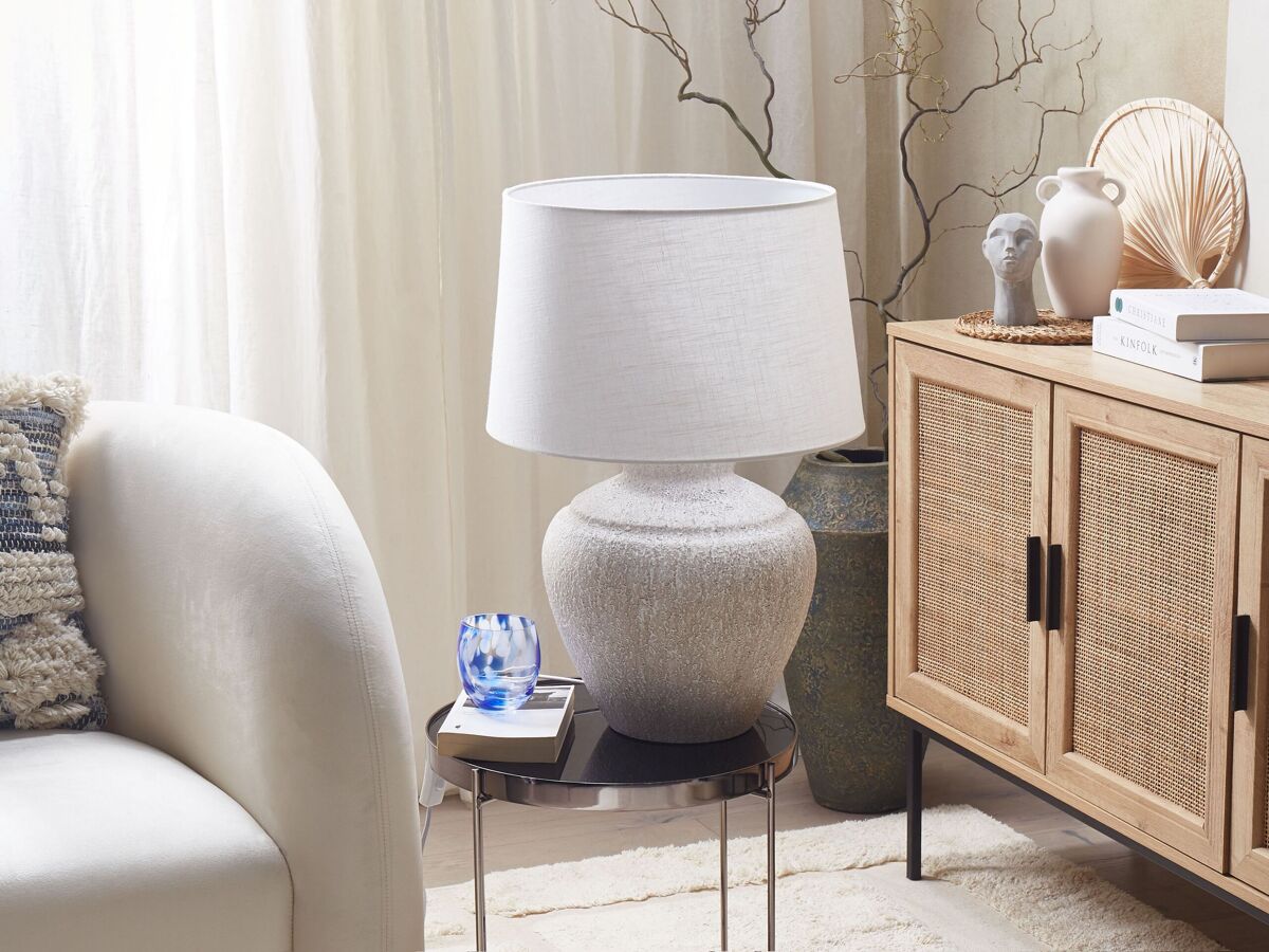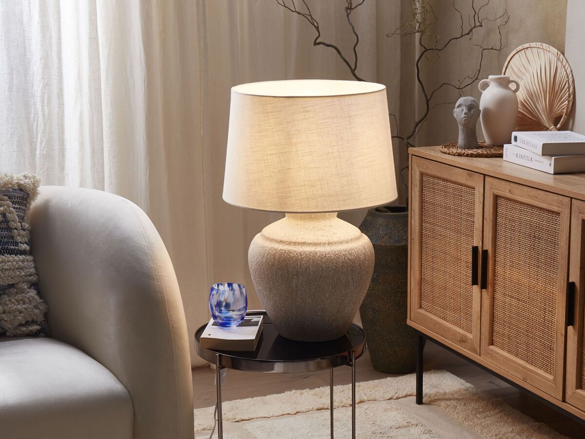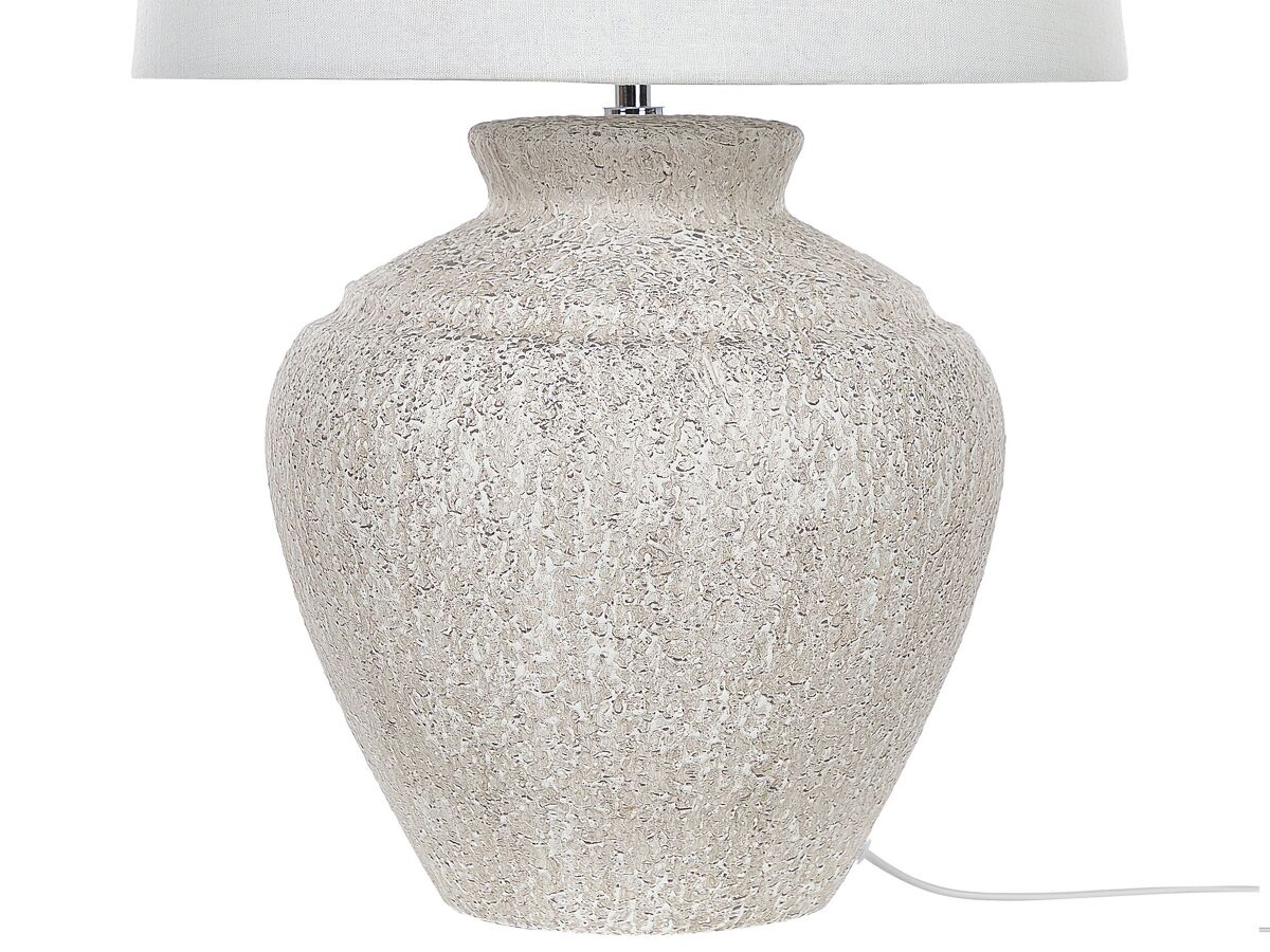 Lámpara de sobremesa con base efecto piedra. Ilumina tu interior con esta lámpara de mesa de diseño tradicional. Está fabricada a partir de cerámica duradera y de alta calidad. La base similar a una piedra aporta una cierta singularidad. La pantalla de tela está elaborada a mano. Combina bien con cualquier estilo de interior.