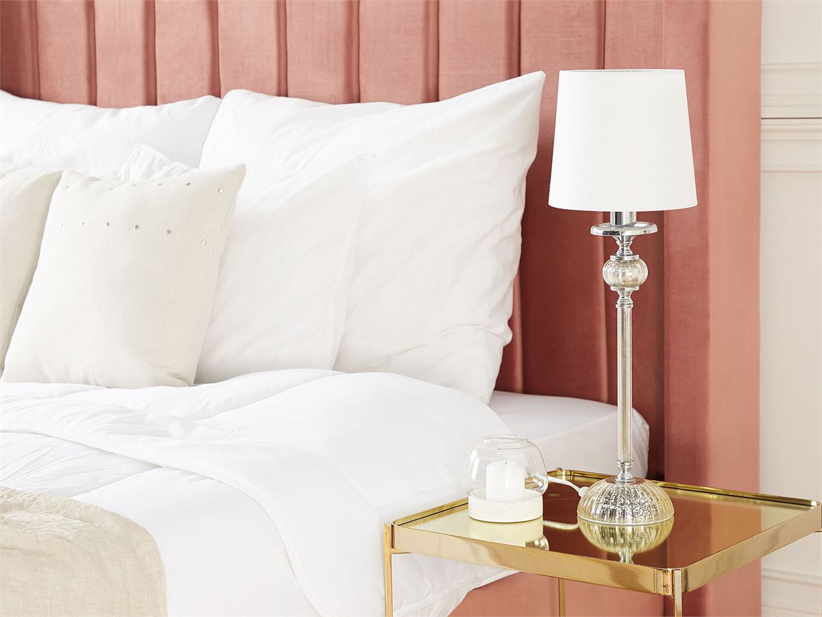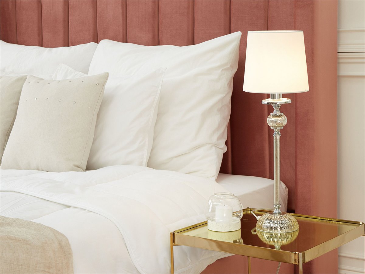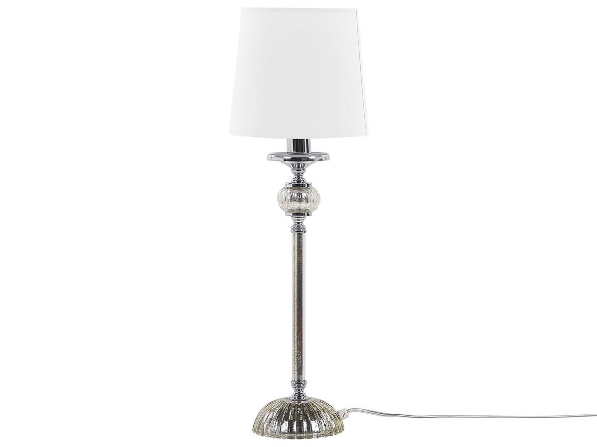 Lámpara de sobremesa glamurosa. Esta lámpara de mesa de diseño vintage combina bien en cualquier sala de estar o dormitorio moderno o glamuroso. Está fabricada a partir de metal y vidrio de alta calidad. Las tallas en la base aportan un toque clásico al diseño. La pantalla difunde una luz cálida y brillante.