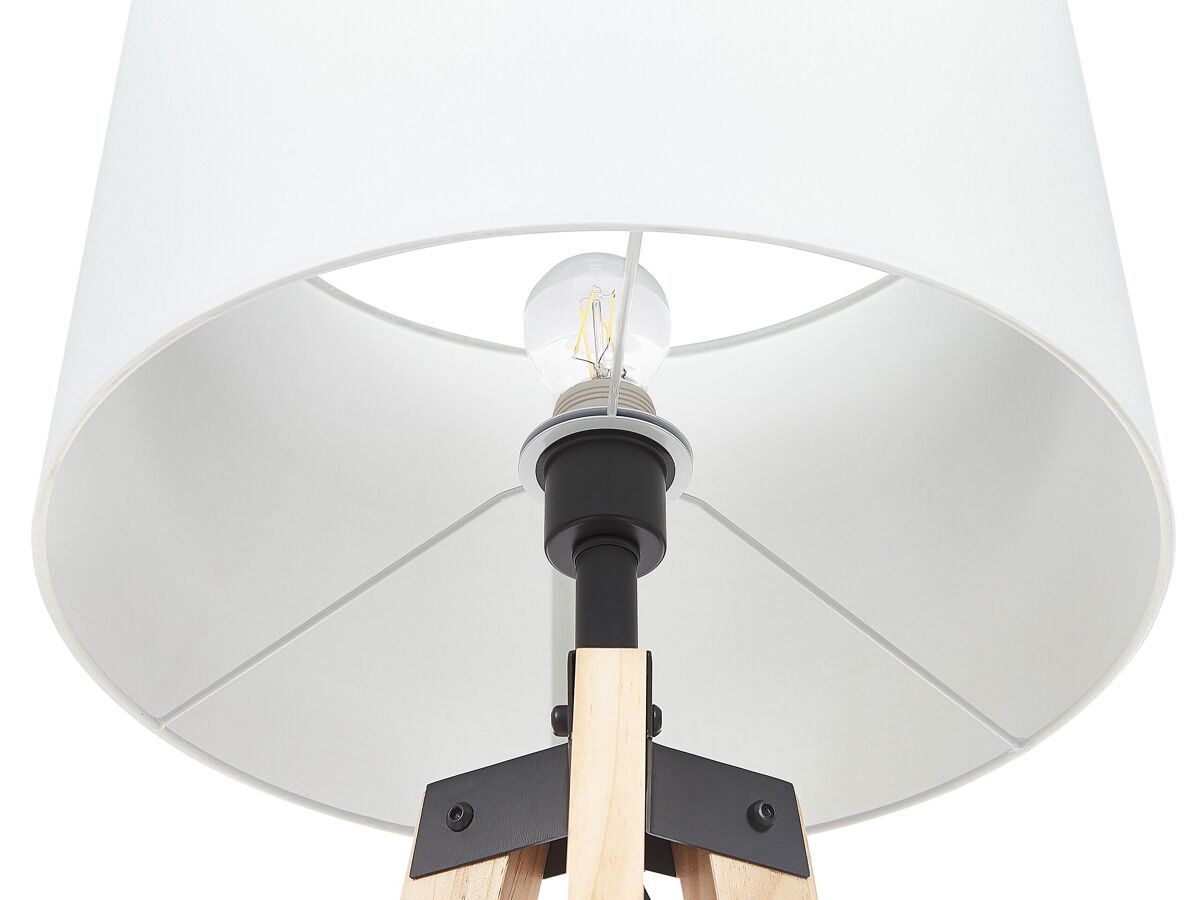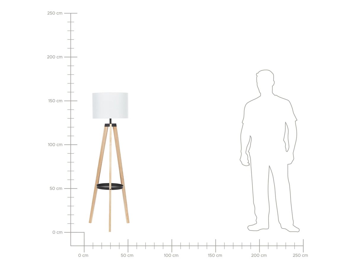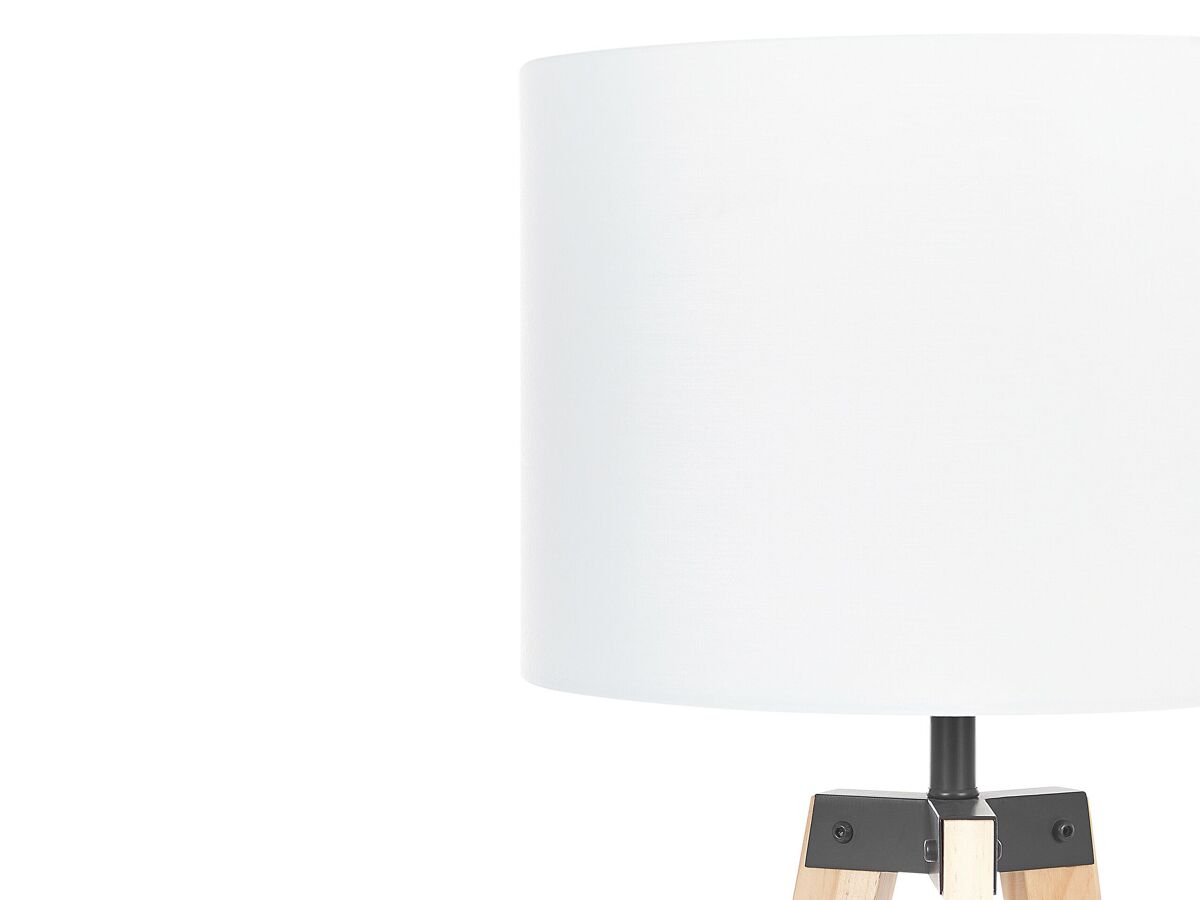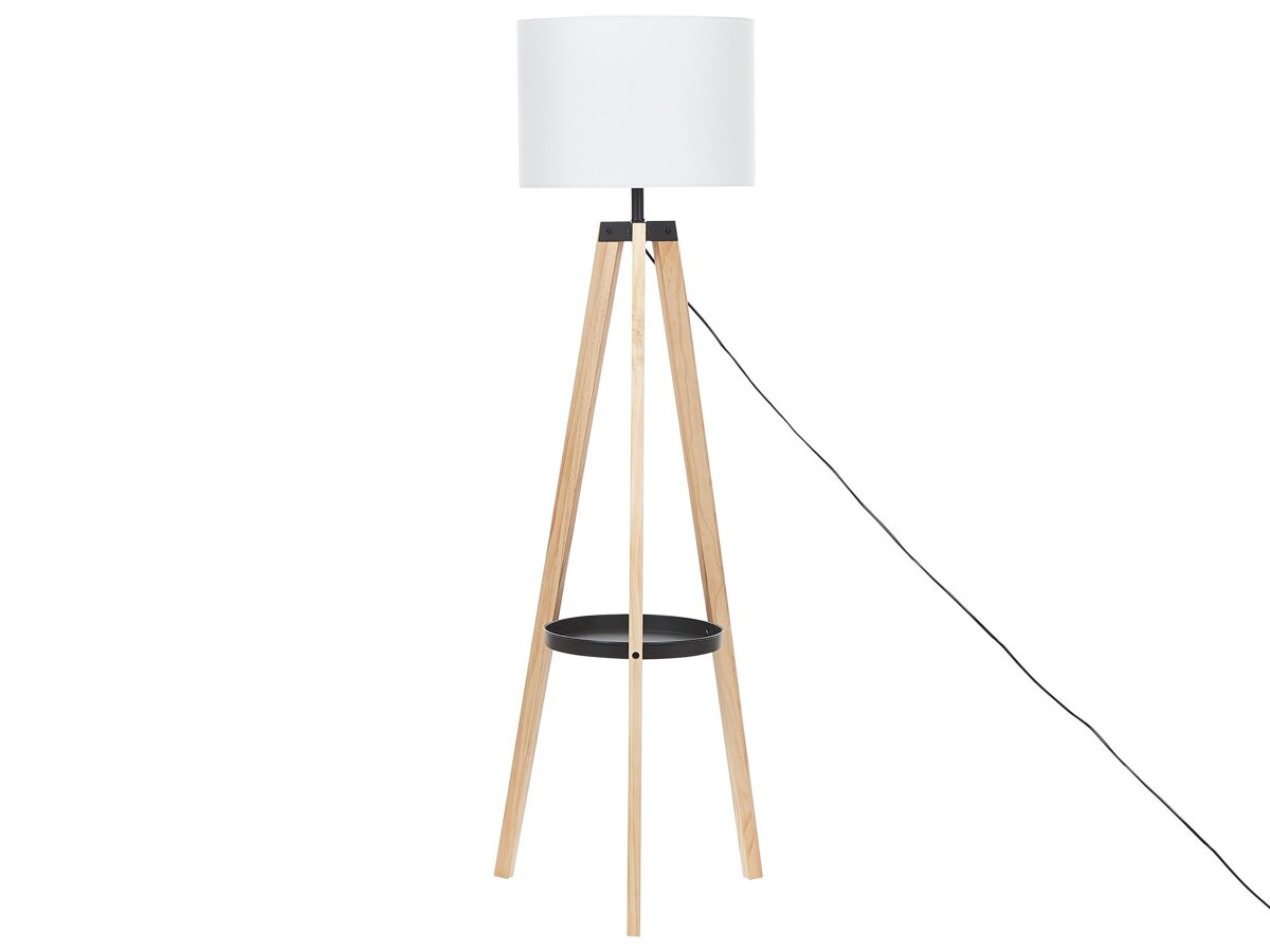 Lámpara de diseño moderno. Esta lámpara de pie sobre un trípode de madera aporta un toque de elegancia a cualquier interior. La balda situada en la parte central llama la atención. La pantalla de tela permite el paso de una luz suave y cálida.